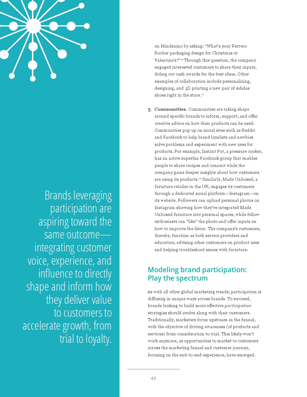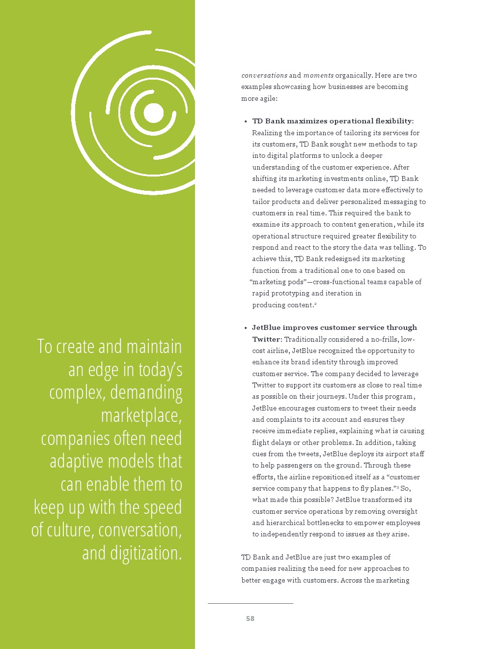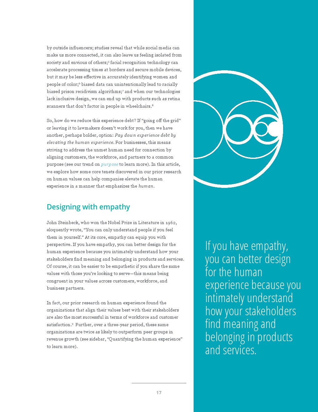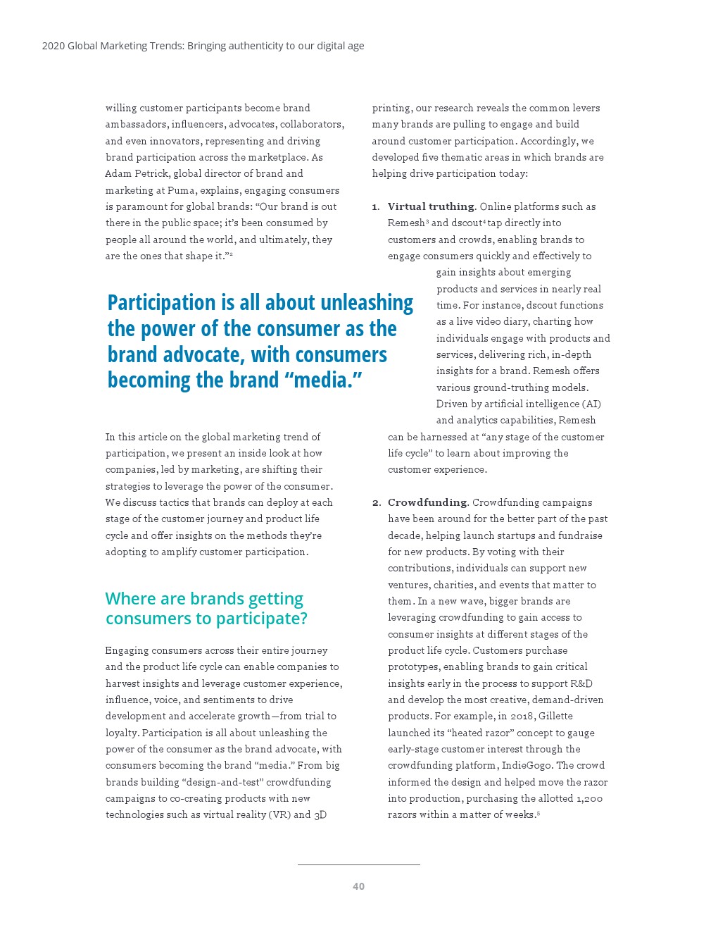 目标和人类体验将其他五个趋势结合在一起:融合、信任、参与、人才和敏捷性。融合强调了目标和体验如何共同指导品牌选择与大型开放生态系统合作。品牌必须在这些生态系统之间建立信任,才能真正完成以目标为导向的工作。