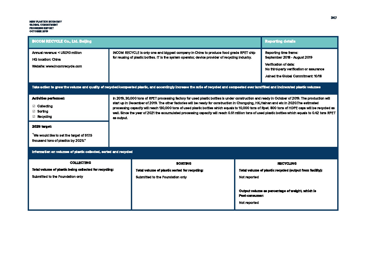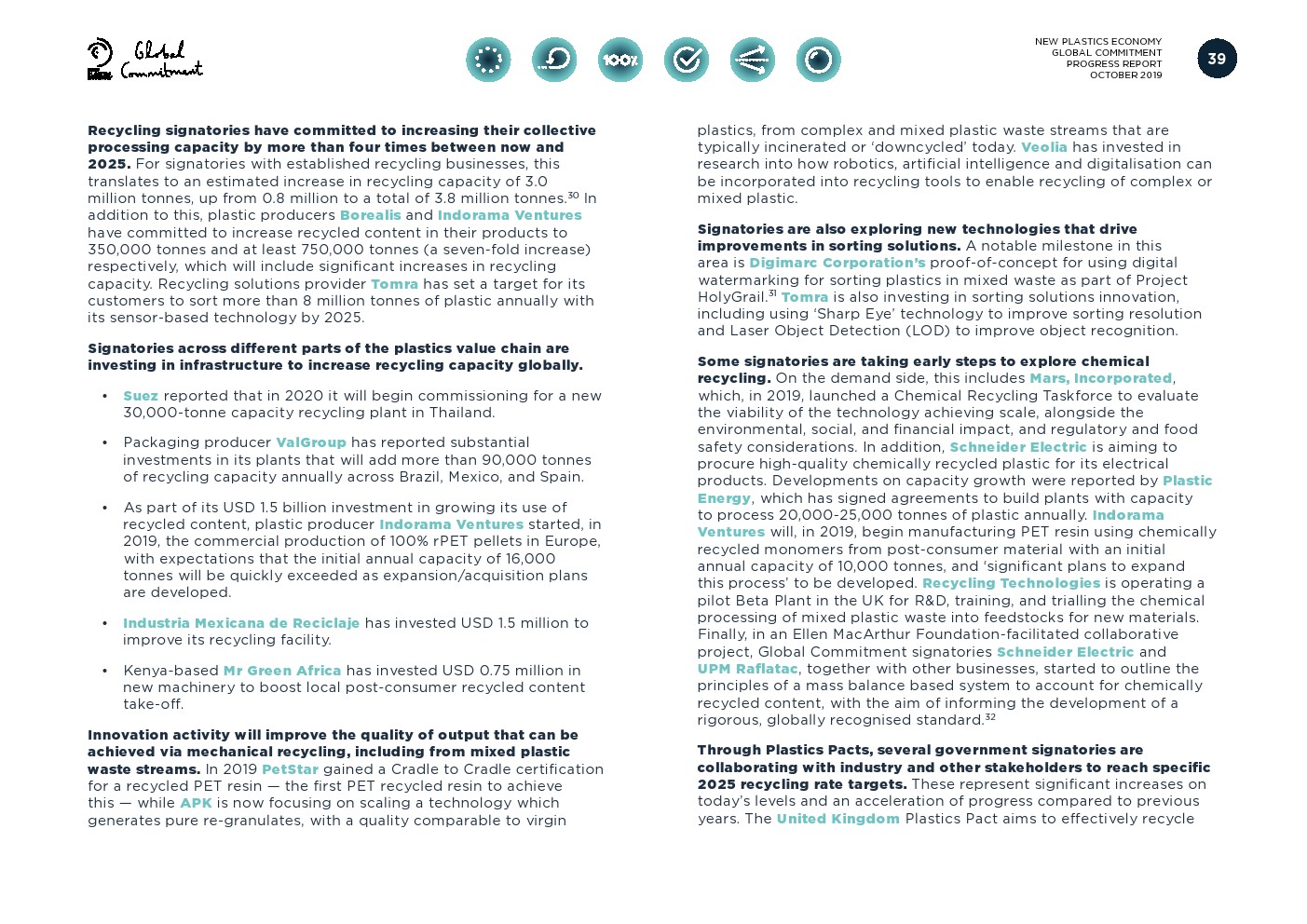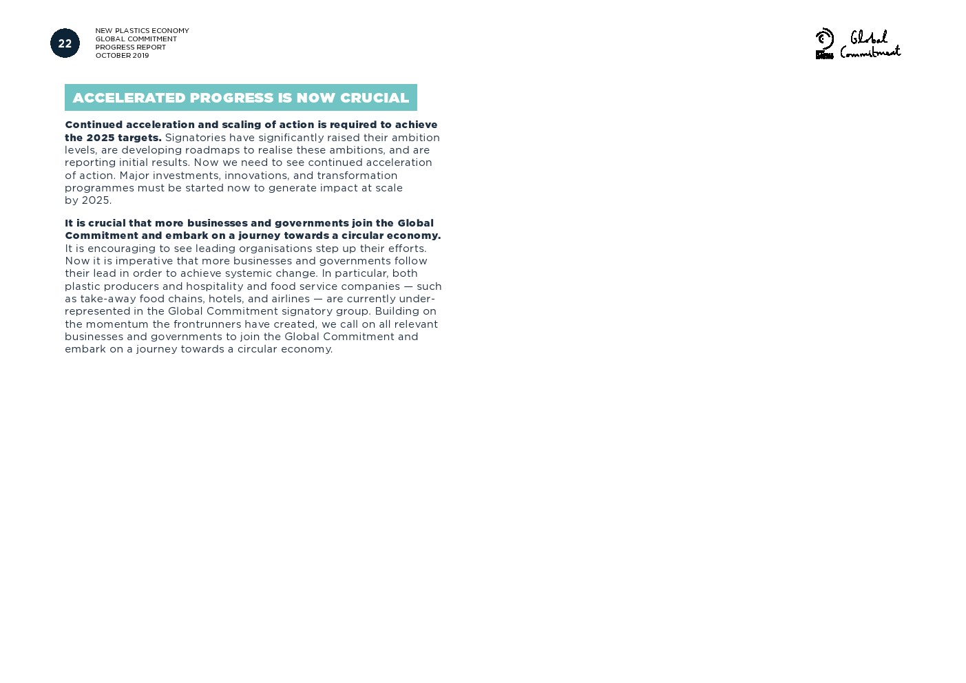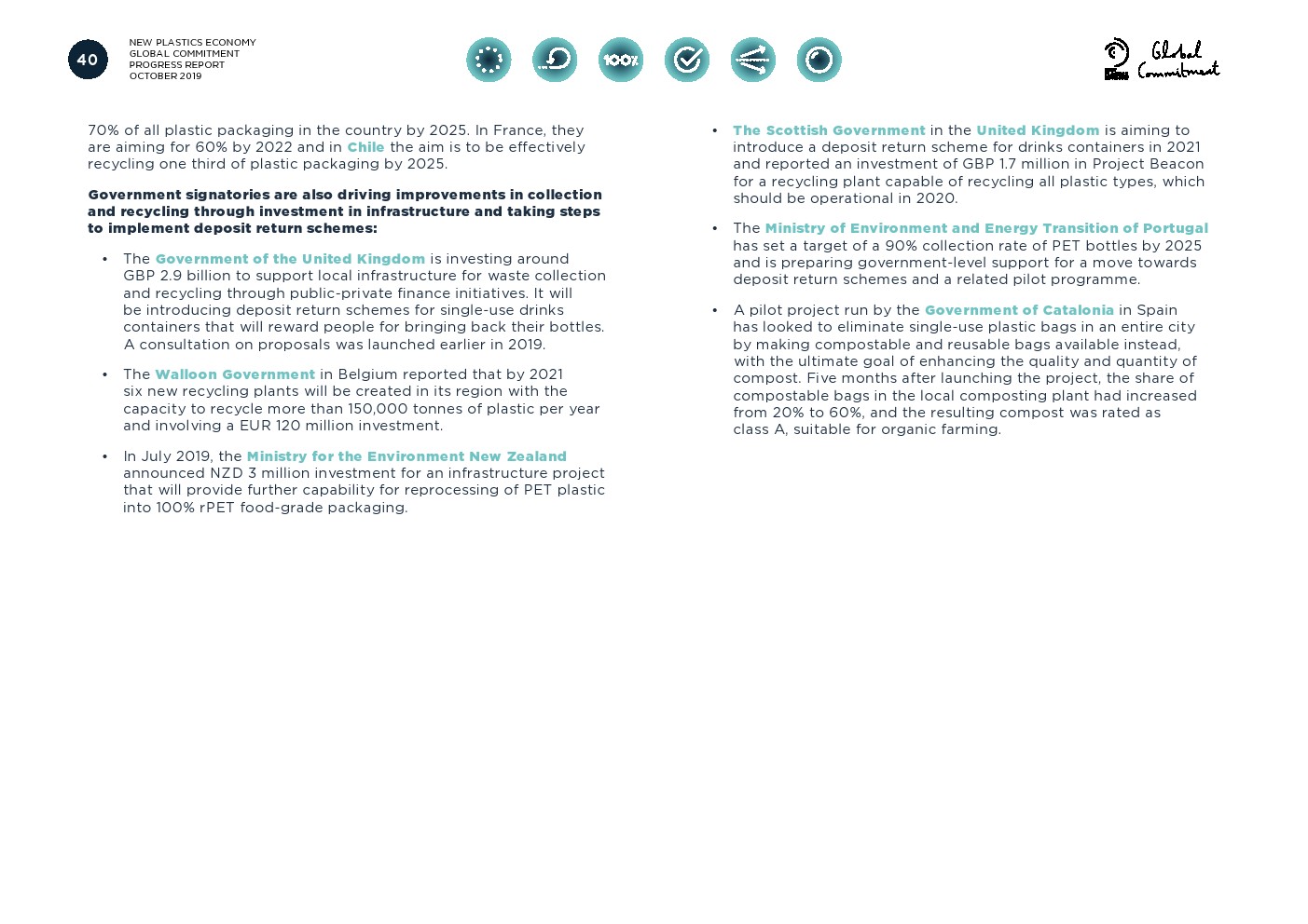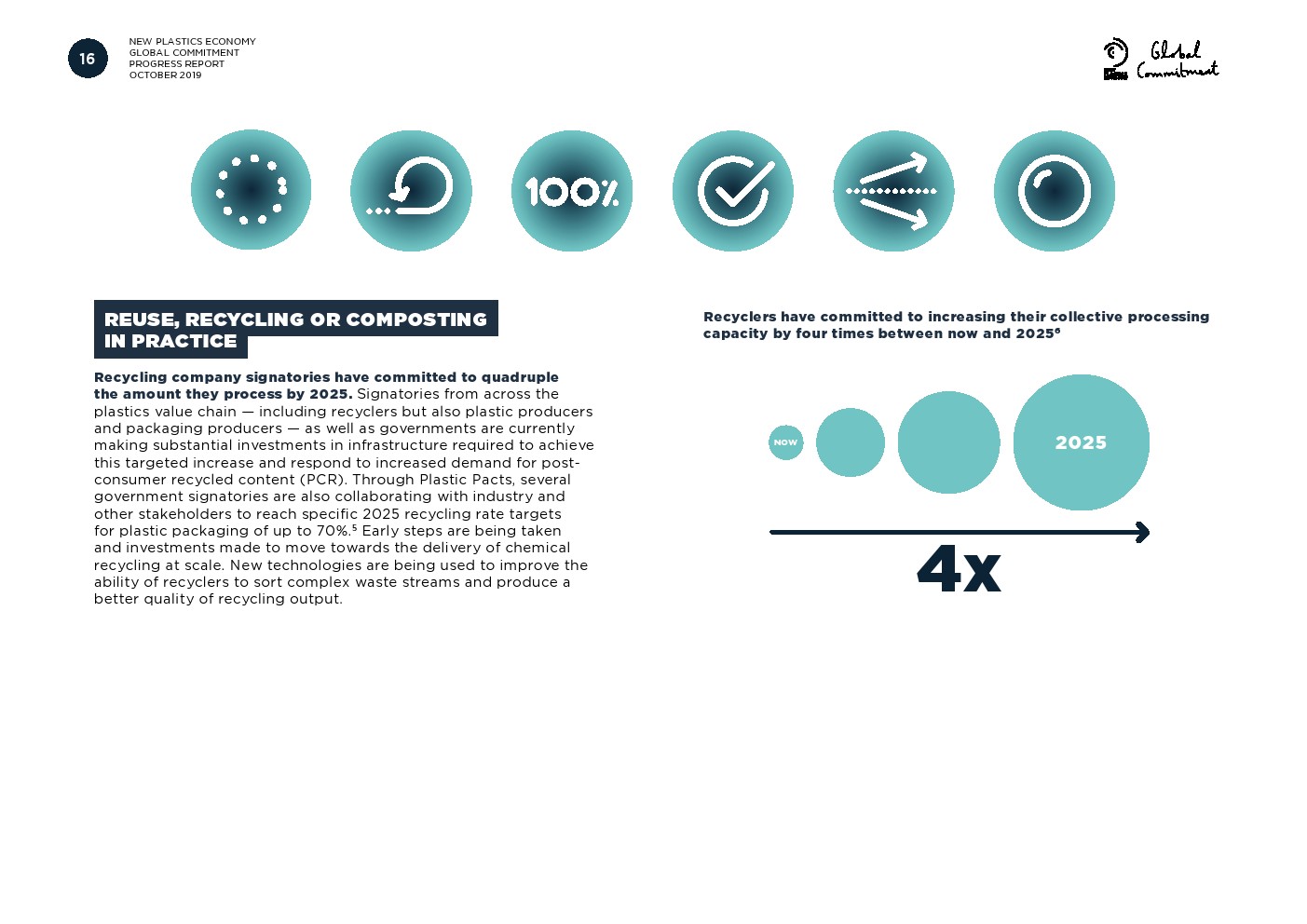 签署承诺的回收公司承诺到2025年将废塑料处理量翻两番。政府签约方还与行业和其他利益相关方合作,以实现2025年塑料包装回收率达到70%。