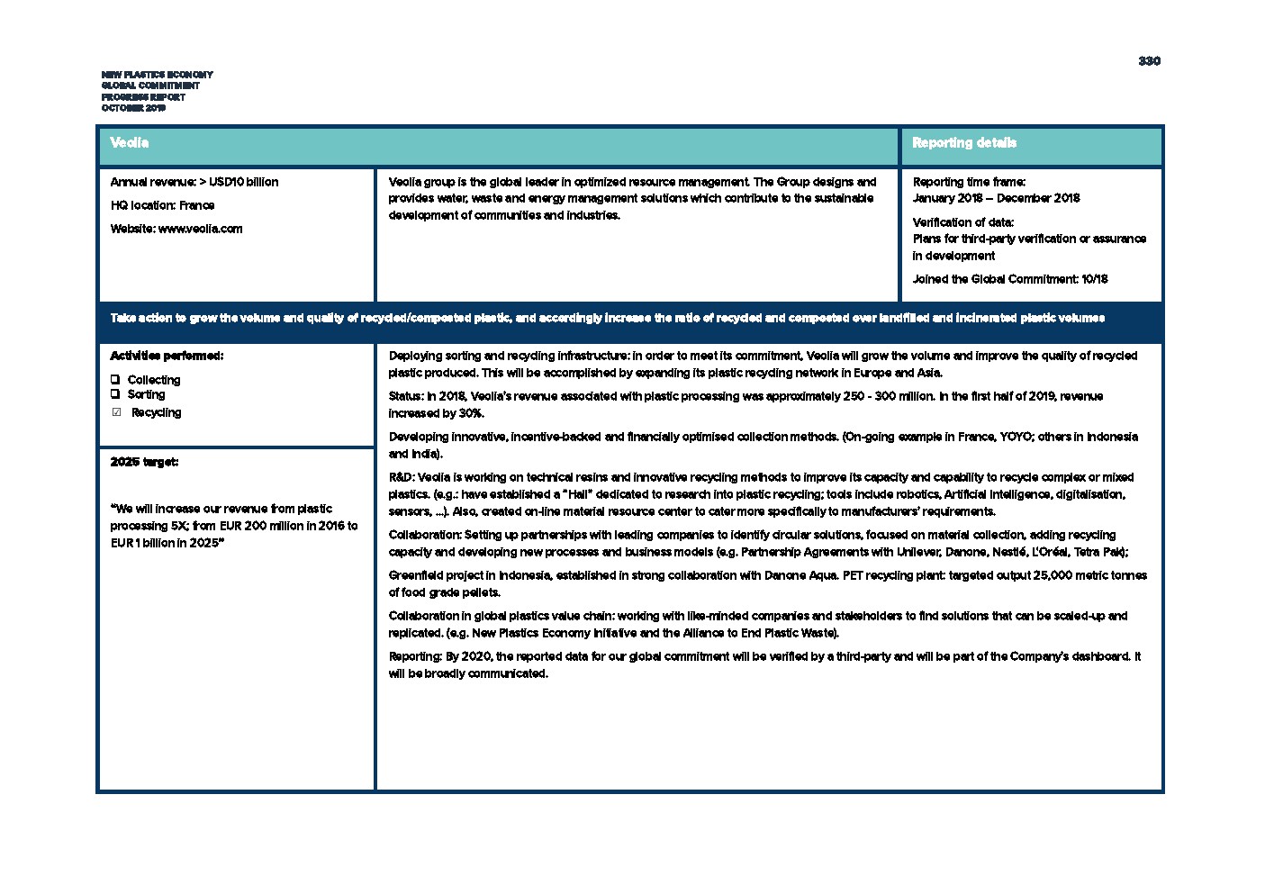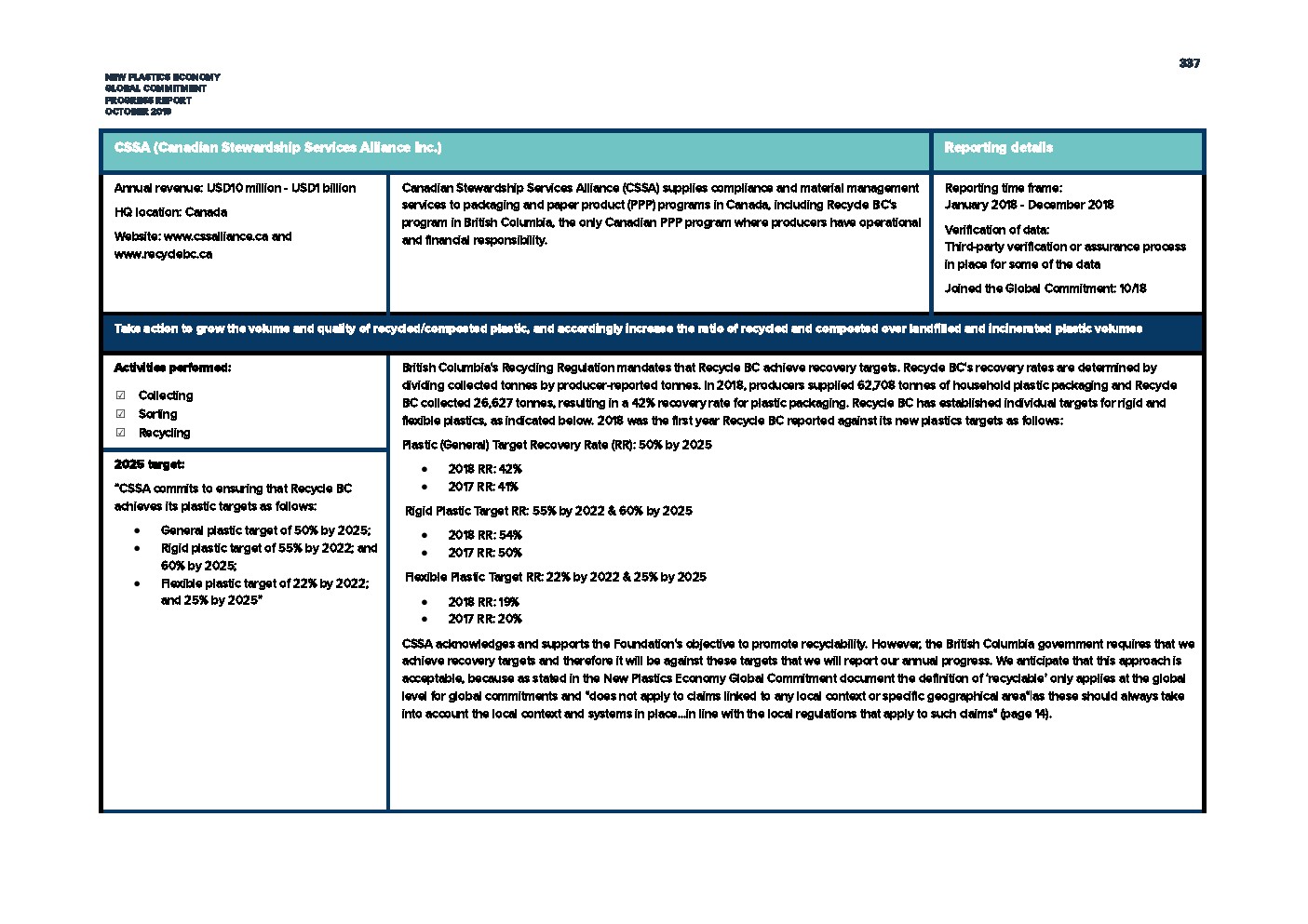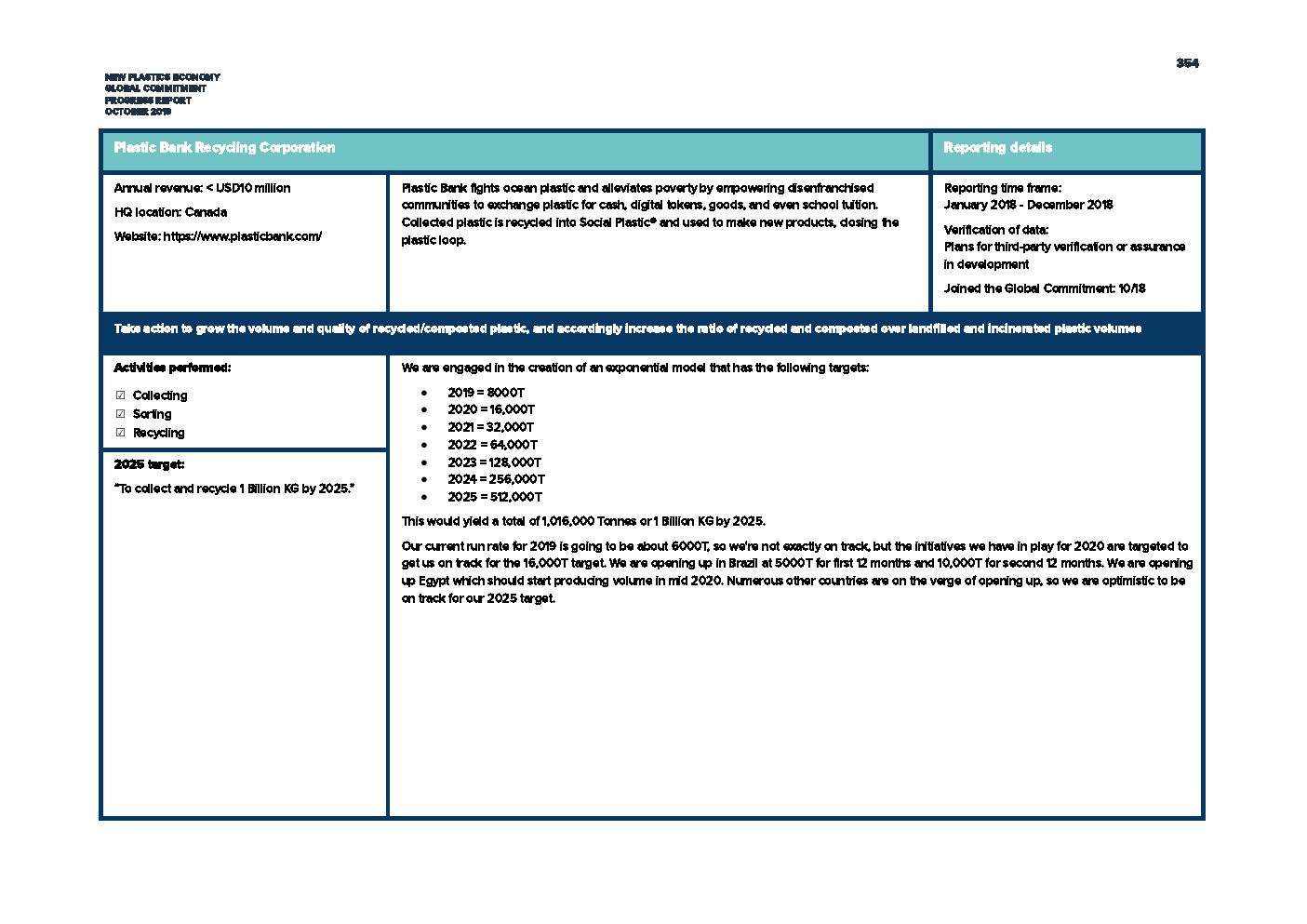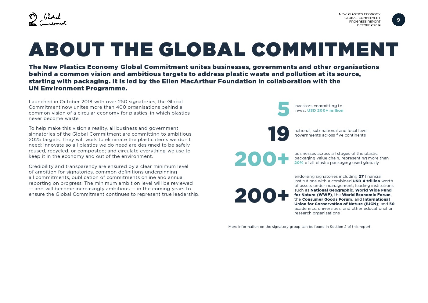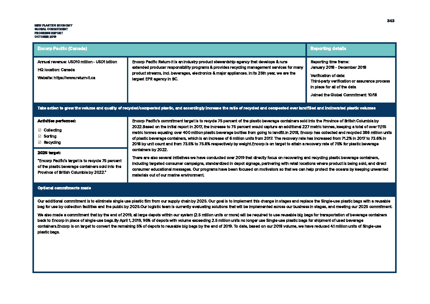 签署承诺的回收公司承诺到2025年将废塑料处理量翻两番。政府签约方还与行业和其他利益相关方合作,以实现2025年塑料包装回收率达到70%。
