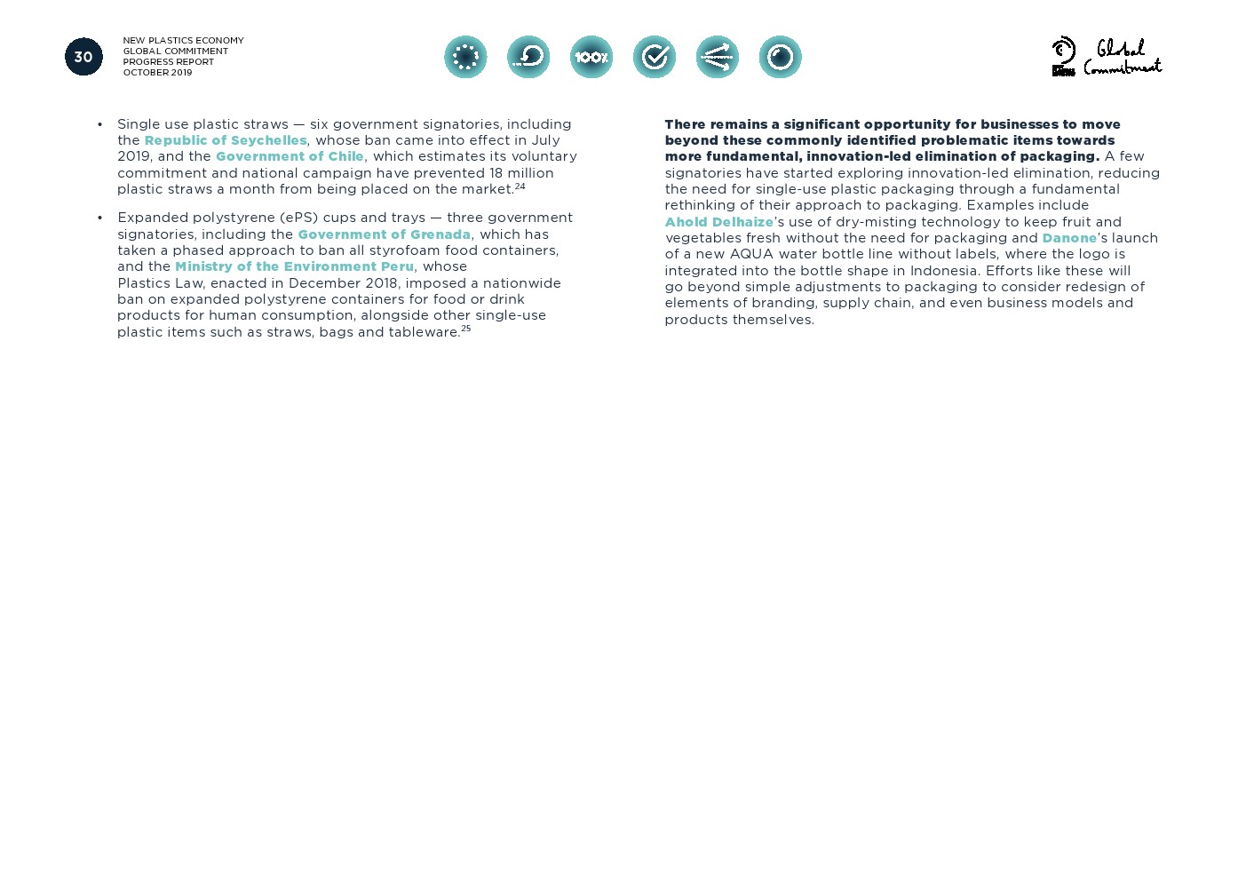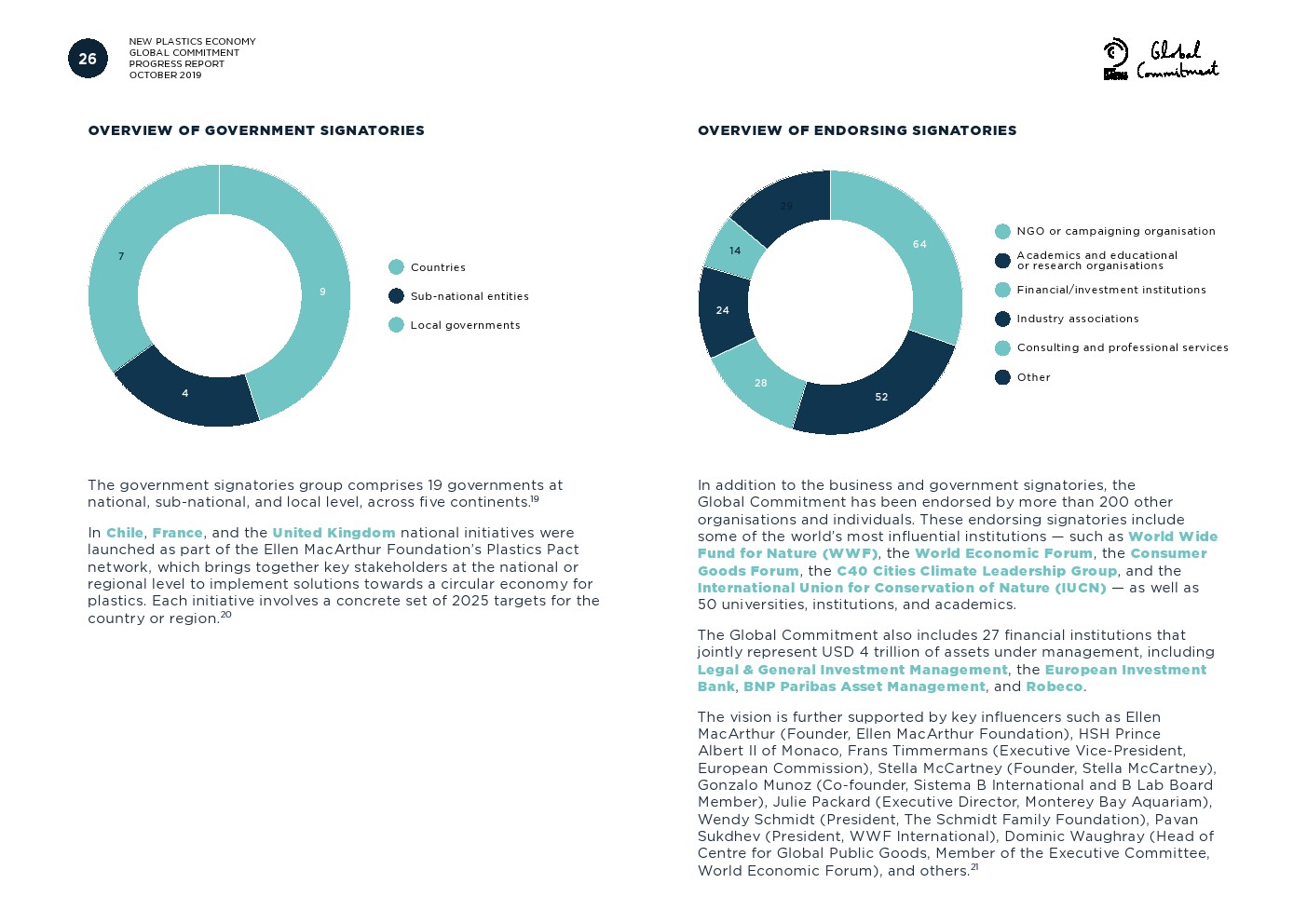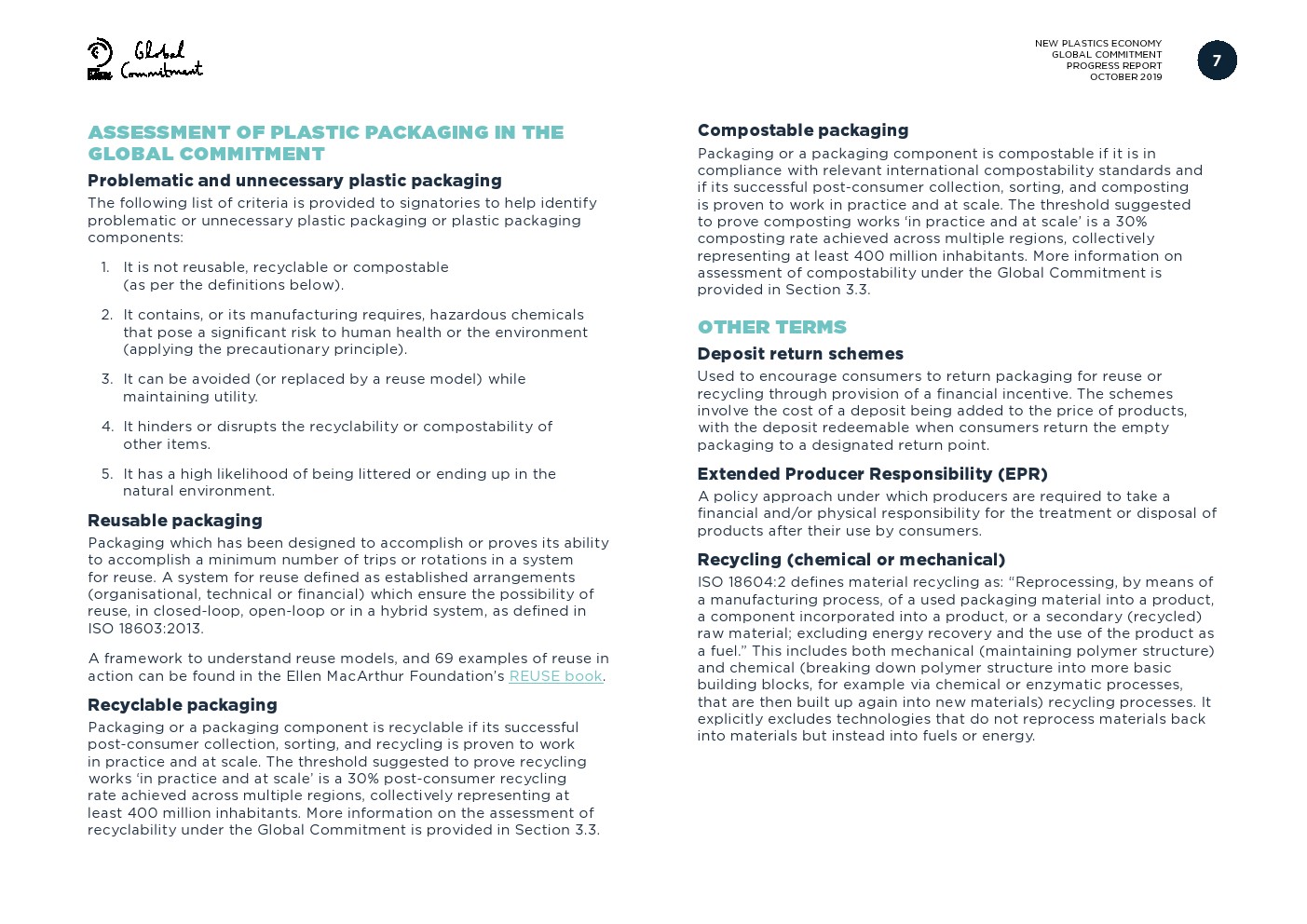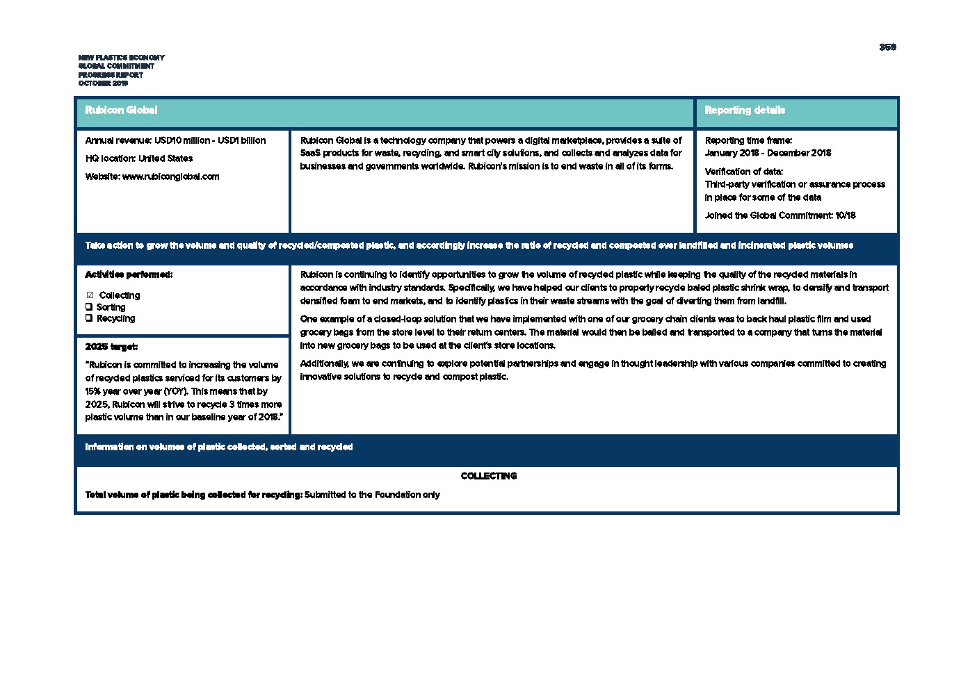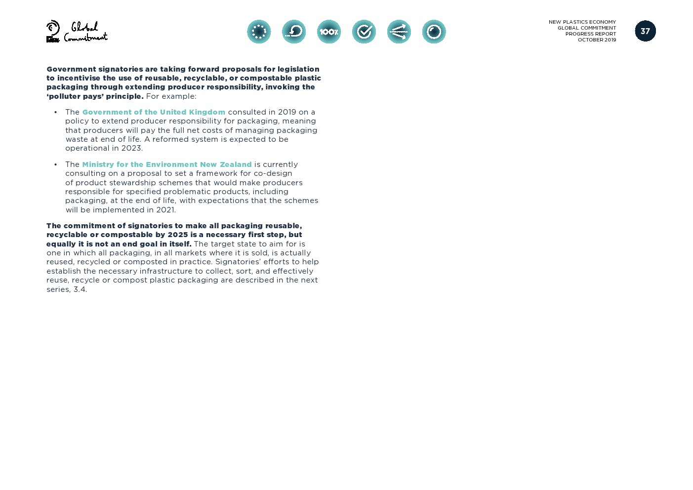 签署承诺的回收公司承诺到2025年将废塑料处理量翻两番。政府签约方还与行业和其他利益相关方合作,以实现2025年塑料包装回收率达到70%。