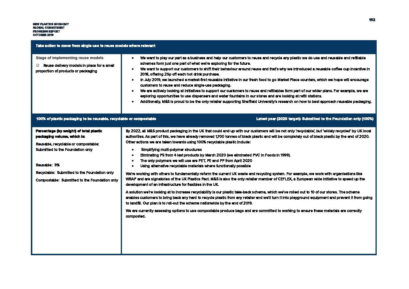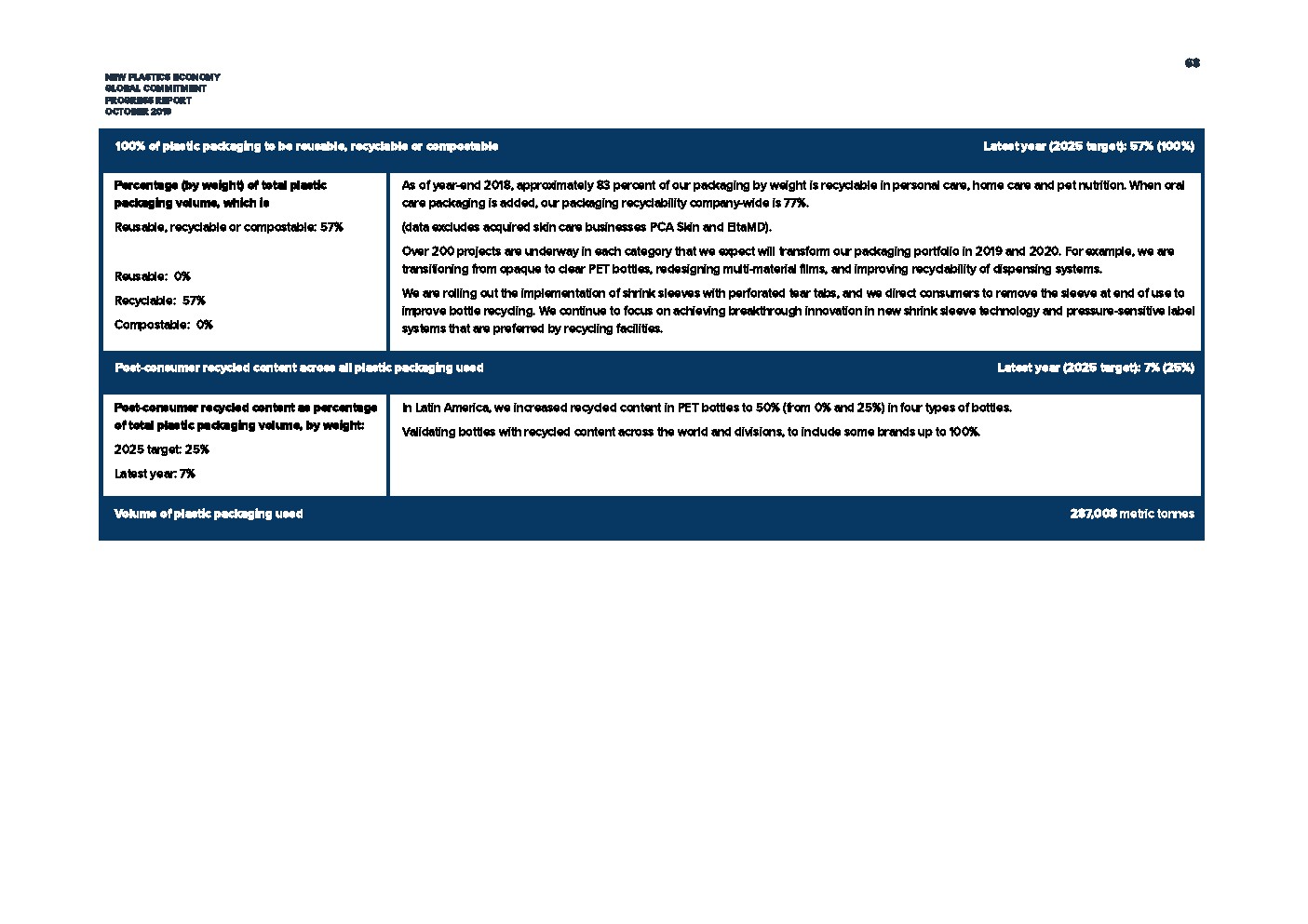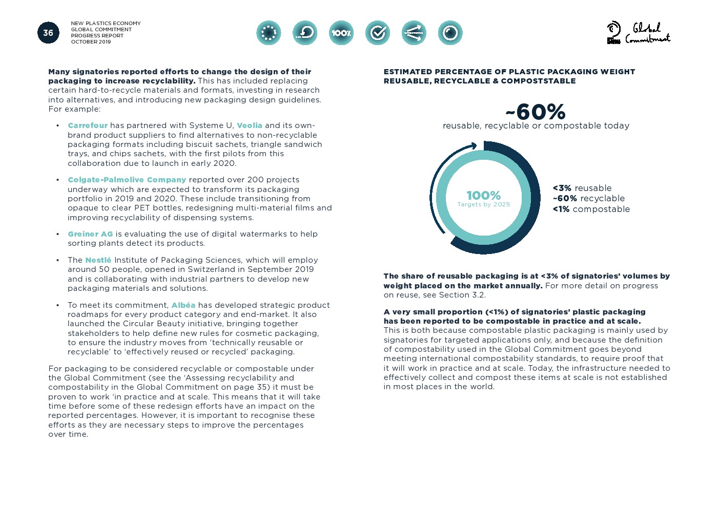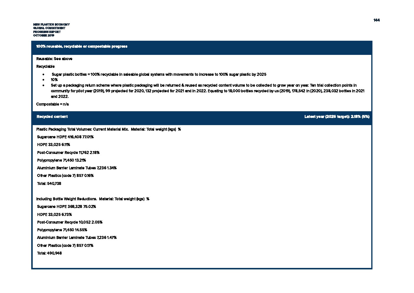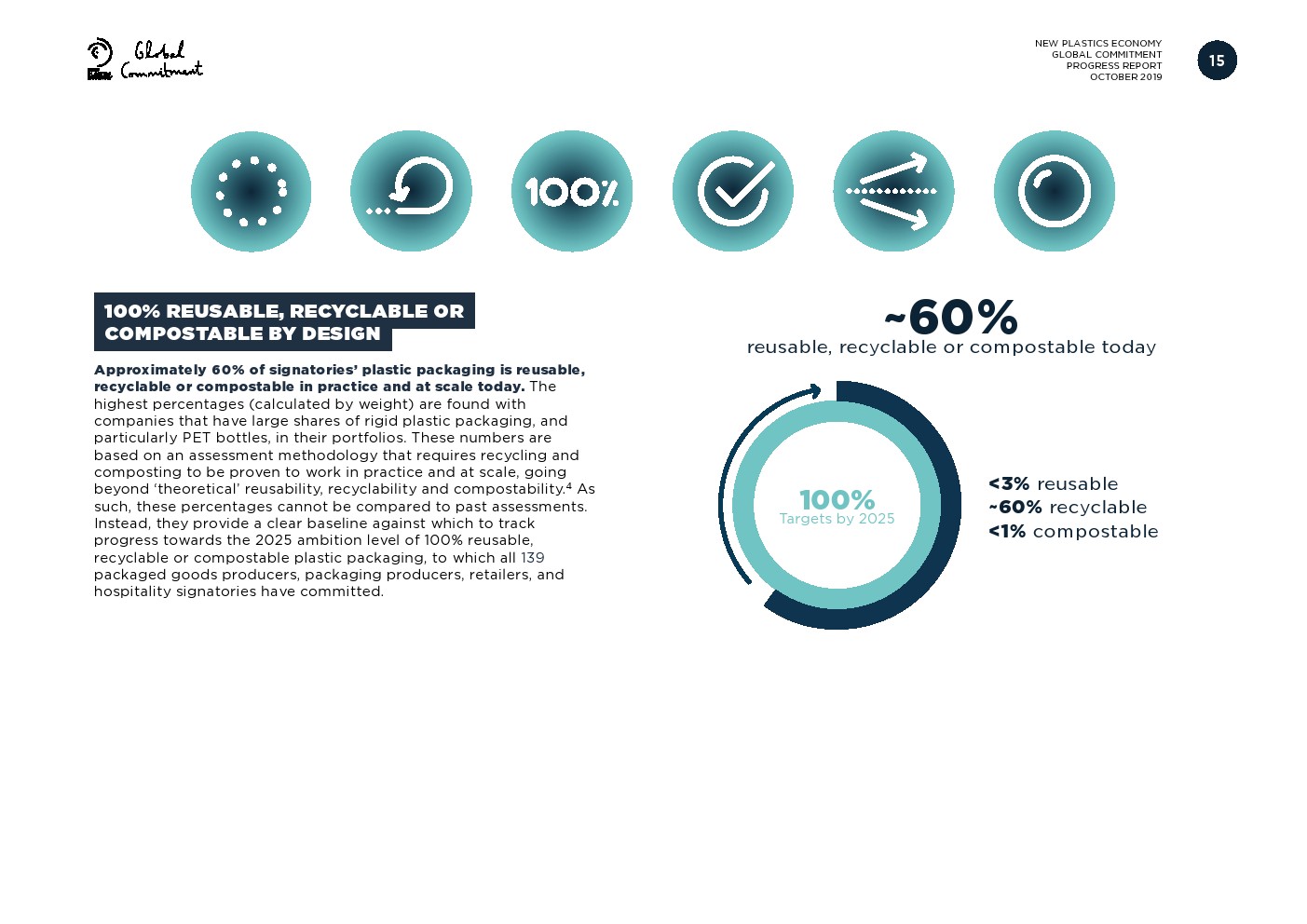 目前,60%的塑料包装是可重复使用、可回收或堆肥的。承诺计划在2025年实现100%可重复使用、可循环再造或可堆肥塑料包装。