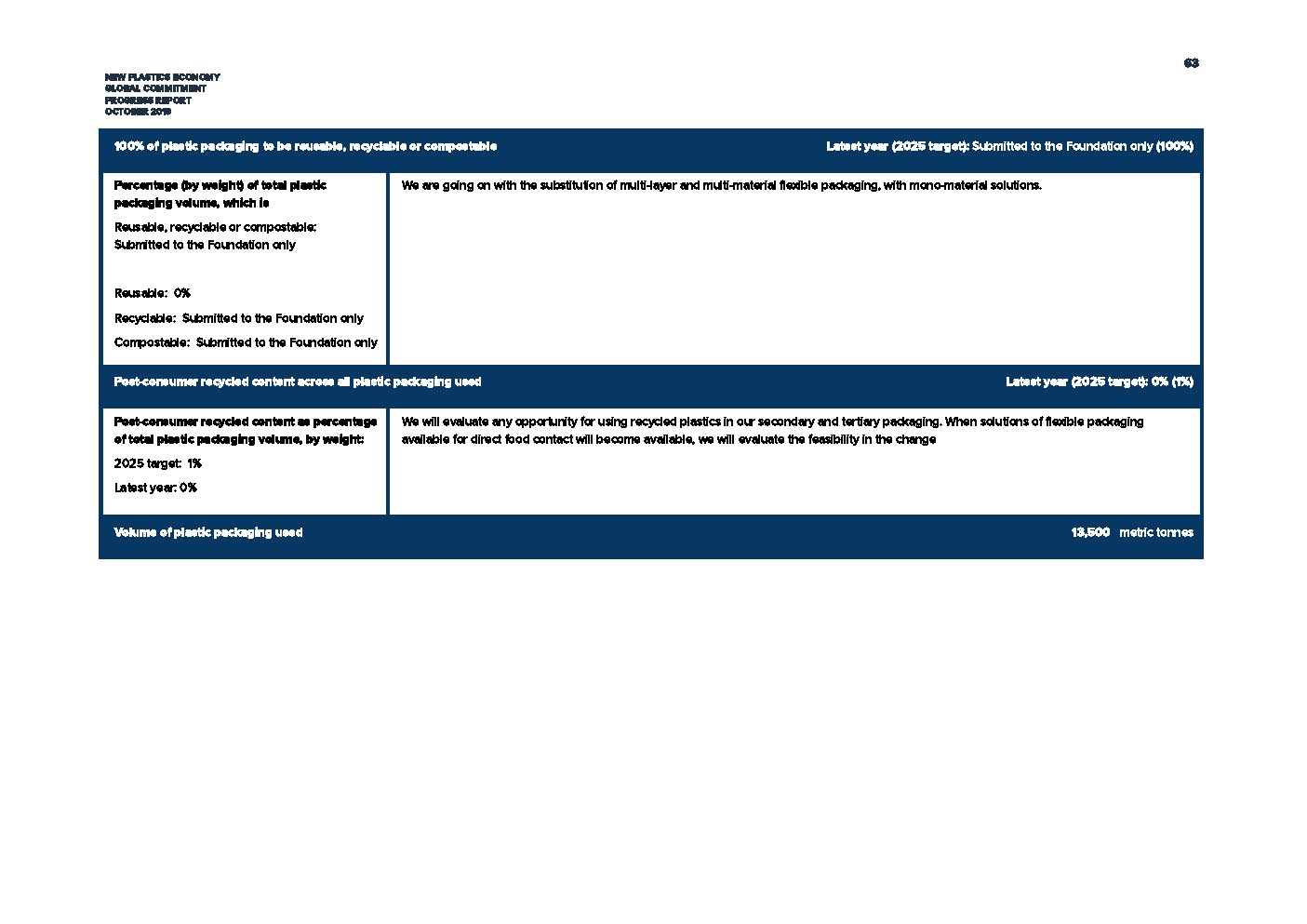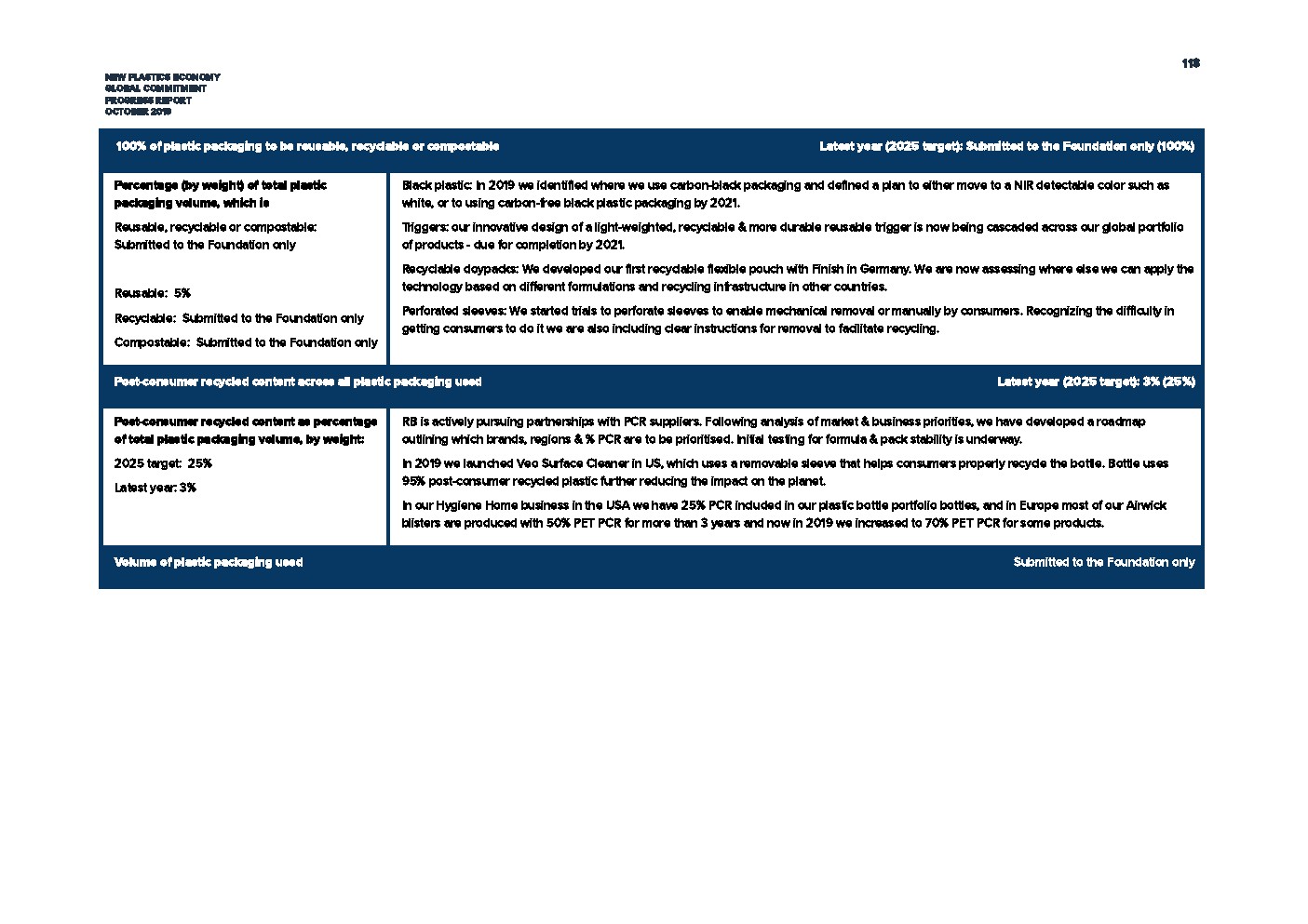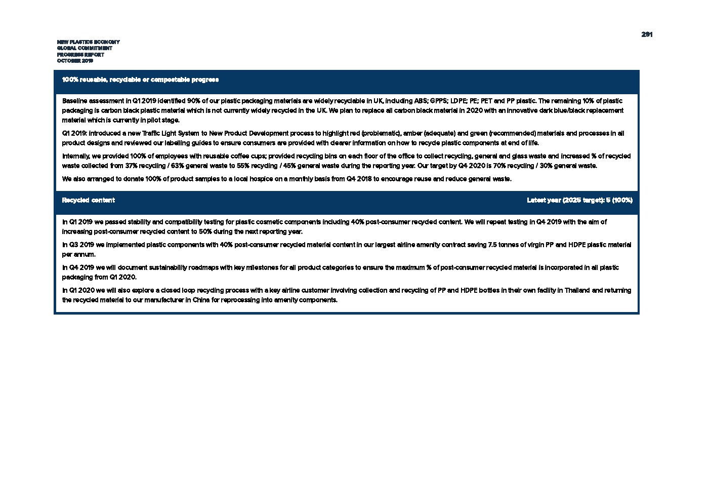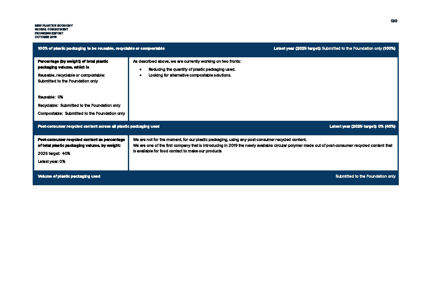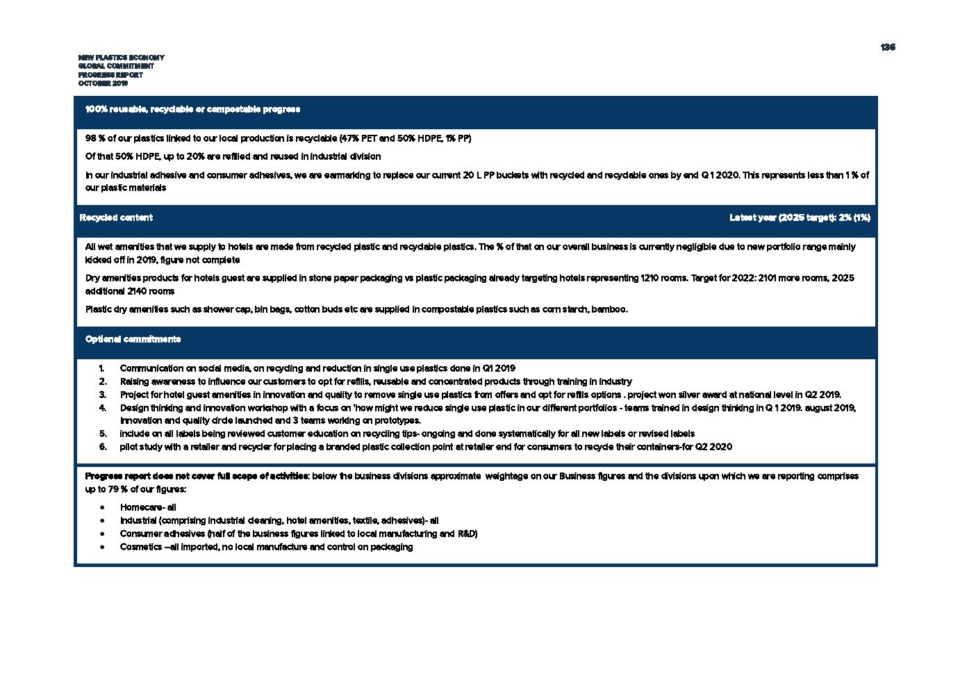 目前,60%的塑料包装是可重复使用、可回收或堆肥的。承诺计划在2025年实现100%可重复使用、可循环再造或可堆肥塑料包装。