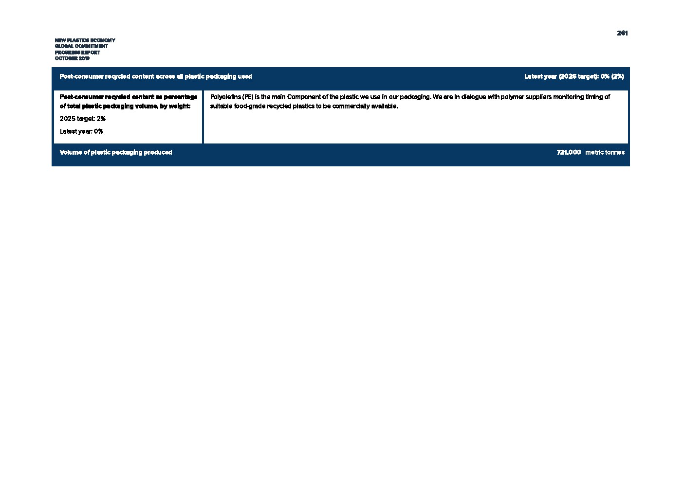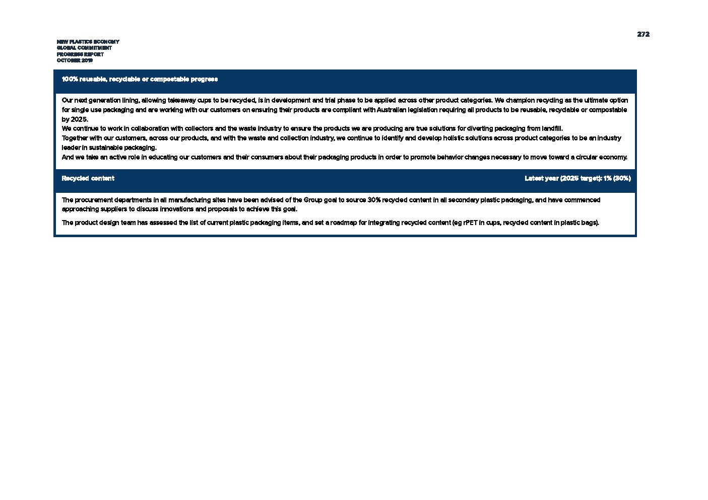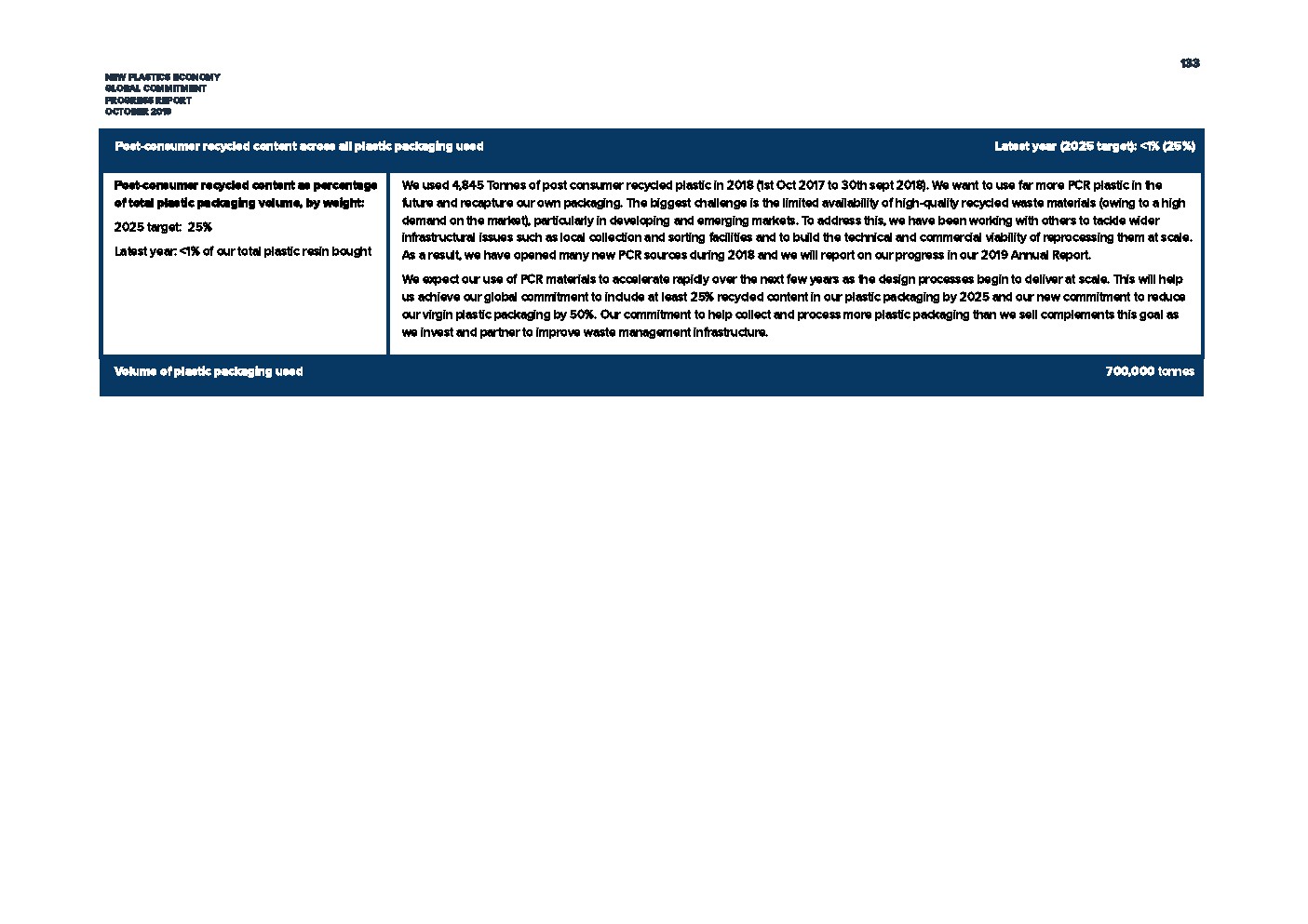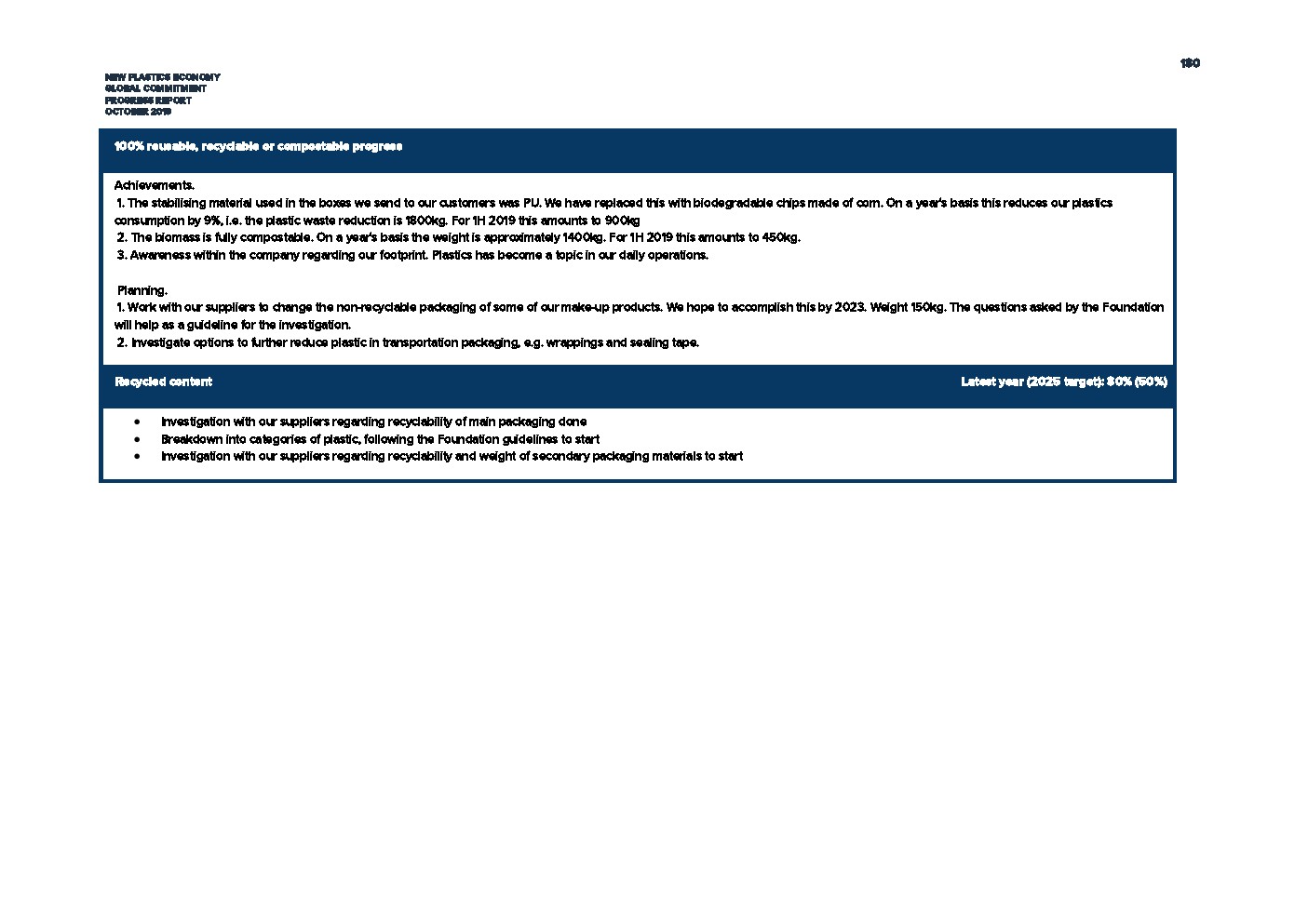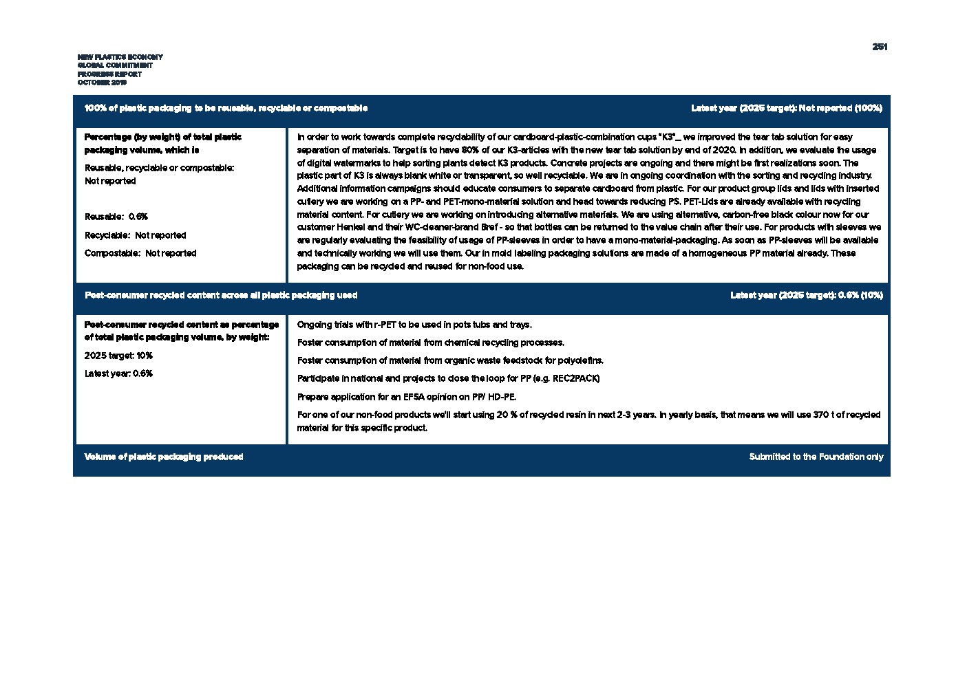 目前,60%的塑料包装是可重复使用、可回收或堆肥的。承诺计划在2025年实现100%可重复使用、可循环再造或可堆肥塑料包装。