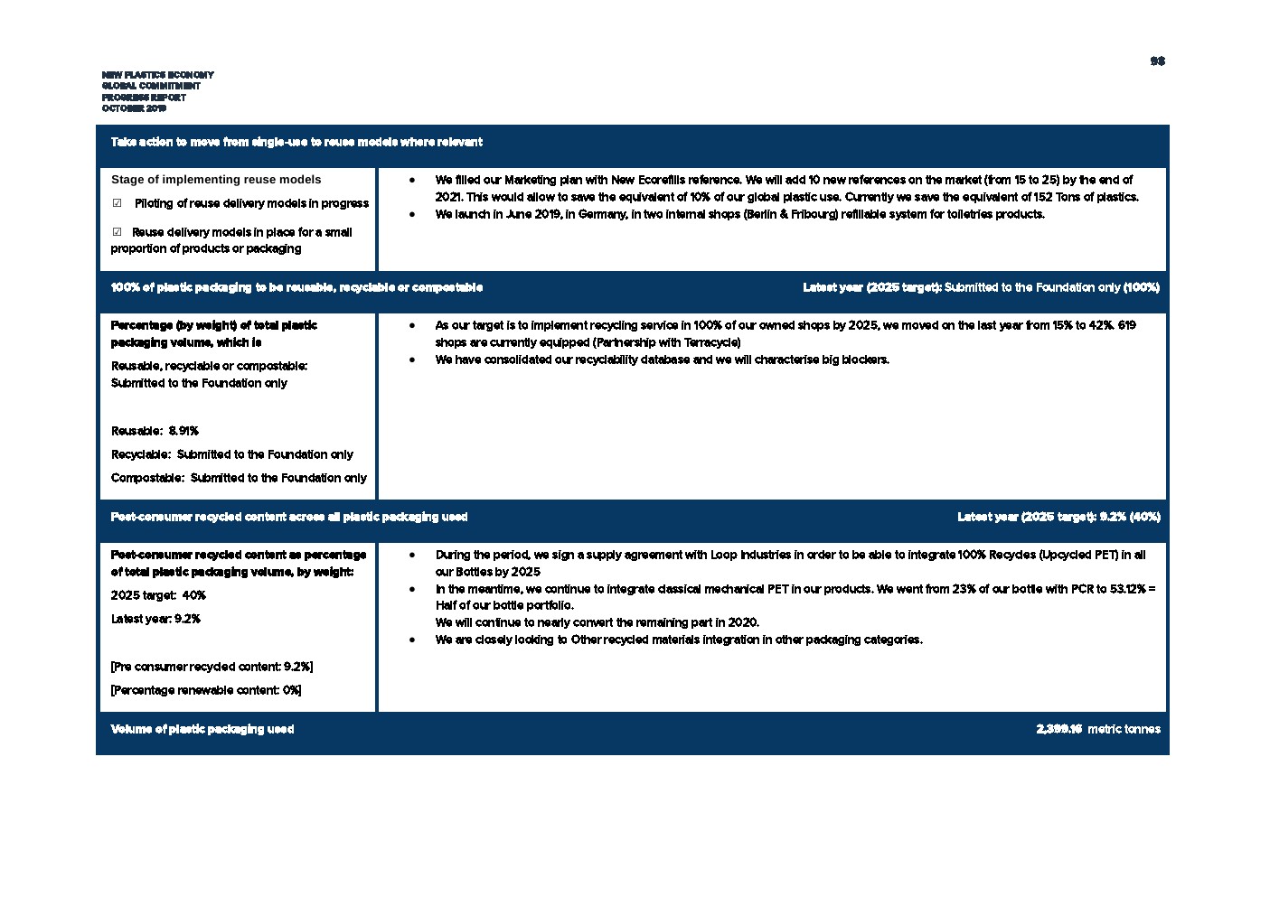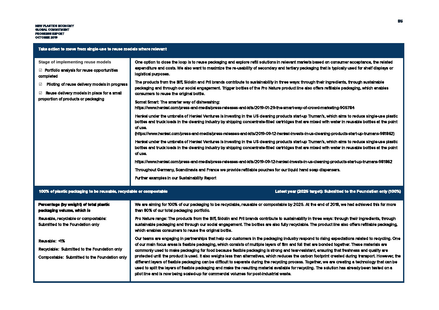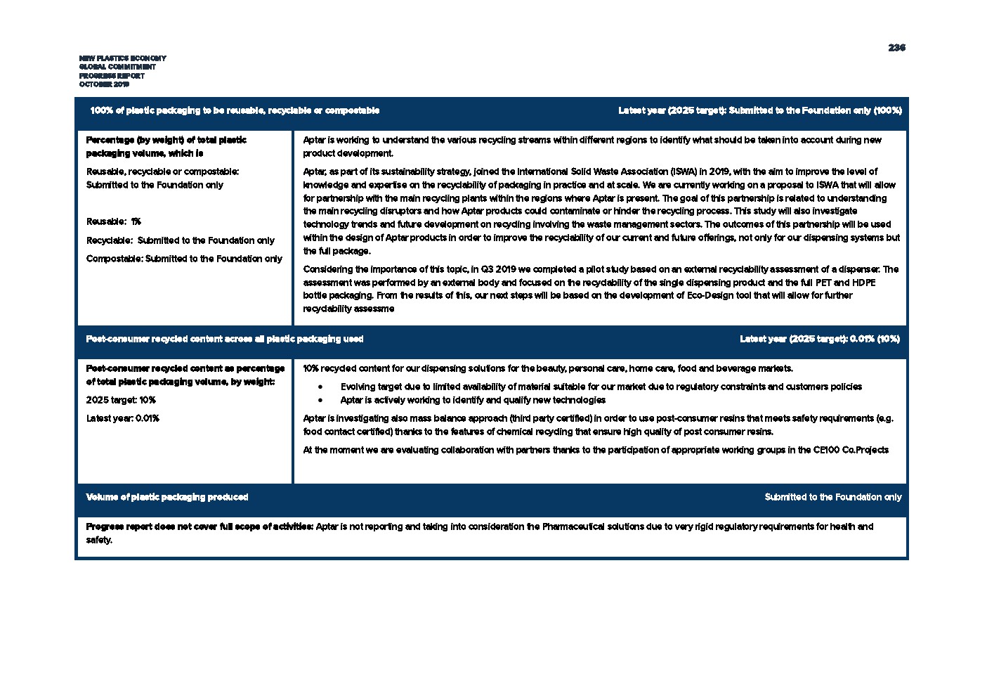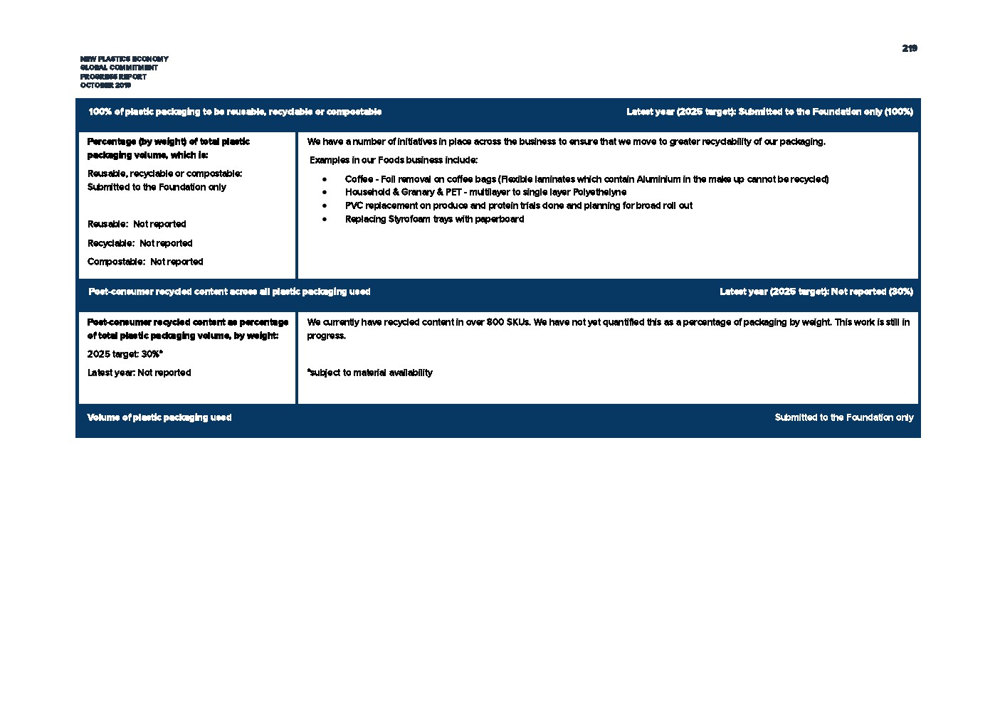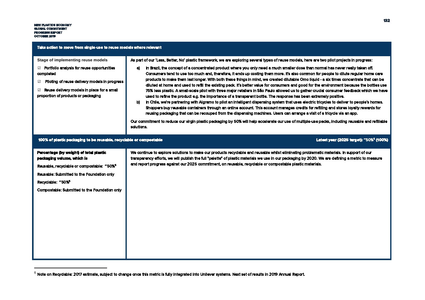 目前,60%的塑料包装是可重复使用、可回收或堆肥的。承诺计划在2025年实现100%可重复使用、可循环再造或可堆肥塑料包装。