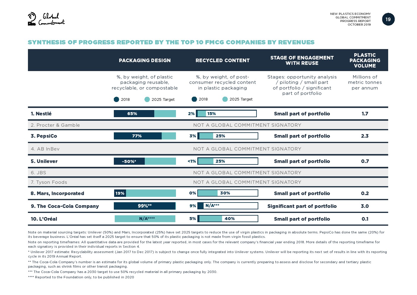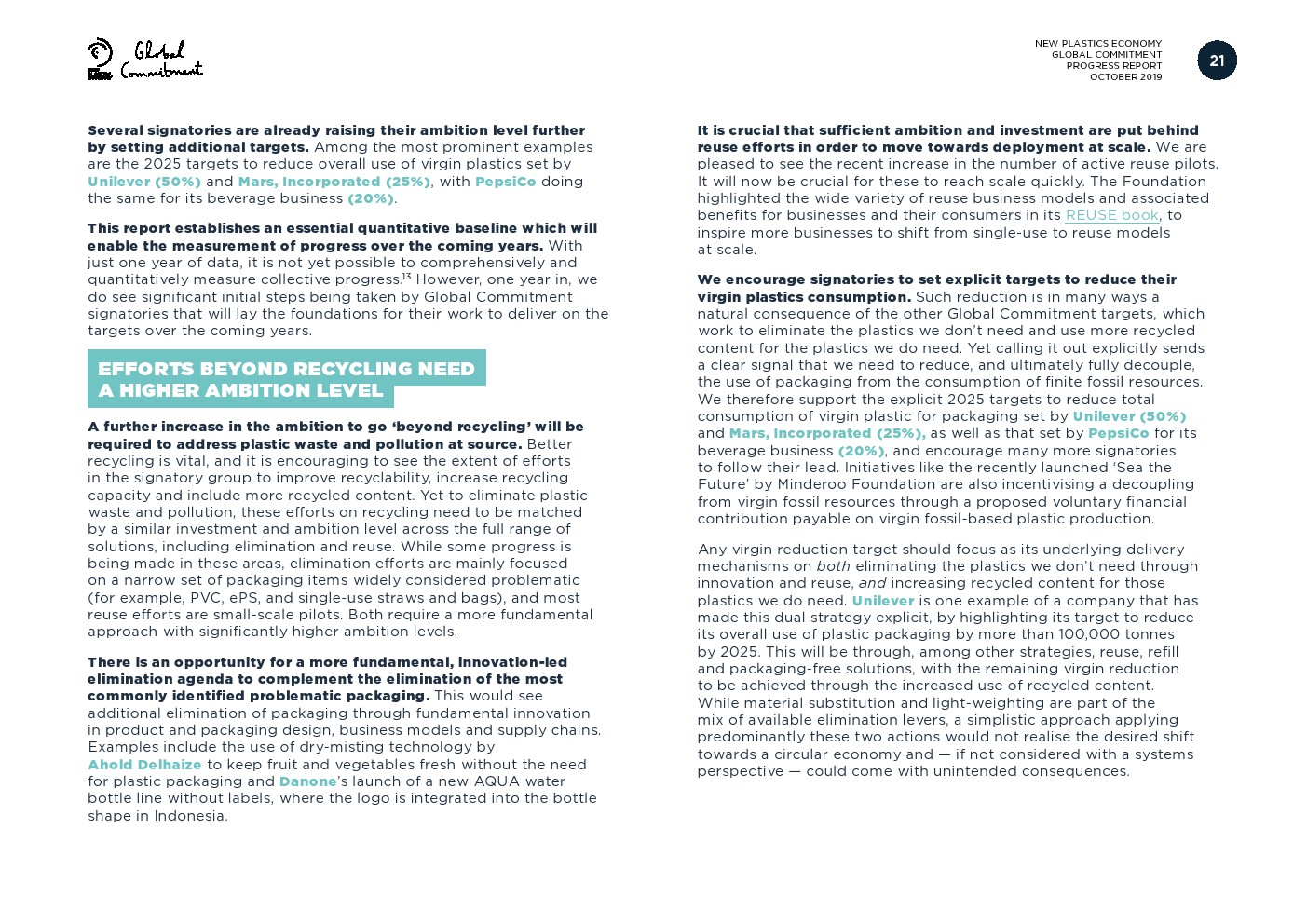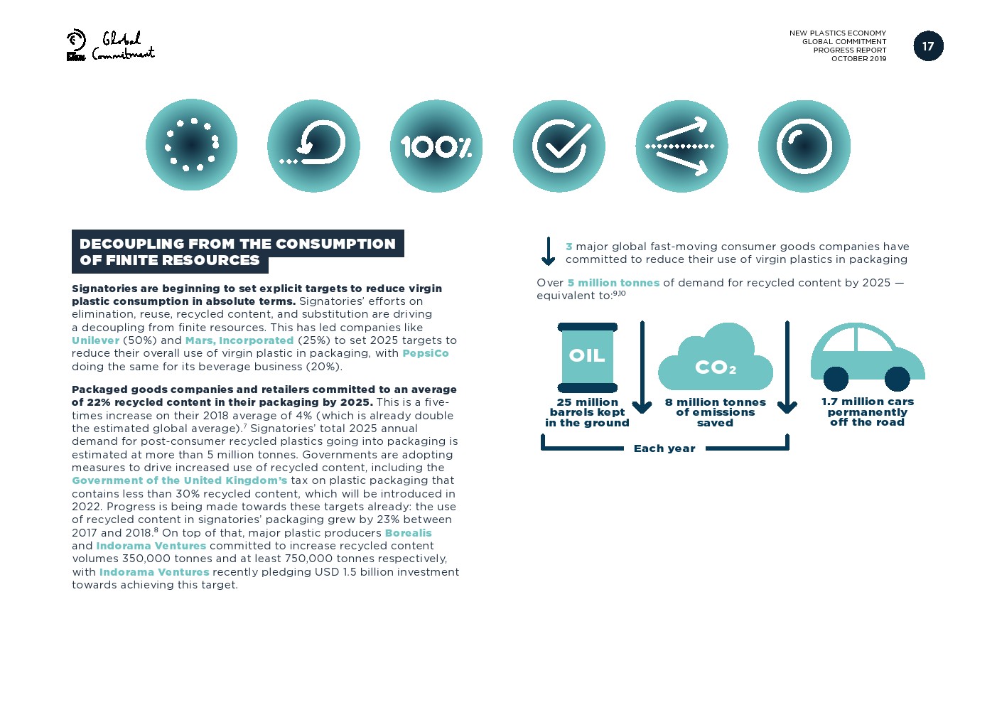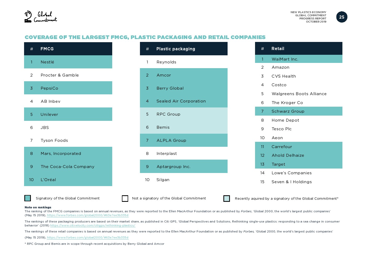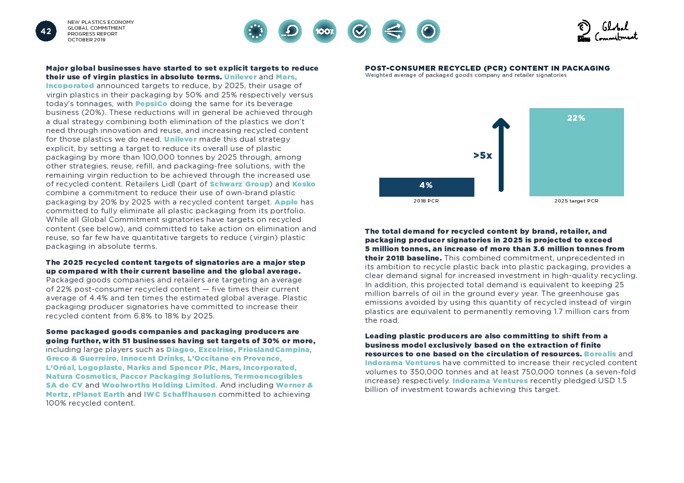 联合利华(50%)、玛氏公司(25%)和百事(20%)将2025年目标设定为减少在包装中纯塑料的使用量。包装商品公司和零售商承诺到2025年将其包装中的可回收成分平均提高22%。