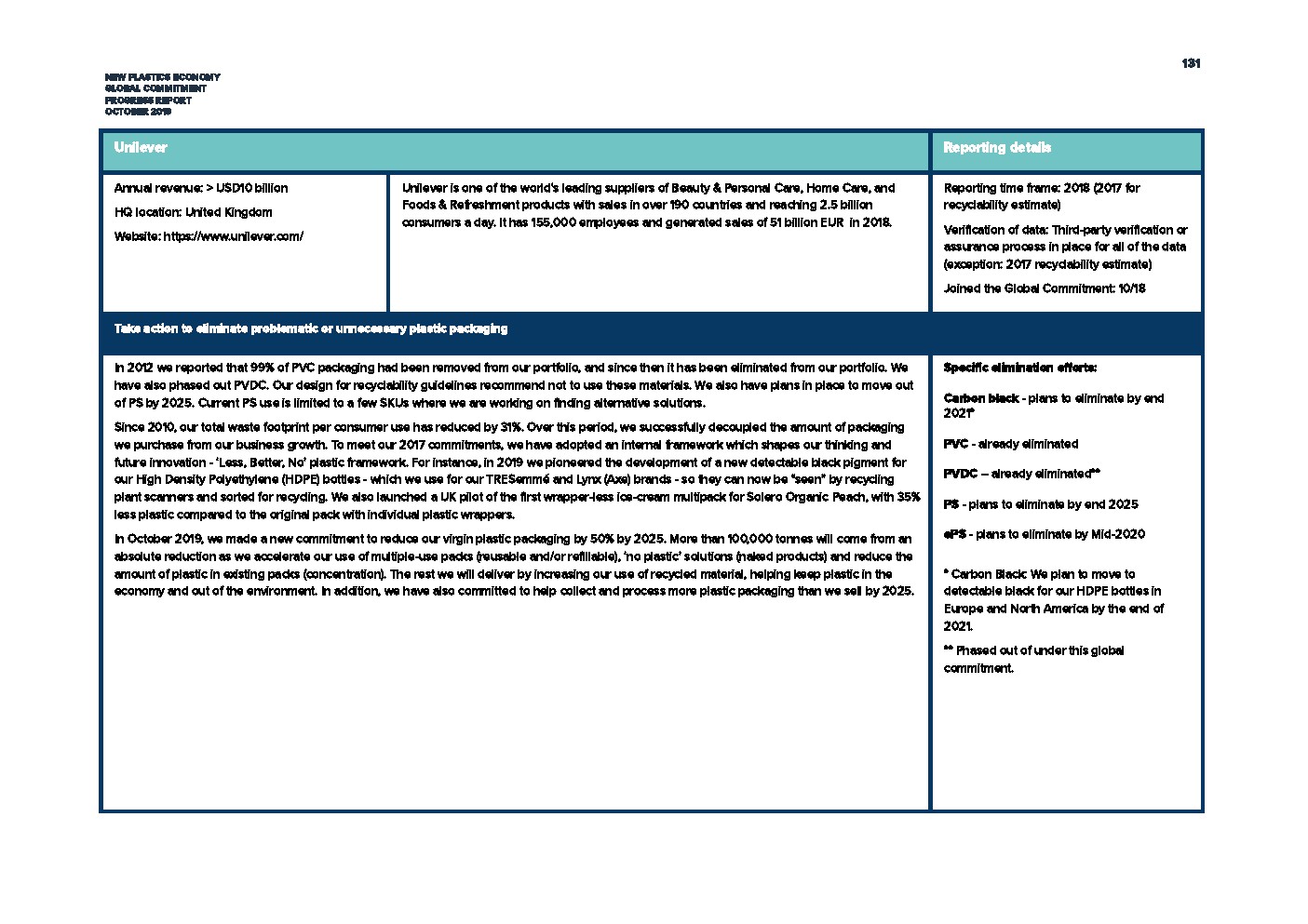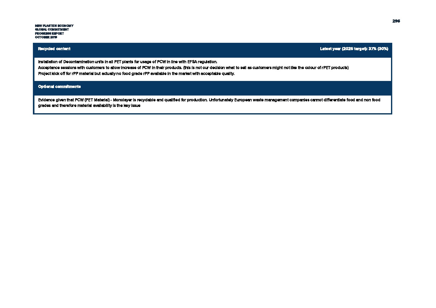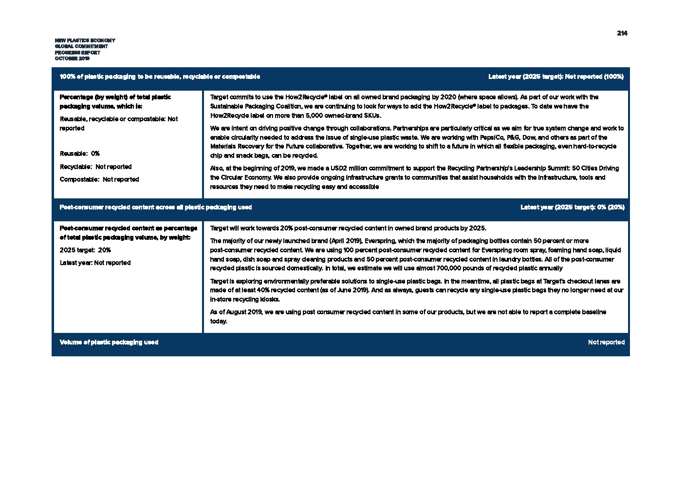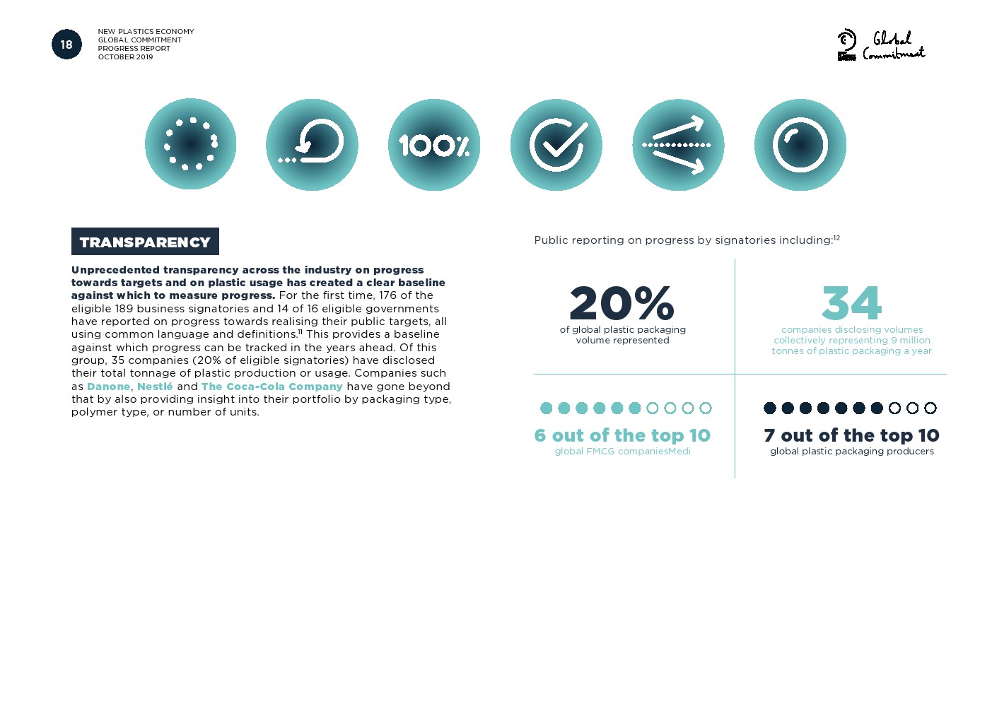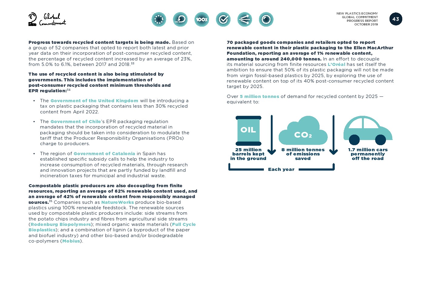 联合利华(50%)、玛氏公司(25%)和百事(20%)将2025年目标设定为减少在包装中纯塑料的使用量。包装商品公司和零售商承诺到2025年将其包装中的可回收成分平均提高22%。