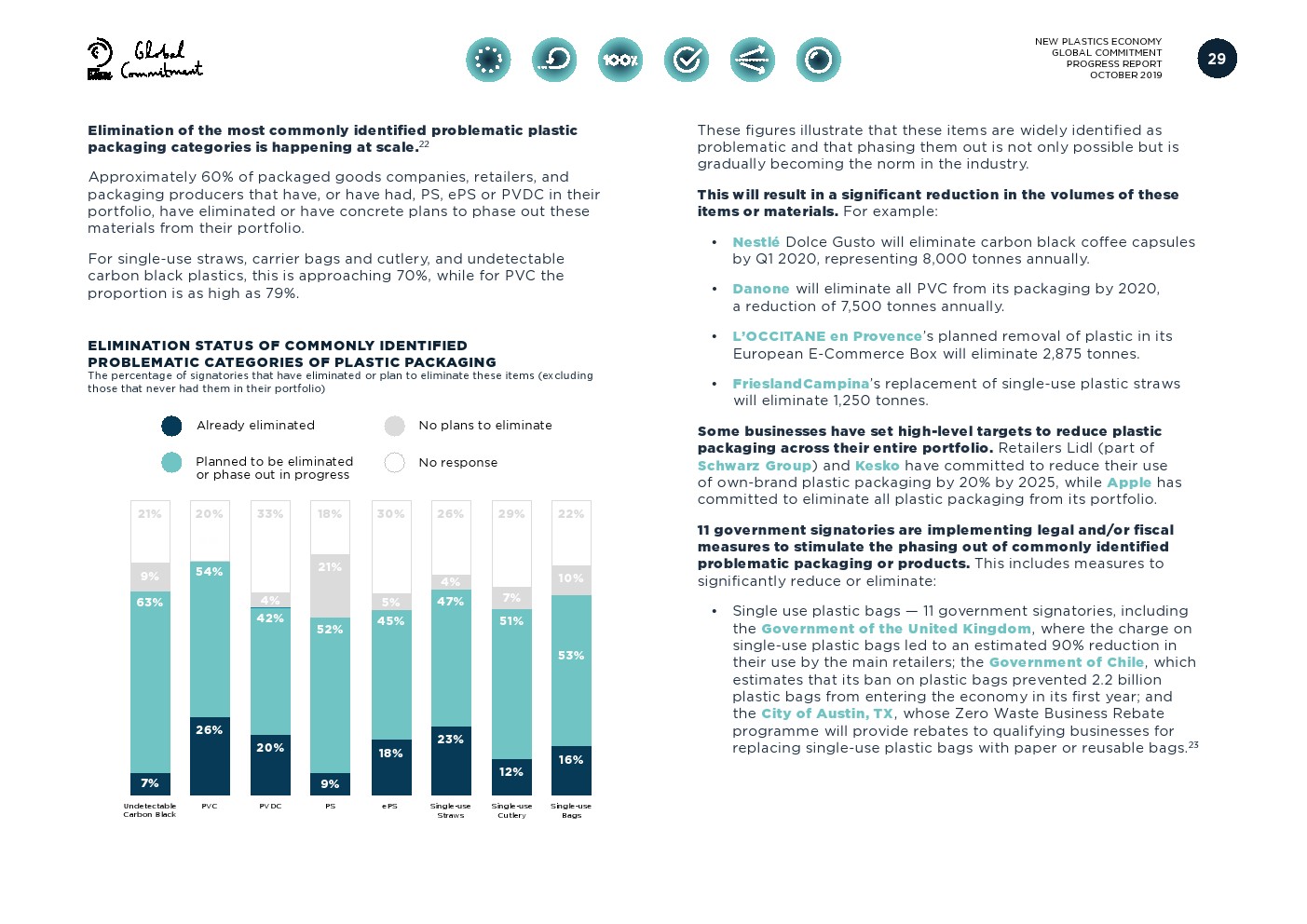 在企业和政府的推动下,大规模消除最常见的有问题的塑料包装。曾使用过PS、ePS或PVDC的品牌、零售商和包装生产商中,大约60%已经淘汰或有计划从其产品组合中逐步淘汰这些材料。70%的品牌、零售商和包装生产商将淘汰一次性吸管、提包和炭黑塑料;对于PVC,这一比例高达79%。