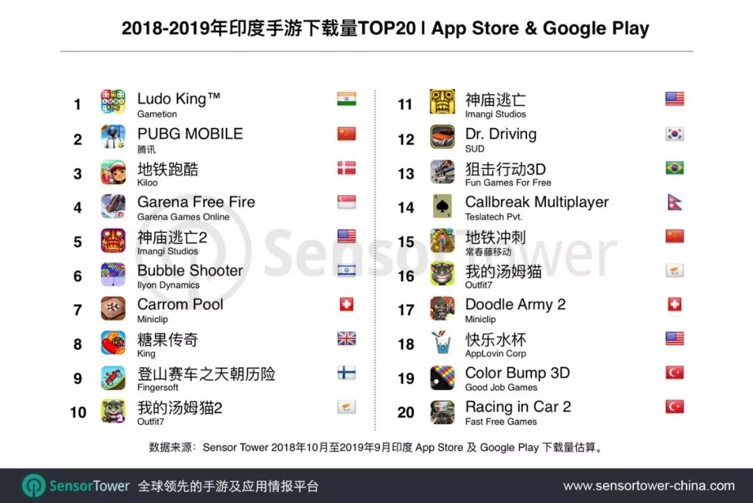 印度本土飞行棋手游《Ludo King》近年来一直是当地最受欢迎的手机游戏,过去一年获得超过1亿次下载。腾讯《PUBG MOBILE》获得近8000万次下载,其中41.5%由其Lite版本贡献。