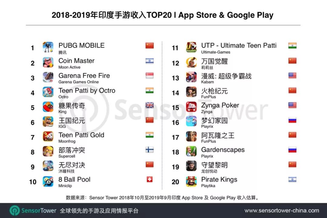 在《PUBG MOBILE》风行之前,印度手游收入榜由本土棋牌手游《Teen Patti by Octro》等领航。虽然从2018年Q4开始,《PUBG MOBILE》稳居收入榜榜首,但作为全球最钟情棋牌游戏的国家之一,印度手游收入榜 Top20 中仍有4款棋牌手游。