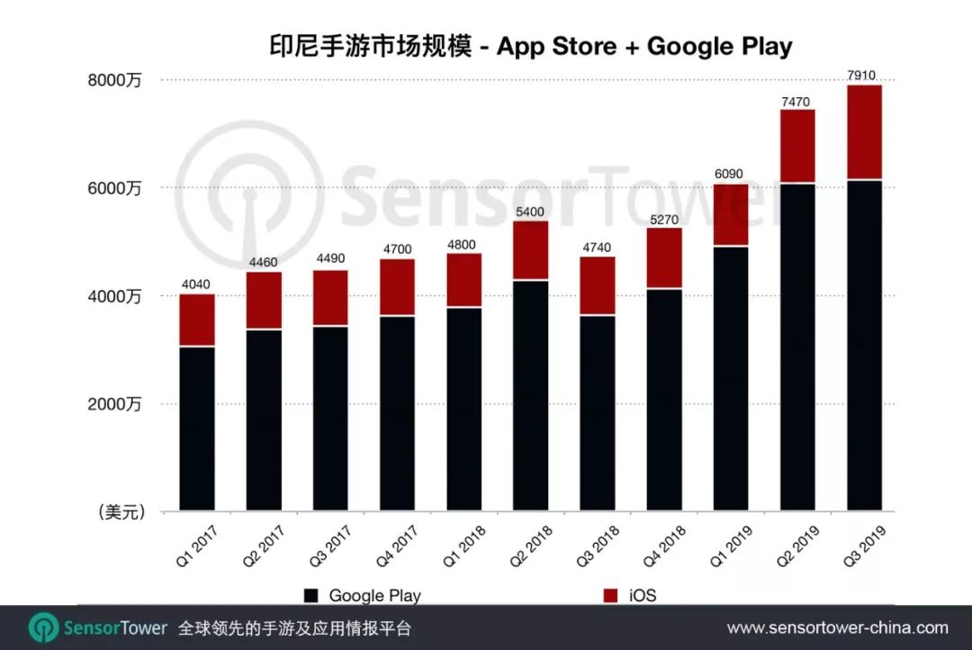 下图可见,踏入2019年,印尼手游市场迎来高速增长。今年Q3,当地手游在 App Store 和 Google Play 的预估总收入达到7900万美元,同比增长66.9%。今年前三个季度,当地手游总收入超过2.1亿美元,较去年同期1.5亿美元增长43.7%。