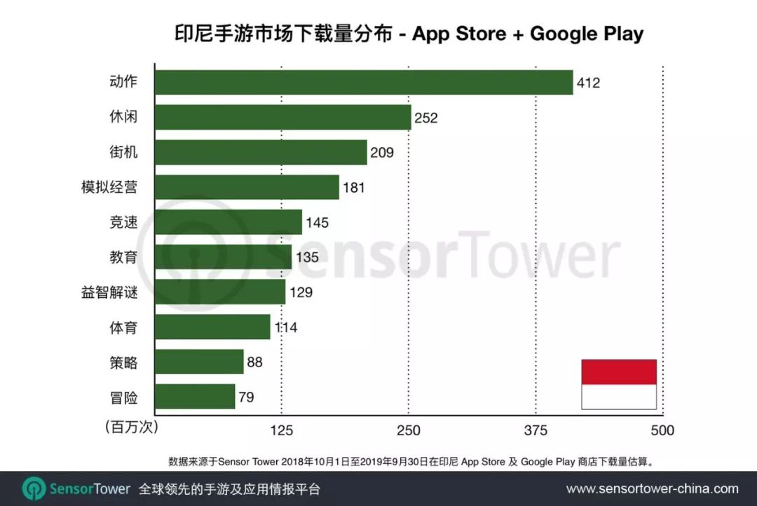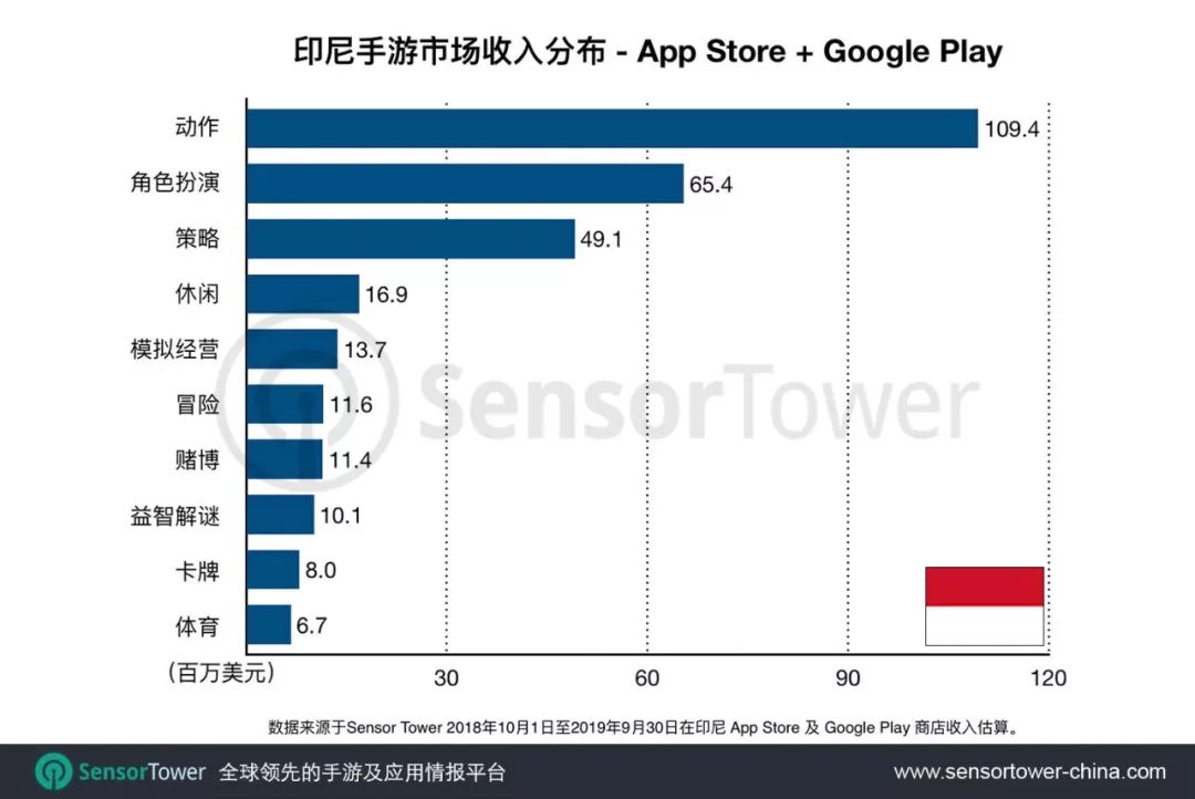 收入方面,排名前三的类别依次为动作,角色扮演和策略手游。这与中国手游市场颇为相似,只是在中国市场角色扮演类排名第一,而印尼玩家更热衷于为竞技手游买单。