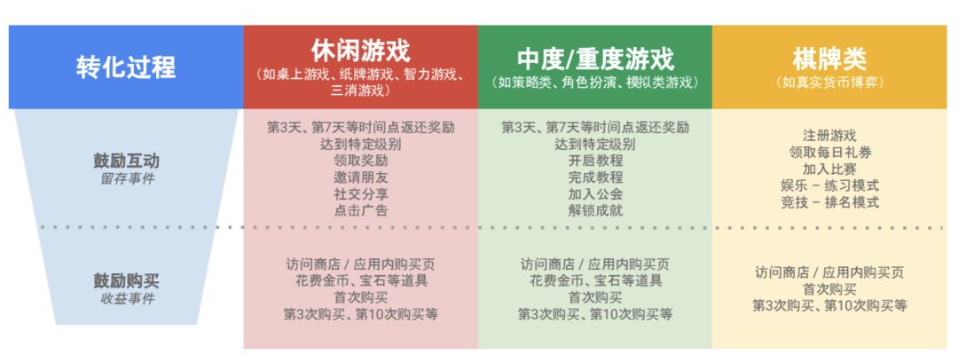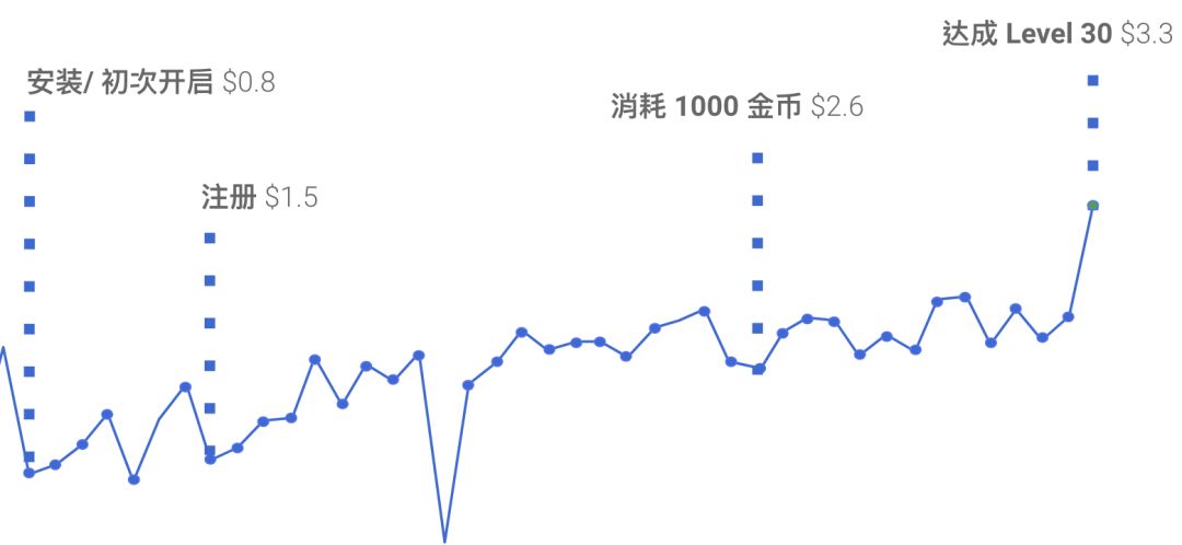 当你的手游或应用已经上线了 3 – 4 个月之后,开发者会更重视留存和如何找到高质量的用户,例如获取会玩到第三十关卡的用户。如果你想要找到这样一个特定动作或事件的用户,现在可以透过 APP Campaigns – 行动 (2.5)去做操作。前提是你需要把理想事件的数据通过埋点行为回传到广告系列中,让客制化事件的优化成为可能。
