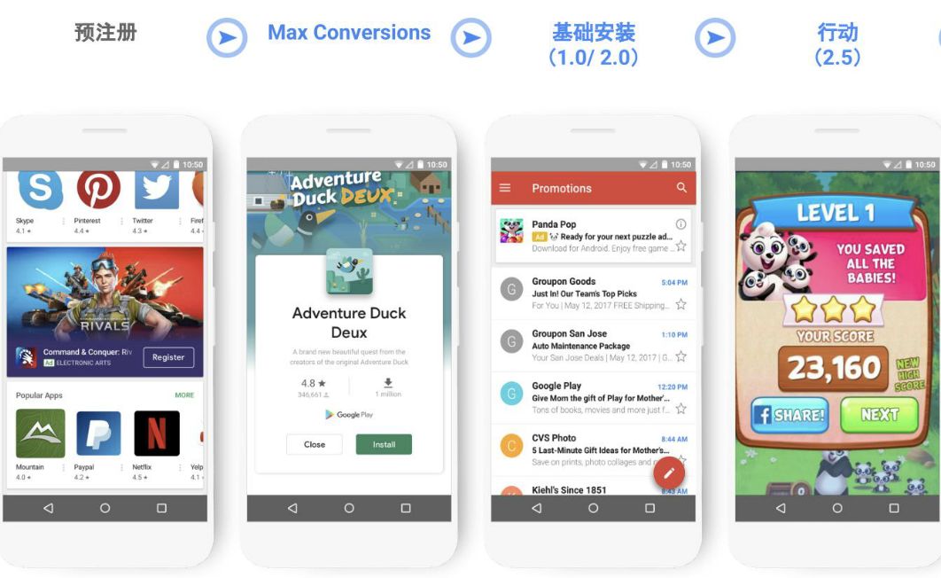 如果你想一次性起量来短时间获取大量客户,冲入榜单前位并赢得更多自然量,建议你使用新广告形式 “Max Conversions” 。这个功能的目的是在你的预算范围之内,系统会尽可能帮你获得最多安装。产品发布之后的前两周使用此功能效果最佳。(此为 Beta 产品,需要 Google Ads 客户经理支持)