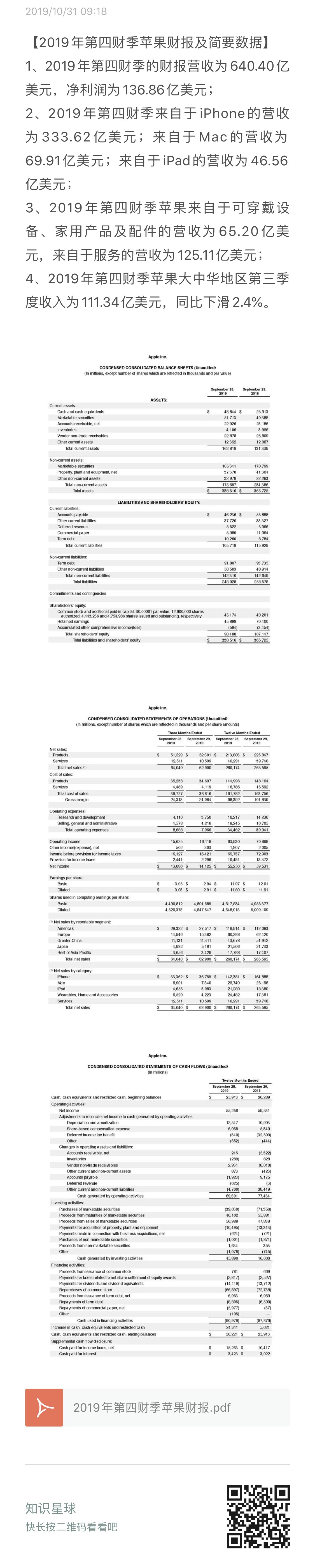 2019年第四财季的财报,营收为640.40亿美元,比去年同期的629.00亿美元增长2%,净利润为136.86亿美元,比去年同期的141.25亿美元下降3%。