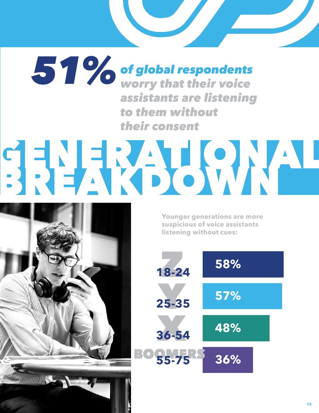 大约一半的受访者(51%)担心他们的语音助理在未经他们同意的情况下窃听他们的对话。较年轻的成年人(58%的18-24岁和57%的25-35岁)倾向于对语音助理在不知情的情况下监听更加怀疑。尽管大约一半的X世代(48%)担心他们的语音助手,但只有1/3的婴儿潮一代(36%)担心窃听问题。