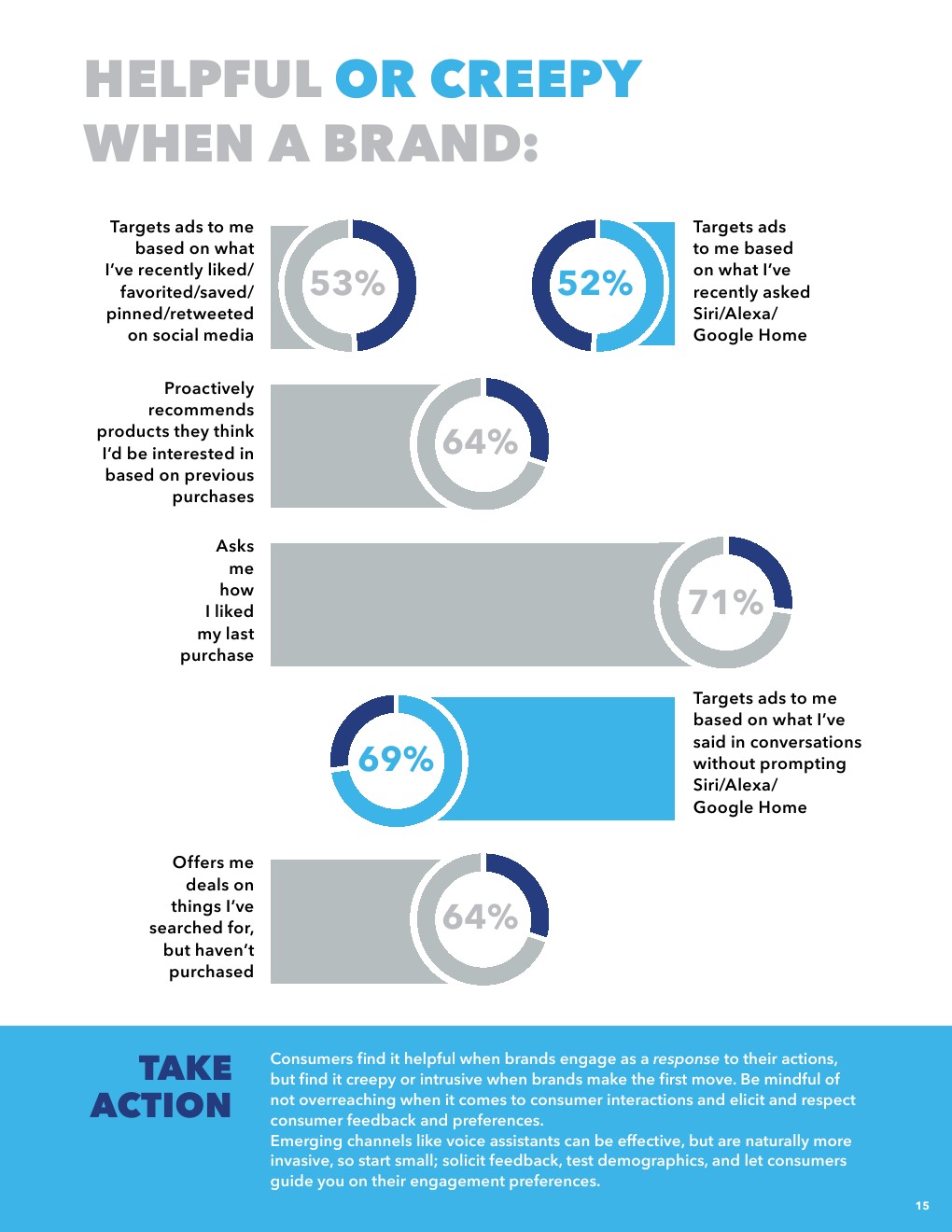 但是这并不意味着语音助理的使用没有问题。例如,超过一半的受访者(52%)表示,当品牌根据他们最近询问语音助理的内容提供广告时,这令人毛骨悚然。可以理解的是,更多的受访者(69%)表示,如果一个品牌根据他们在对话中所说的内容有针对性地提供广告是令人毛骨悚然的。在这两种情况下,只有少数人认为这么做是有用的。