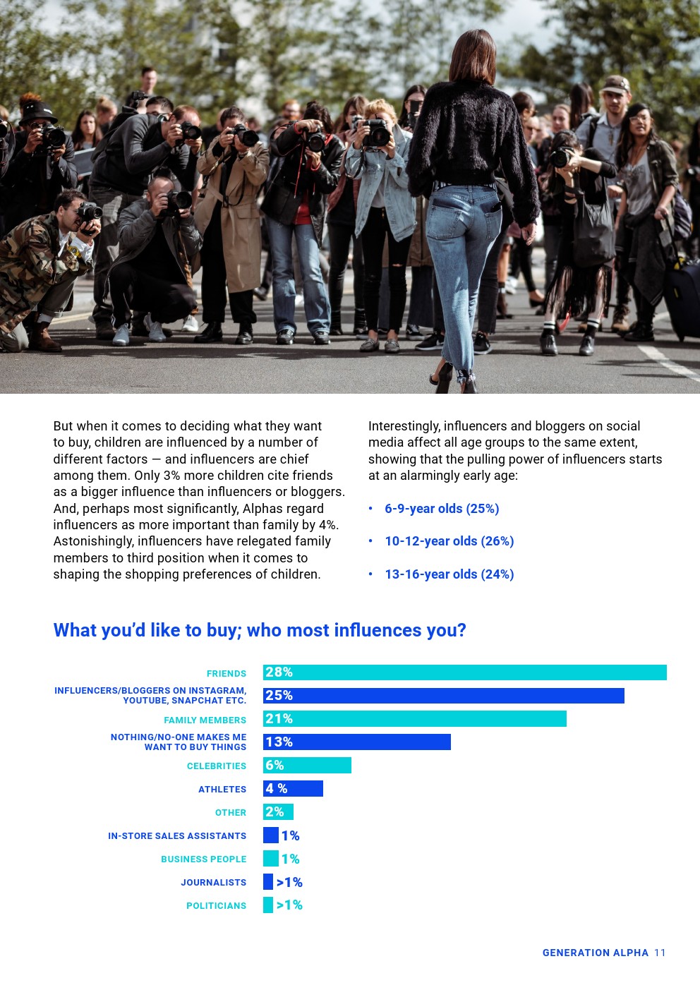 不仅仅是青少年受到网络营销的影响。1/4的6-9岁儿童(25%)和26%的10-12岁儿童表示,社交媒体意见领袖对他们想要购买的东西有影响。