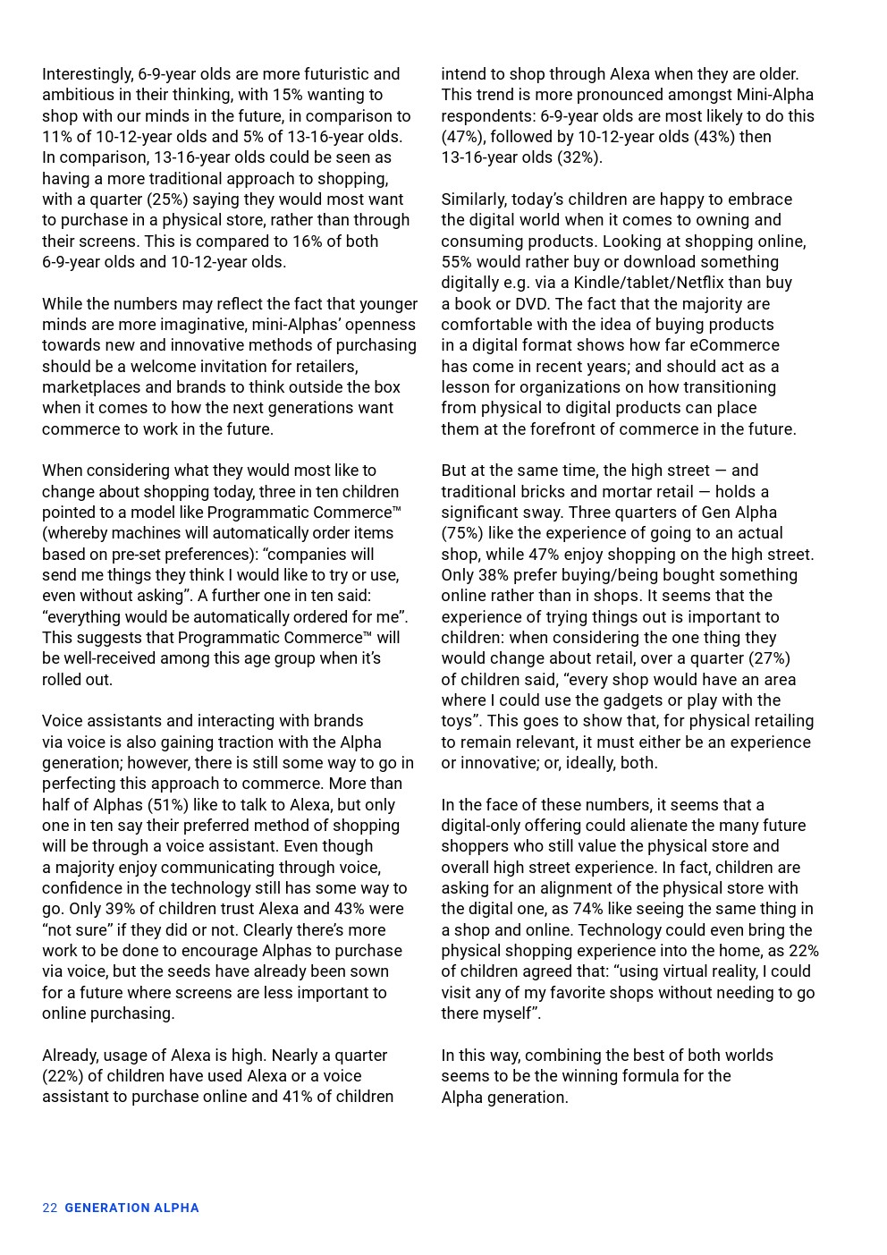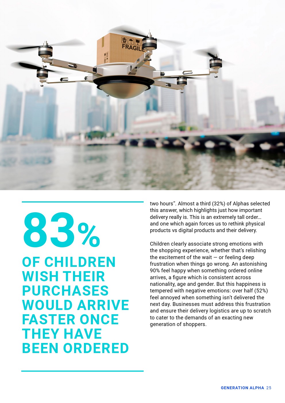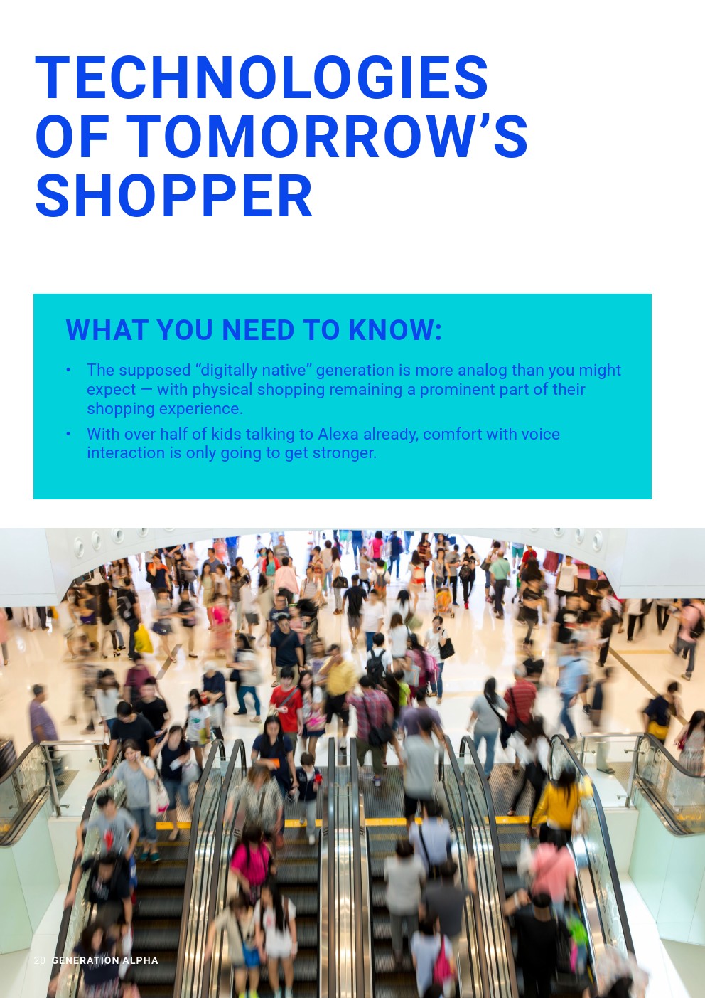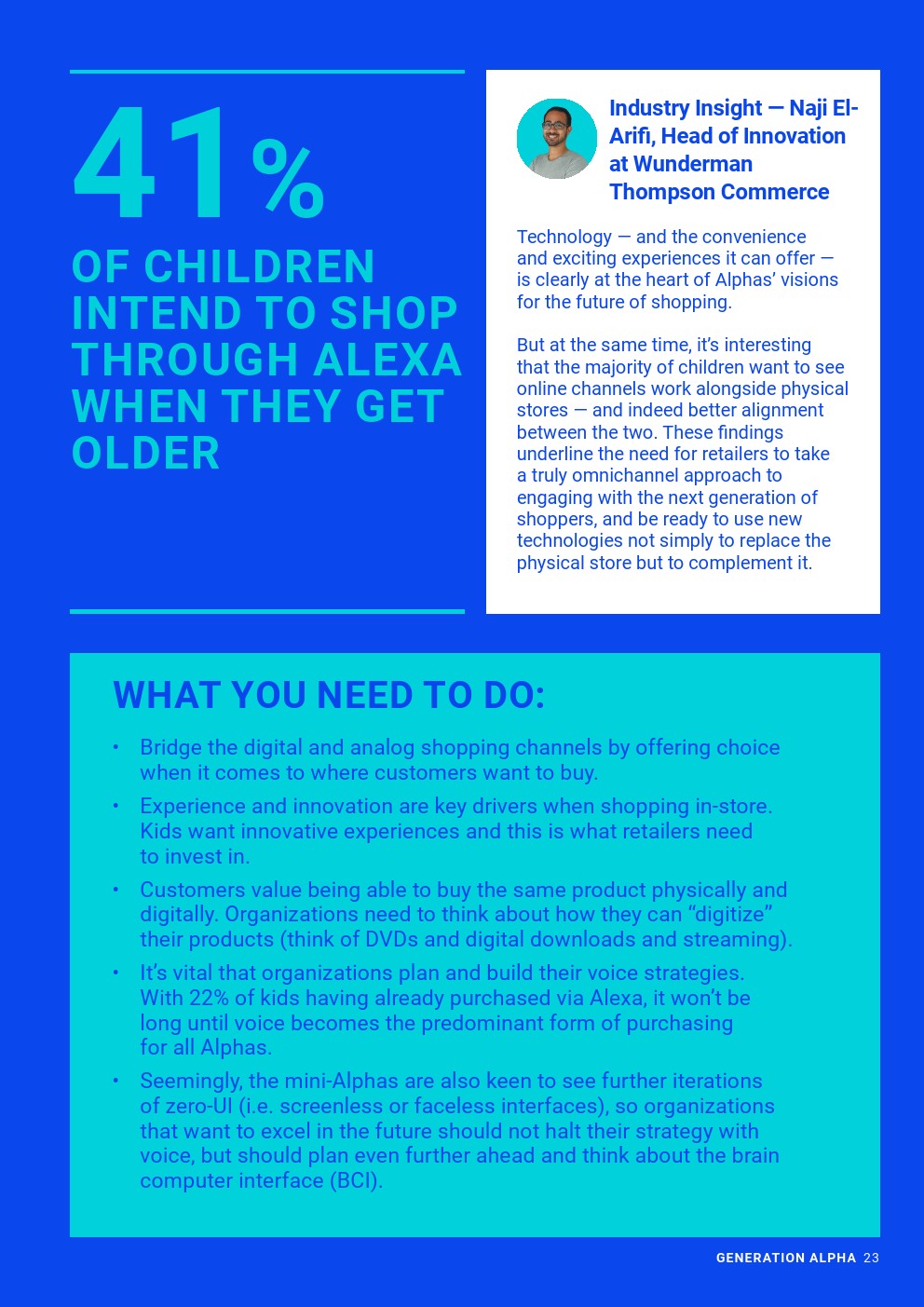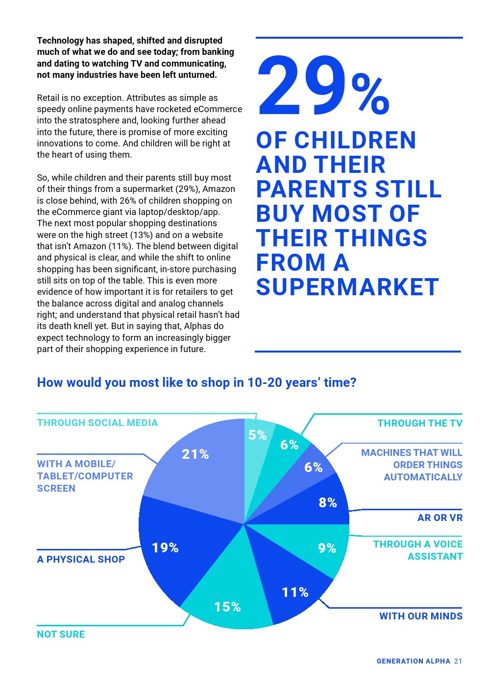 这项调查要求孩子们指出他们在未来10-20年内最想使用的购物方法。尽管大约1/10的受访者(11%)最希望将来能用意念购物,但在可预见的未来,更多已经确立的购物方法可能仍然流行。约1/5的受访者(21%)愿意使用手机/平板电脑或电脑购物;19%的受访者仍会选择实体店。其他选择包括语音助理(9%)、AR或VR(8%)、电视(6%)或自动订购东西的机器(6%)。