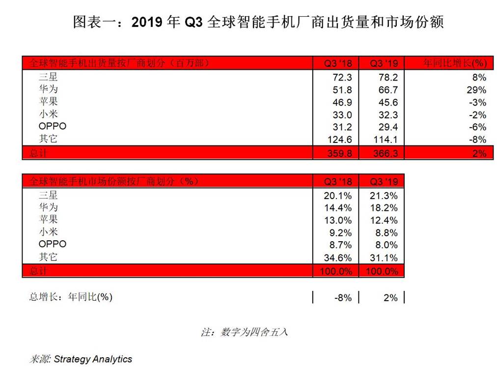 Strategy Analytics最新发布的研究报告指出,2019年Q3全球智能手机出货量年同比增长2%达到3.66亿部,这是两年来智能手机行业的首次正增长。三星以21%的全球智能手机市场份额保持第一;华为市场份额升至创纪录的18%位列第二,而苹果以12%的市场份额位居第三。
