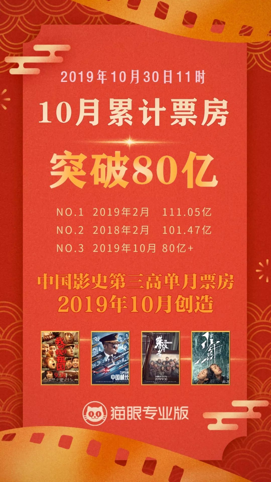 ●季军《中国机长》704万(-3.42%),跌幅控制极好,目前累计票房28.1亿,其与《我和我的祖国》已合力砍下56.5亿,贡献了10月六成以上的票房。