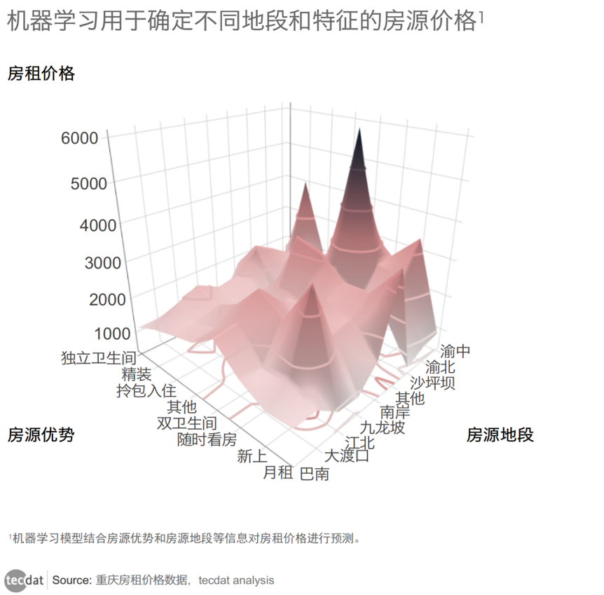 图表2显示了如何将机器学习模型应用于房源价格评估,从而在给定的房源优势,房源地段和建筑面积等情况下,对于房源价格而言,显然具有明显的最优性。为了优化不同房源的价格,特征价格理论的定义是从房源的异质性出发,把房源价格分解为不同特征价格,运用市场交易数据估计出房源特征隐含价格。这样的方法可以作为全面优化的第一步,该优化考虑了房源优势,房源地段和建筑面积等因素。