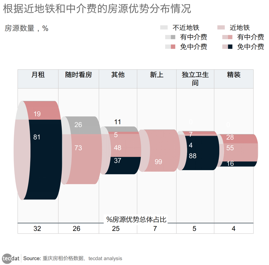 优势为月租和独立卫生间的房源中有90%以上没有中介费,而在精装和其他优势的房源中这一比例为42%和44%,在新上和随时看房的房源中这一比例为99%。在所有房源中靠近地铁的占全部的82%,而在新上房源中这一比例达到99%。月租房占所有房源的32%,作为短租房,它的优势是租期可短可长,退房没有太多的麻烦,所以是租客考虑的重要因素之一。