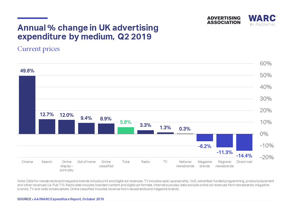 但电影在本季度取得了最强劲的增长,广告投资增长了近一半(49.6%)。