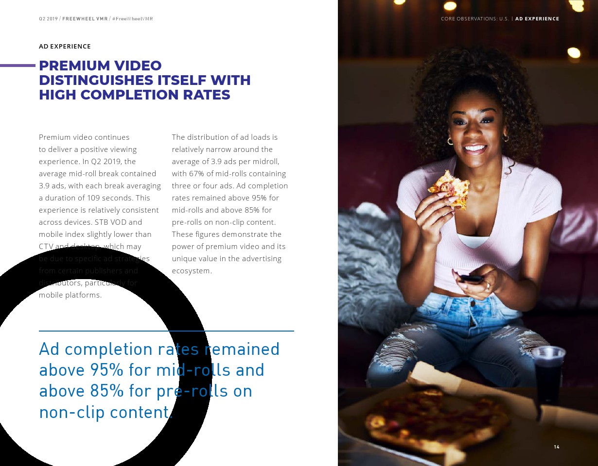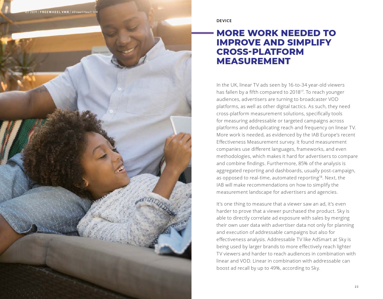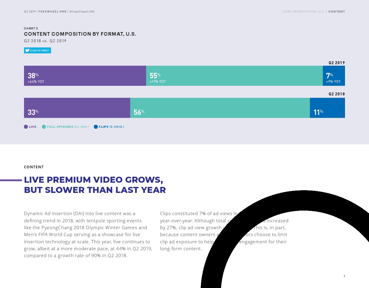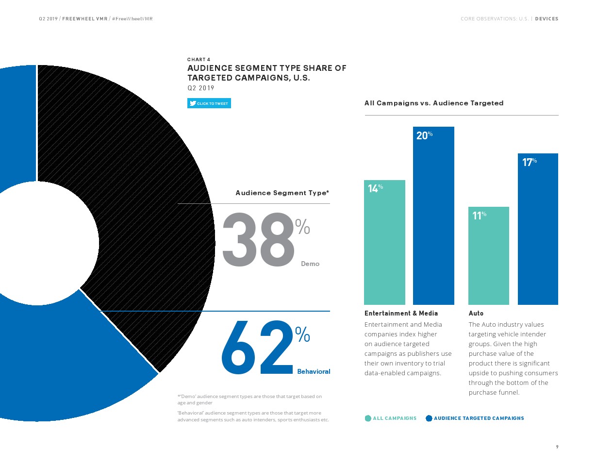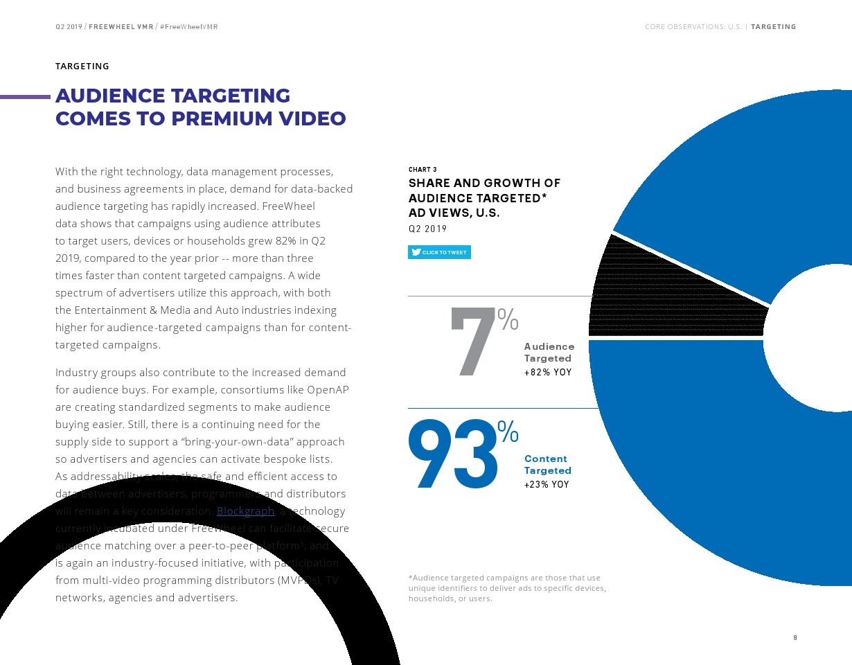 FreeWheel将受众定向广告定义为“使用唯一标识符向特定设备、家庭或用户发送的广告”,其占2019年第二季度美国广告浏览量的7%。以受众定向广告浏览量同比增长了82%,相比之下,内容定向广告浏览量同比增长了23%。