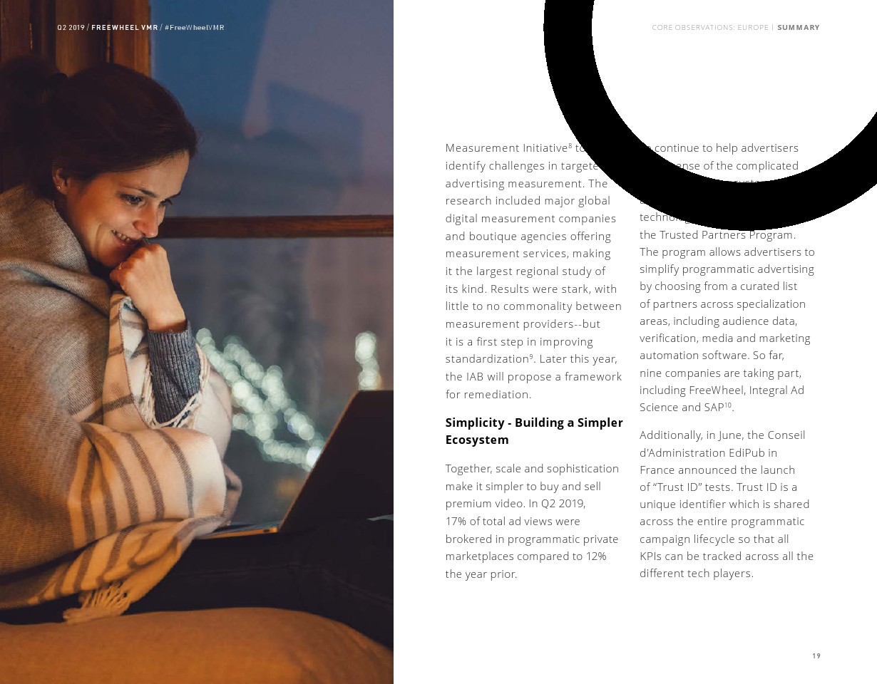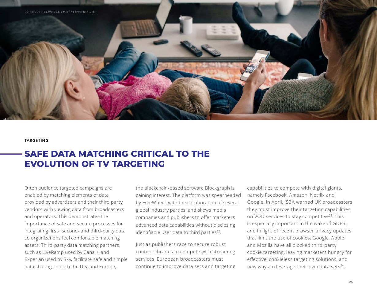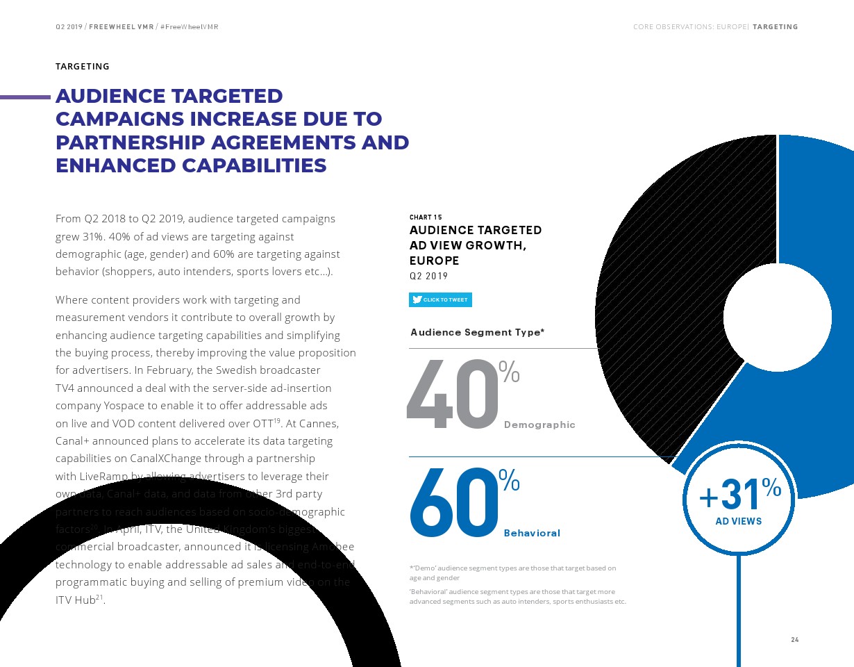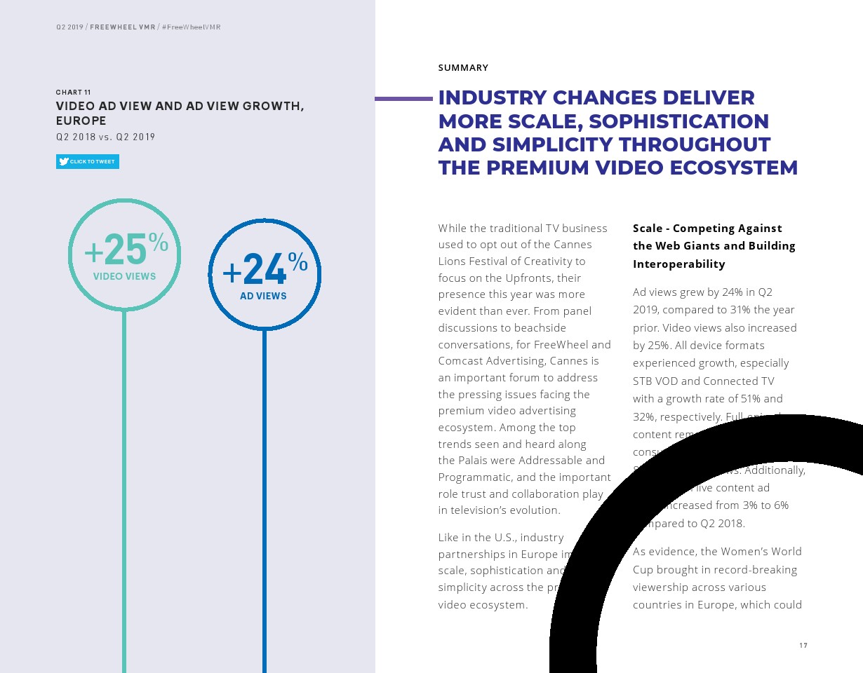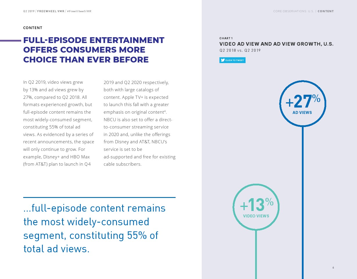 FreeWheel将受众定向广告定义为“使用唯一标识符向特定设备、家庭或用户发送的广告”,其占2019年第二季度美国广告浏览量的7%。以受众定向广告浏览量同比增长了82%,相比之下,内容定向广告浏览量同比增长了23%。