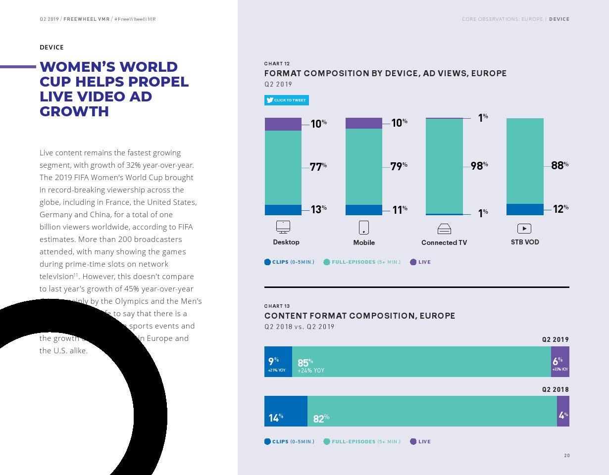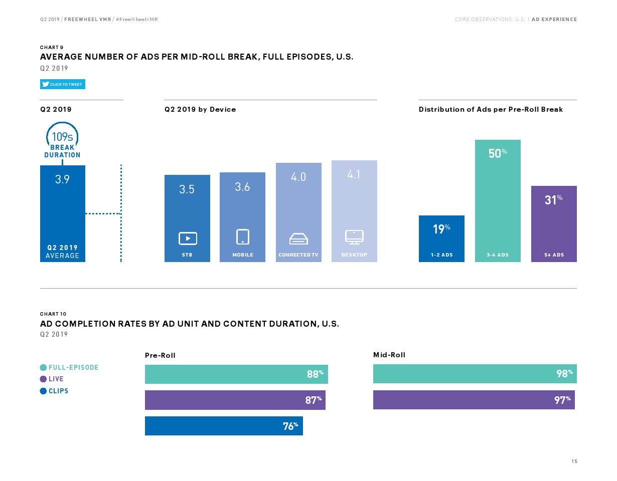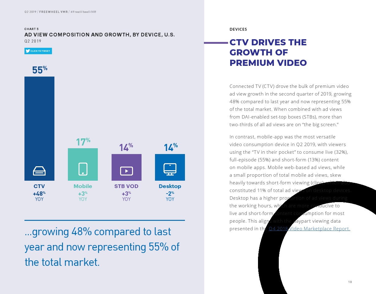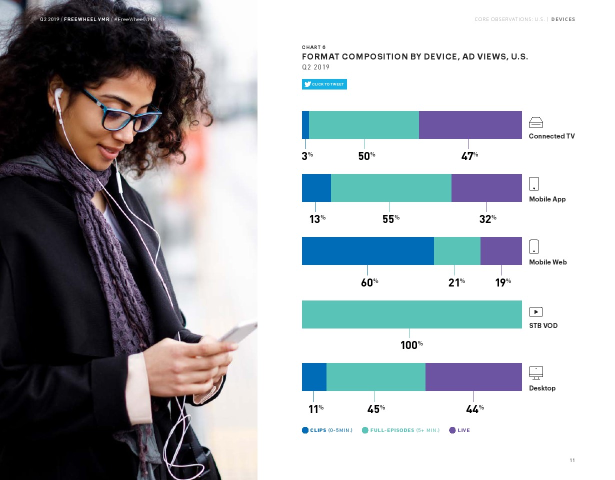 超过5分钟的收视占广告总浏览量的大部分(55%),该内容的浏览量同比增长了19%。但是,直播视频的增长率仍然是最高的,同比增长44%,占所有广告浏览量的38%。直播内容广告浏览量的增长相对低于2018年第二季度的增长率(90%)。与2019年第一季度非常相似,联网电视(CTV)仍然是高端视频观看的主导设备,2019年第二季度占所有广告浏览量的55%,手机占17%,机顶盒VOD占14%,PC占14%。