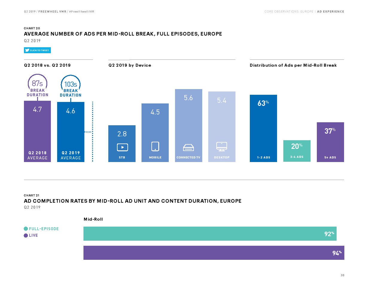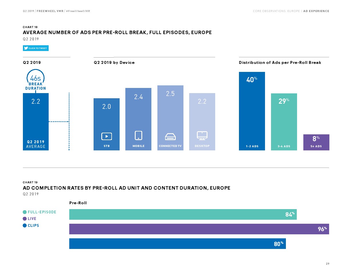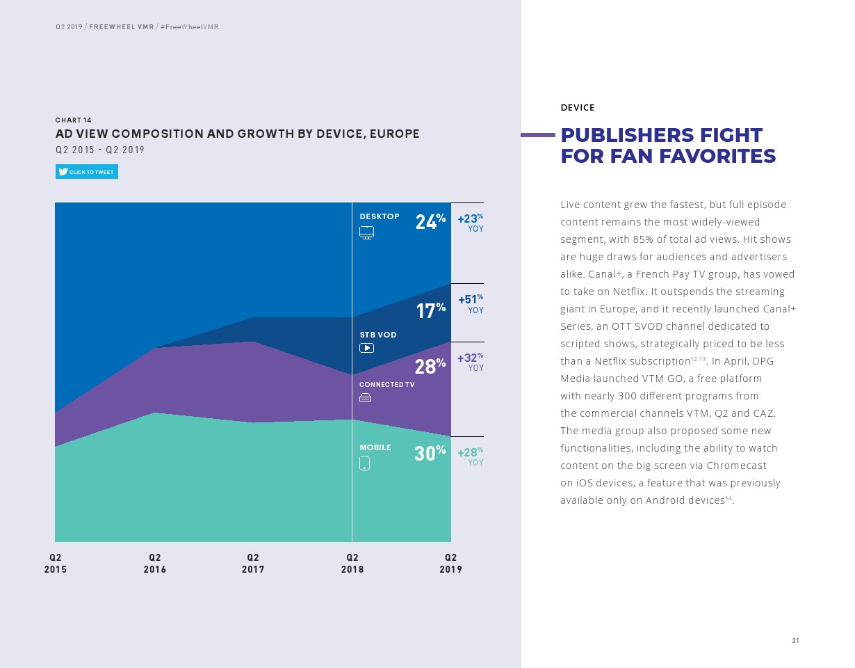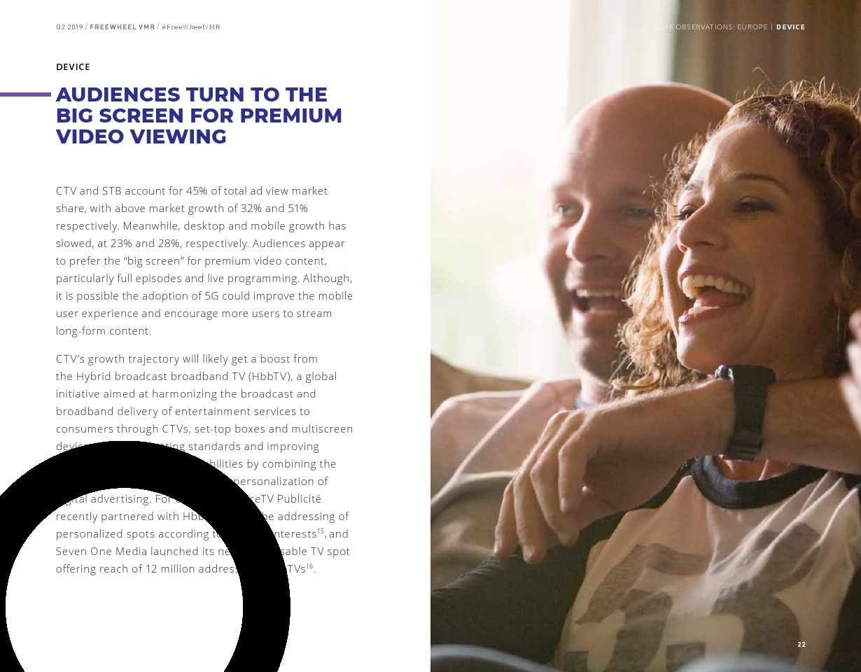 超过5分钟的收视占广告总浏览量的大部分(55%),该内容的浏览量同比增长了19%。但是,直播视频的增长率仍然是最高的,同比增长44%,占所有广告浏览量的38%。直播内容广告浏览量的增长相对低于2018年第二季度的增长率(90%)。与2019年第一季度非常相似,联网电视(CTV)仍然是高端视频观看的主导设备,2019年第二季度占所有广告浏览量的55%,手机占17%,机顶盒VOD占14%,PC占14%。
