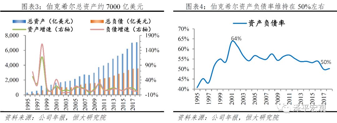 伯克希尔资产规模庞大,盈利稳健,长期占据世界500强前15名。规模上看,截至2018年伯克希尔总资产达7078亿美元,总负债达3553亿美元,1995-2018年23年间资产、负债年化增速分别为15%、16%。资产负债率常年维持在50%左右。盈利上看,2018年伯克希尔营收2254亿、利润40亿,主要受会计准则变更将股票浮亏计入净利润所致,按可比口径剔除投资损益外的净利润达265亿,净利率则为12%,1991-2018年27年间营收和利润年化增速分别为17%、9%,净利润率长期维持在10%左右。世界500强排名中,伯克希尔从2012年第24名到2018年排名前10,净利润第3,2019年世界500强中排名第12。