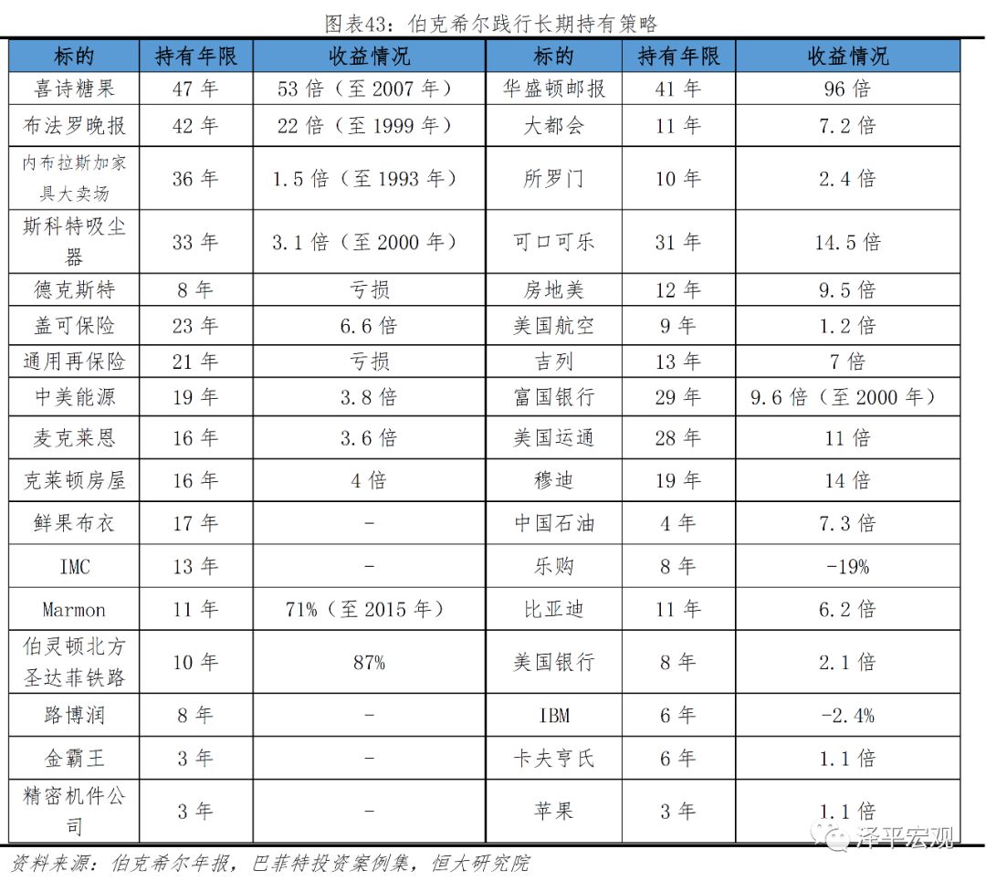 巴菲特在1998年曾说:“对我们来说,最好的事情就是一家伟大的公司陷入暂时的困境。我们想在他们躺在手术台上时买入”。善于结合两种方法寻找低估股票:一是绝对估值法。巴菲特自有一套计算内在价值的方法,即一家企业在其余下的寿命中可以产生的现金的折现值。1988年巴菲特首次购入可口可乐股票,股价被认为是处于历史高位,相当于花了5倍于账面价值的钱收购13亿美元。但巴菲特坚信可口可乐内在价值被低估, 经过30年可口可乐市值已经从150亿上升到2000亿美元。二是相对估值法。我们梳理出44家巴菲特经常提及的投资标的,买入时平均市盈率为14倍,68%股票市盈率小于15倍。