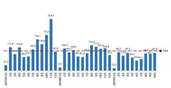 2019年10月购买指数为87.9,预计11月份消费者实际购买意愿略有上升