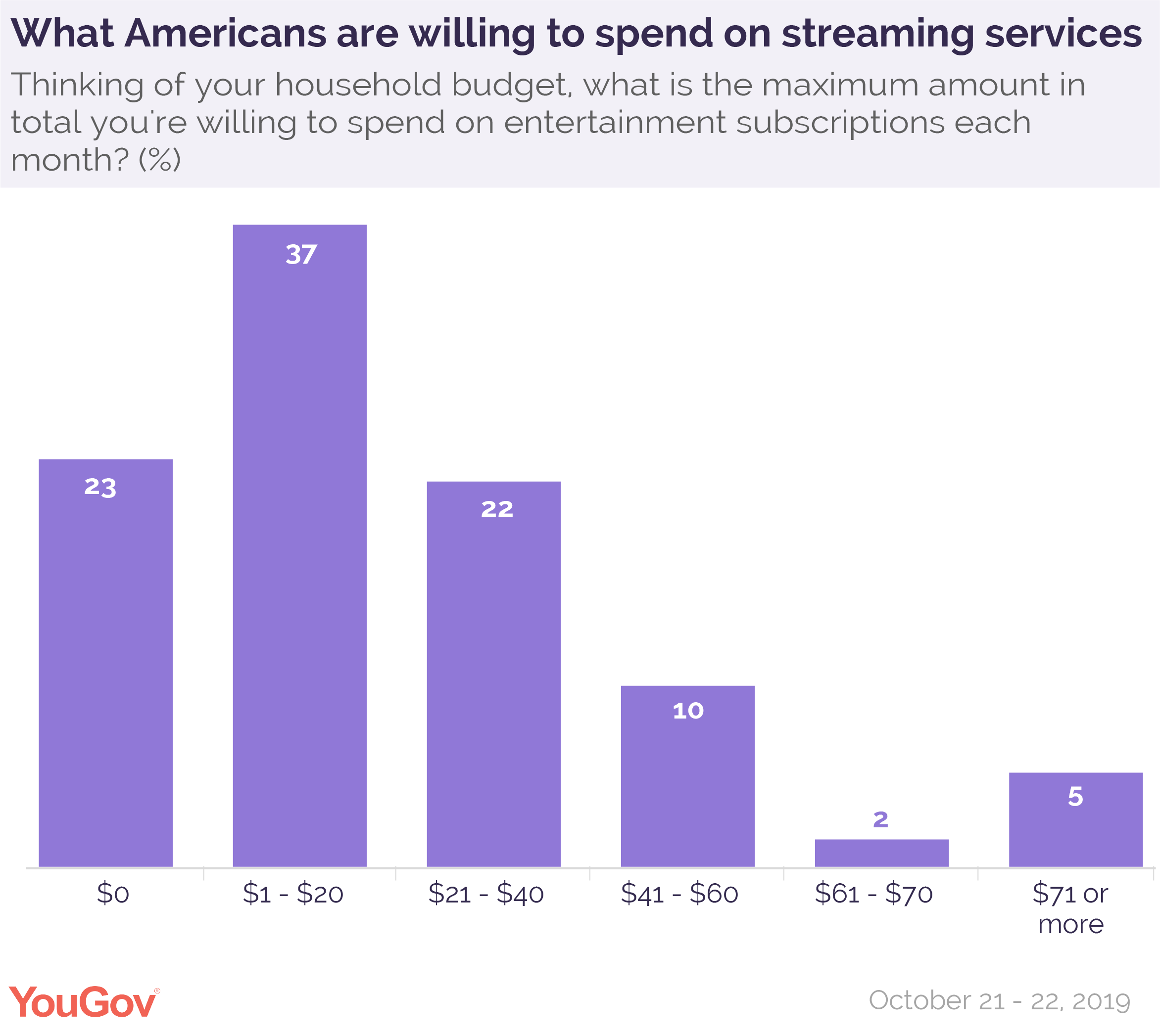根据YouGov的调查,超过1/3的美国人(37%)愿意每月在娱乐订阅服务上花费的最高金额在1-20美元之间。这个消费门槛在有线电视用户中是相似的。YouGov将订阅分类为Netflix和Hulu等流媒体电视和电影服务,以及Tidal和Spotify等音乐服务。