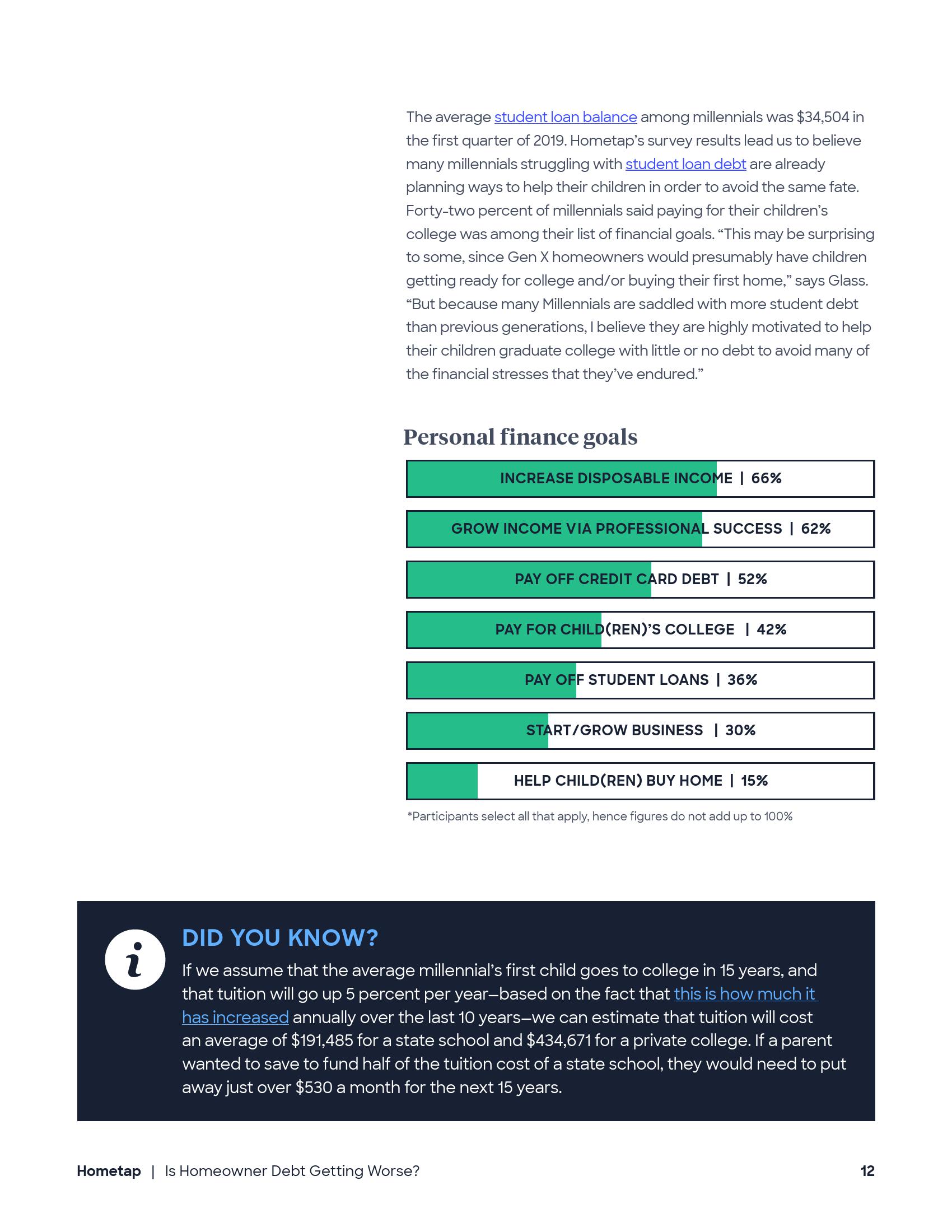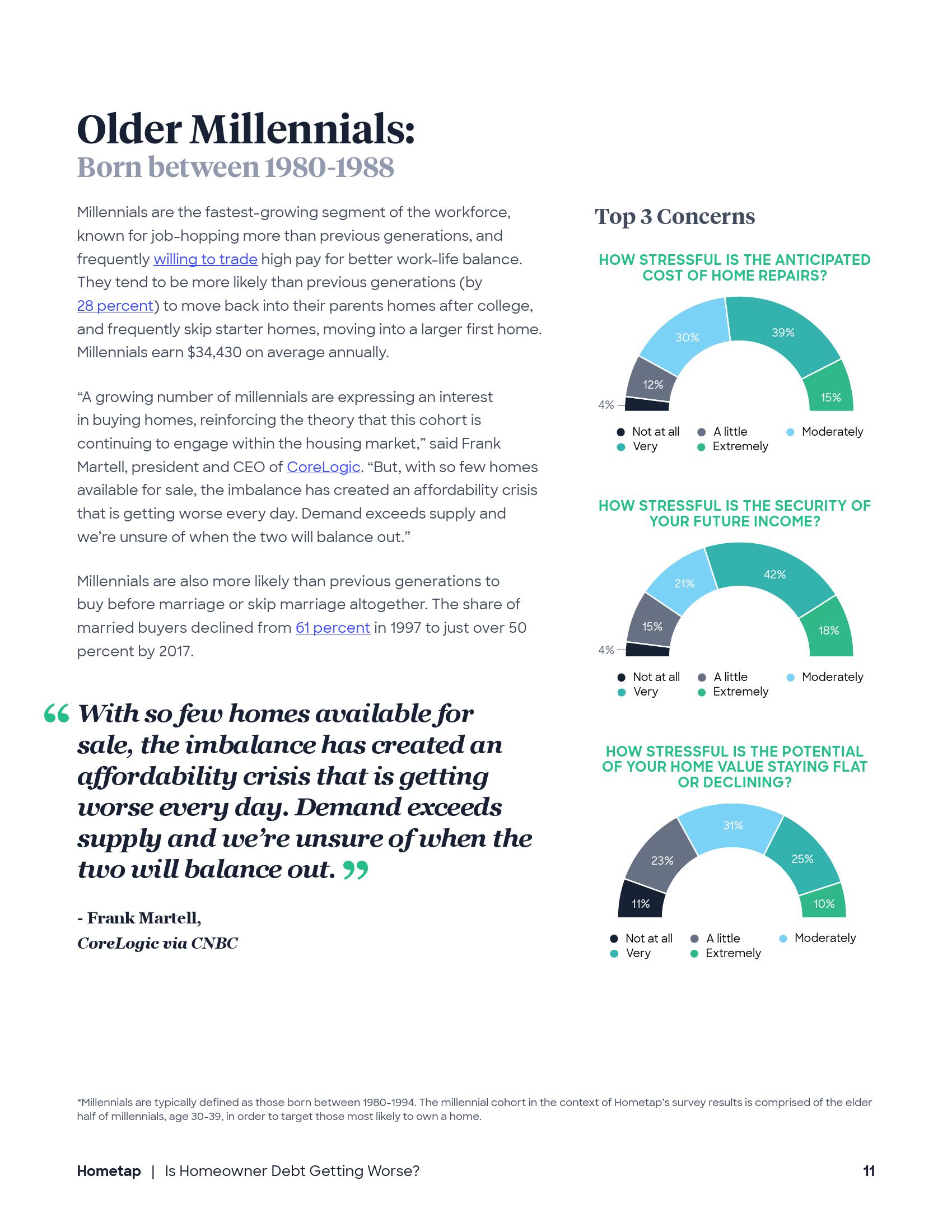 在“千禧一代”房主中,60%的受访者表示,住房成本使他们难以实现财务目标。42%的受访者担心,他们将无法省下足够的钱来支付子女未来上大学的费用。
