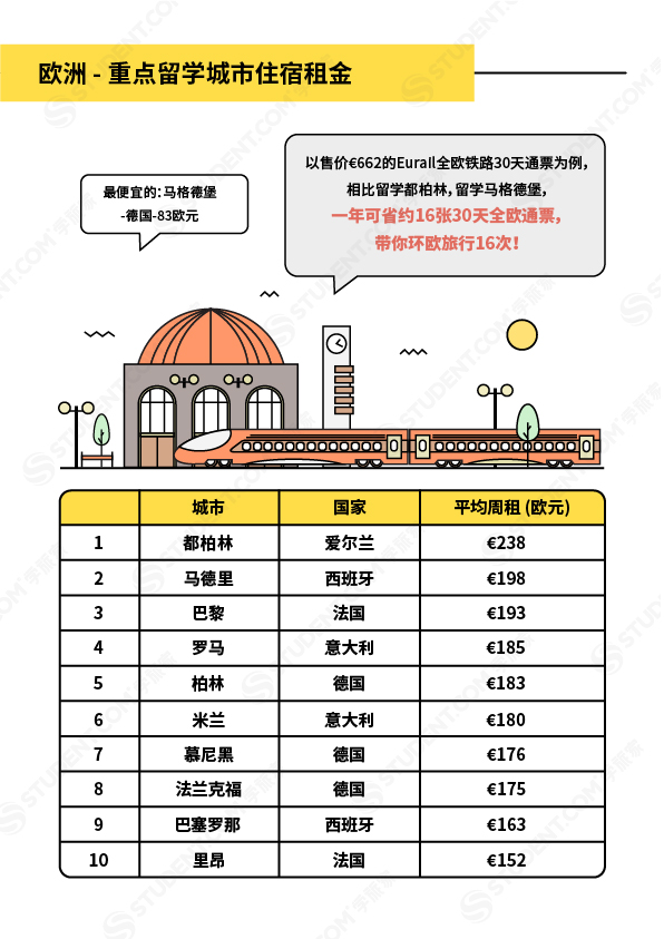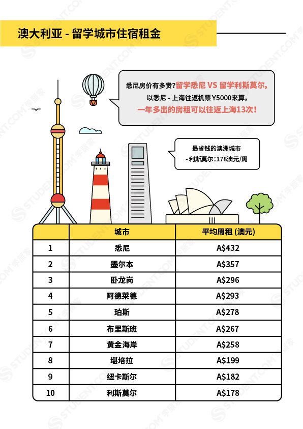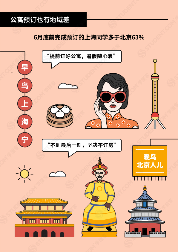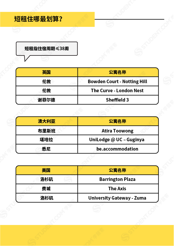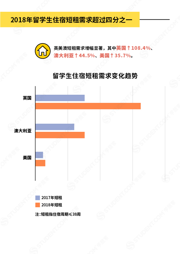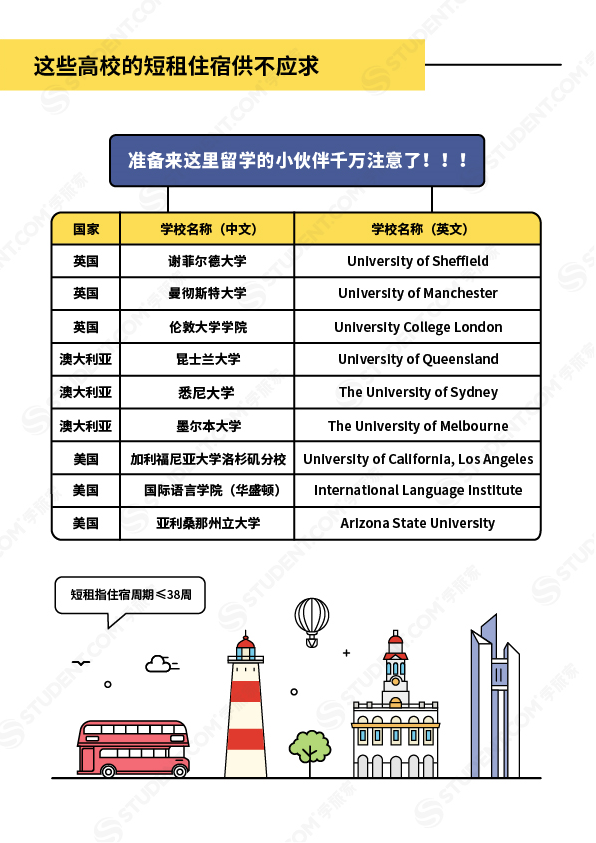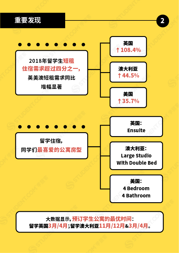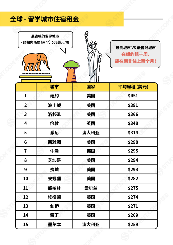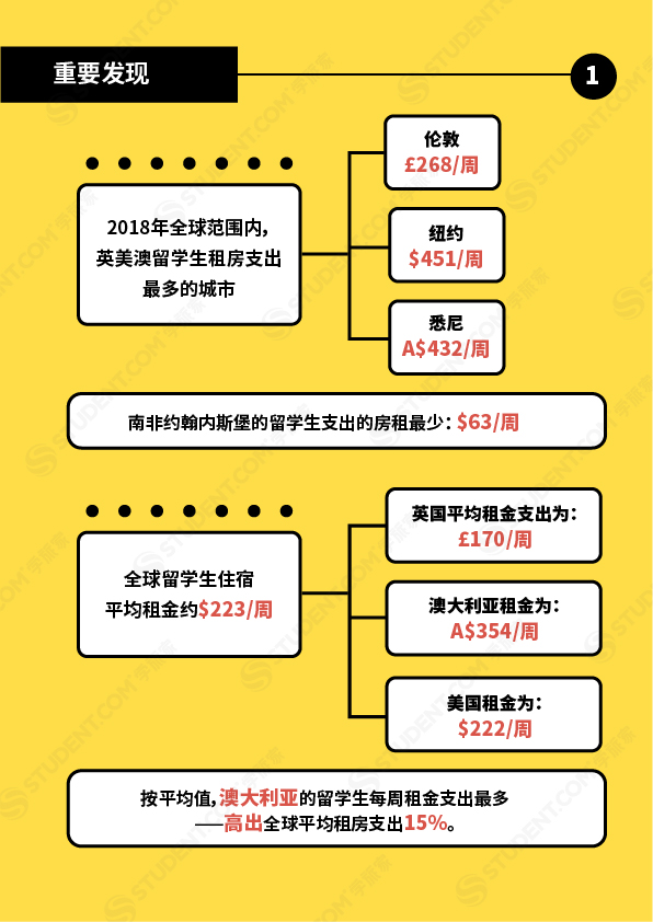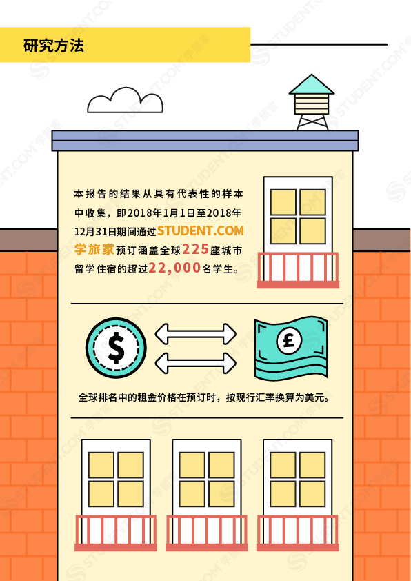 2019全球留学生住宿报告 留学海外,住宿是首先要考虑的问题。而一提到住宿,绕不开的就是三个话题——住在哪里?房租多少?房子好不好?中国人讲究物美价廉,选学生公寓自然也要货比三家。想花更少的钱,住上更好的公寓?那看这篇就对了! 2019年7月19日,STUDENT.COM学旅家正式发布——2019全球留学生住宿报告。 在这份报告中,我们对全球五大洲、225个留学热门城市的房租进行了统计分析,同时综合对比了在2018年1月1日至2018年12月31日期间、通过STUDENT.COM学旅家 预订留学住宿超过22,000名学生的大数据。公布了全球城市房价对比、留学生偏爱房型、最佳预订时间、长短租趋势对比等重要信息。 我们希望通过这一份报告,让所有留学生清楚了解到所在地区的房租水平,并让大家掌握更多实用信息与预订经验。 除此之外,还有更多公寓趣闻,我们都想分享给你—— Q:全球住宿最贵城市 VS 最便宜城市,两者相差能有多大? A:在纽约住一周,能在南非住上两个月! Q:留学住宿,一年最壕花销是多少? A:最高先保密,只能说一年不花33万RMB,都没有资格进入前五名! Q:几月订房最便宜?长租短租选哪里?哪个房型最有性价比?(单押x3,skr~) A:问题太多,不如滑动往下仔细研究 来自:student 更多阅读:联合国:2019全球粮食危机报告2019全球航空公司前十名揭晓,他们的App做得怎么样?IFPI:2019全球音乐市场报告2019全球AI人才报告CINNO:2019全球手机市场展望全球风能理事会:2019全球风电行业报告中国留学生白皮书欧盟统计局:2016年欧盟国家共接收160万名留学生美国国务院:2017年留学生获得美国签证的数量下降24%中国留学生跨文化适应调查2016留学生公寓报告K-12报告:2017-2018全球数字学习现状NAFSA:2023-24学年国际学生为美经济贡献438亿美元中国留学生白皮书 2.0中国留学生在美国花了 80.4 亿,1分钟读完3张信息图