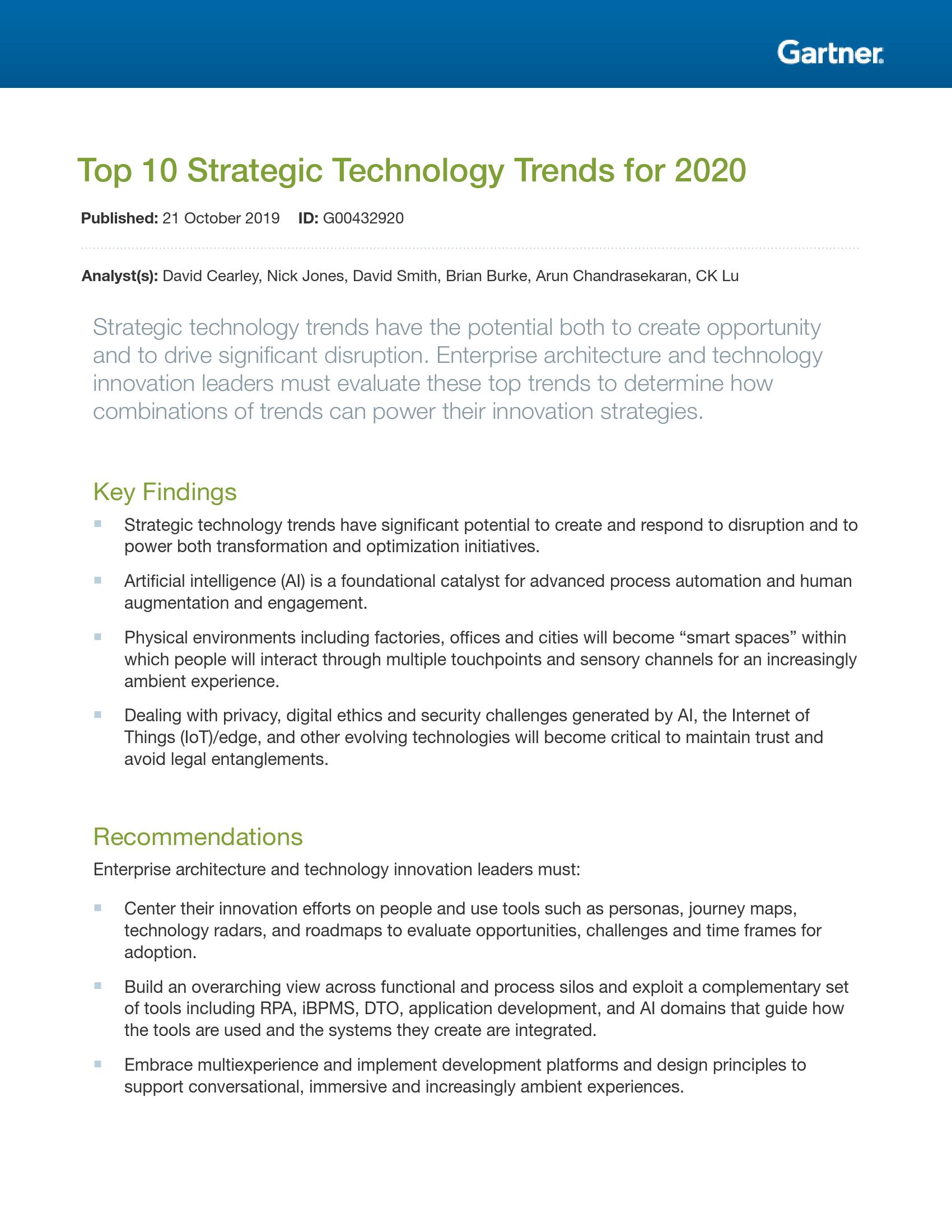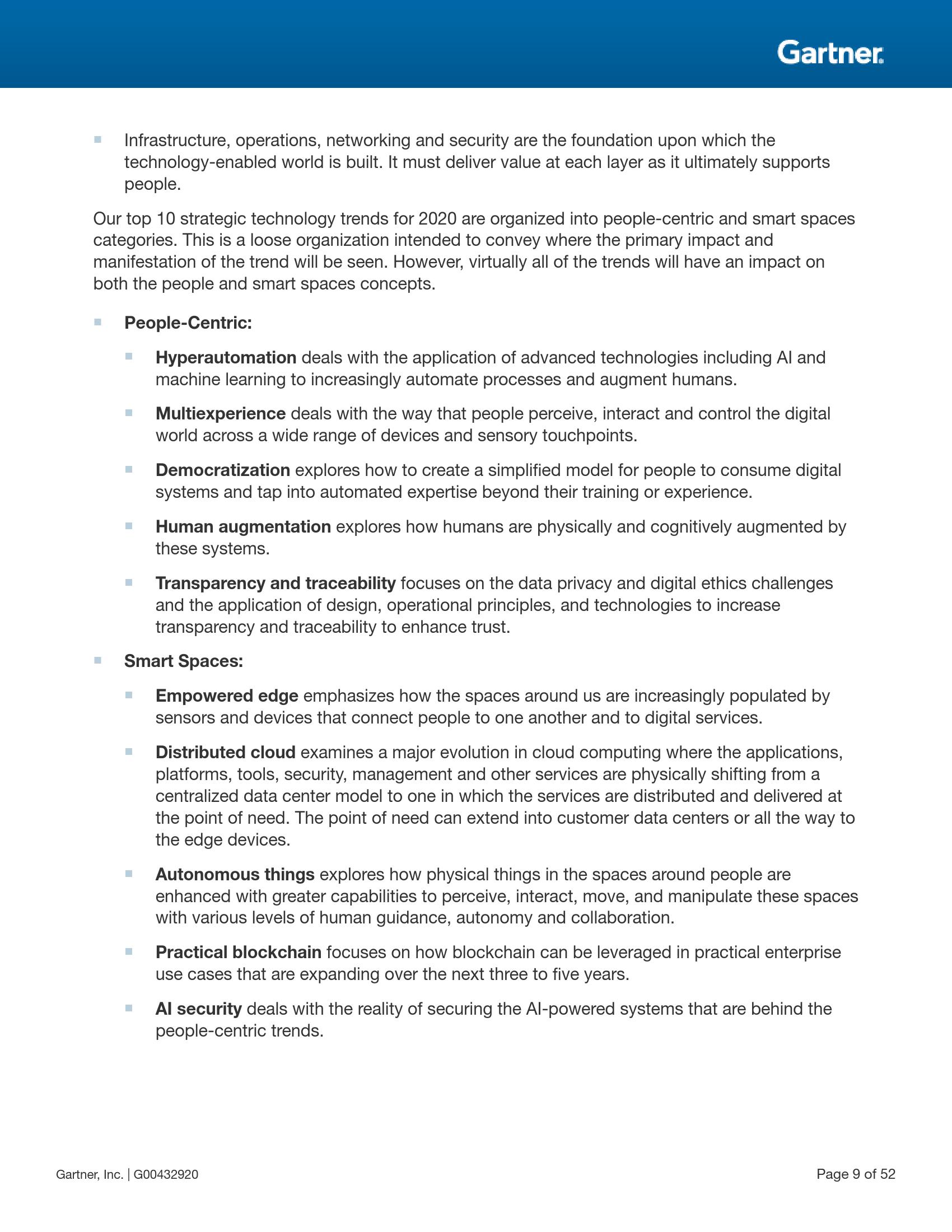 信息技术研究和顾问公司Gartner公布了企业机构在2020年需要研究的重要战略科技发展趋势。Gartner将战略科技发展趋势定义为具有巨大颠覆性潜力、脱离初期阶段且影响范围和用途正不断扩大的战略科技发展趋势;这些趋势在未来五年内迅速增长、高度波动、预计达到临界点。