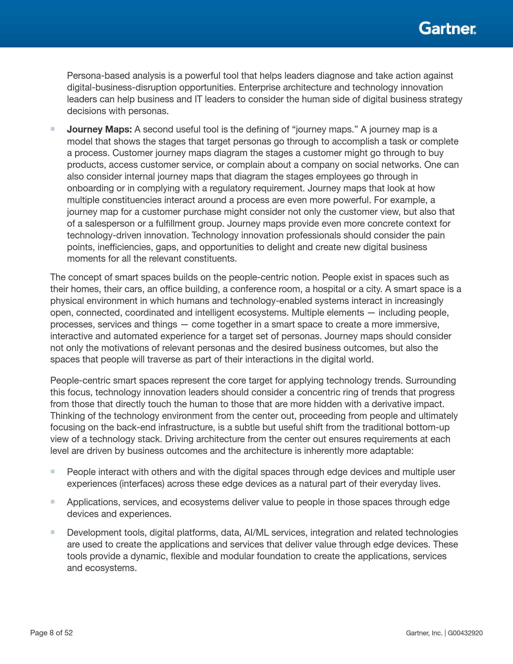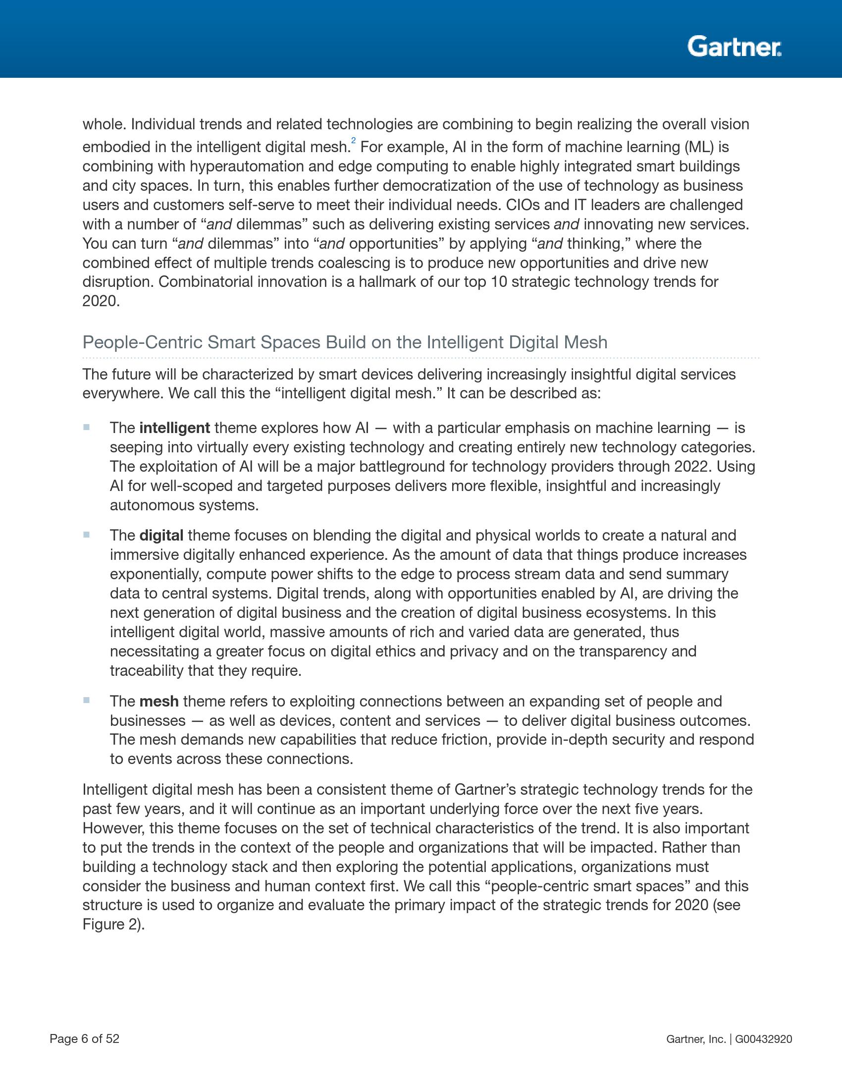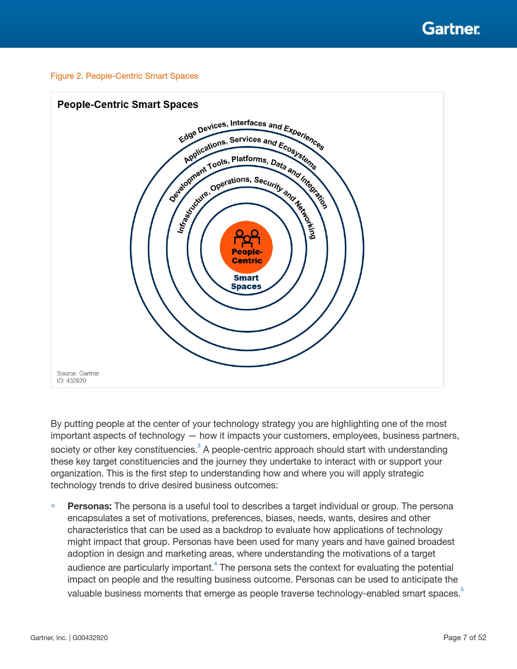 Gartner副总裁兼院士级分析师David Cearley表示:“以人为中心的智能空间(people-centric smart spaces)是用来组织Gartner 2020年重要战略科技发展趋势并评估其带来的主要影响的核心结构。把人作为技术战略的核心强调了技术最重要的作用之一:影响客户、员工、业务合作伙伴、社会或其他关键群体。从某种意义上来讲,企业机构采取的所有行动都是为了直接或间接影响这些个人和群体,这就是‘以人为中心’的方法。”