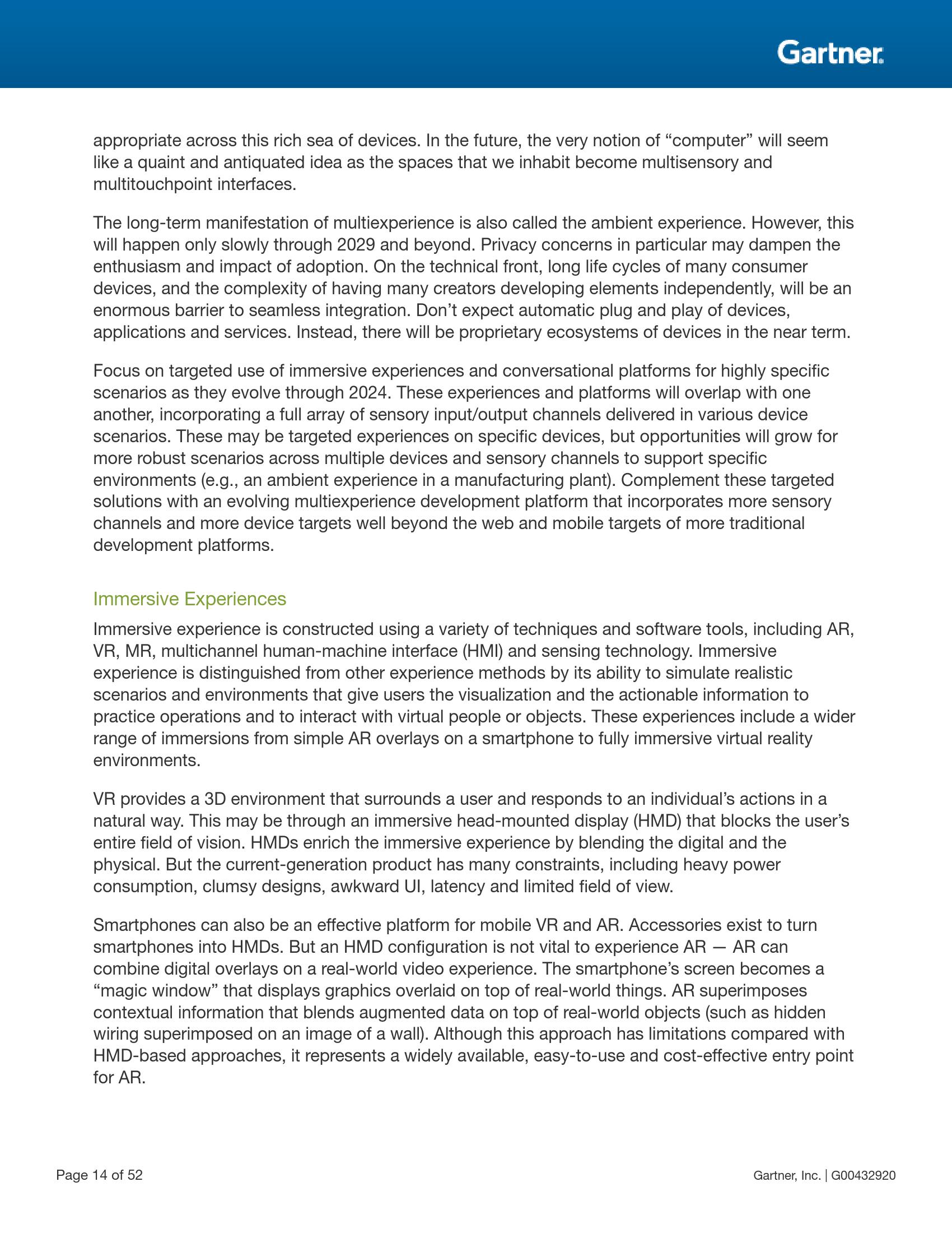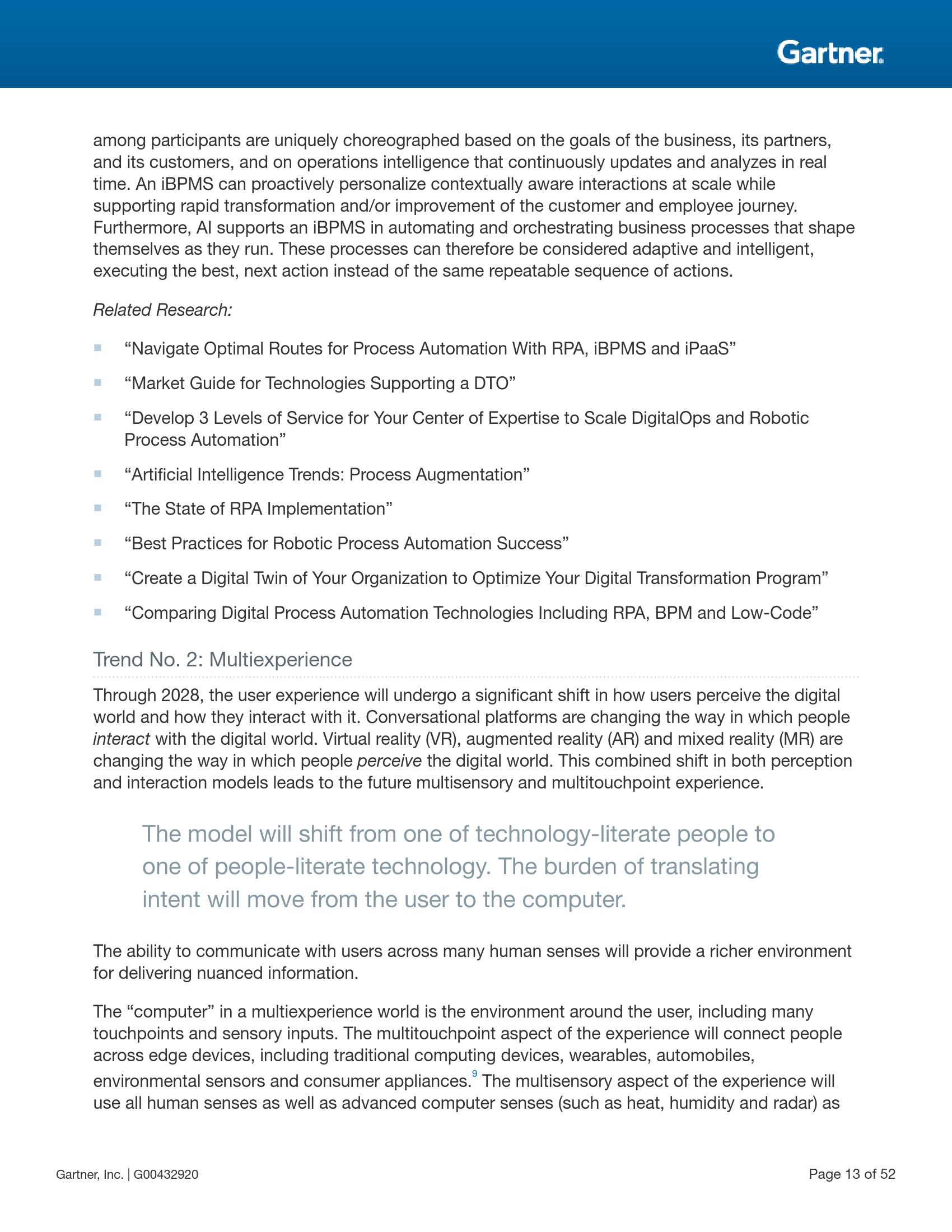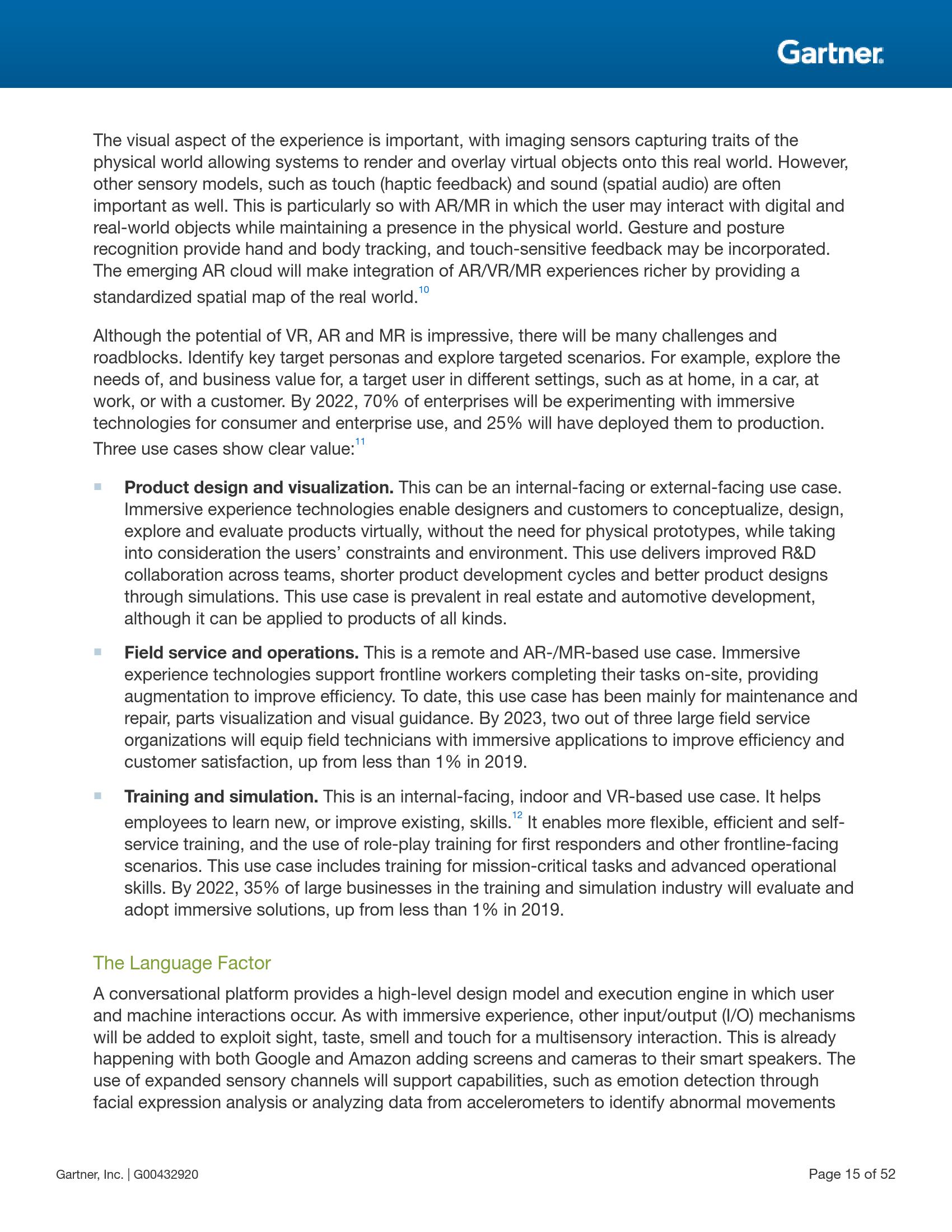 Gartner研究副总裁Brian Burke表示:“这一模式将从‘精通技术的人’转变为‘理解人类的技术’。计算机将代替人类承担人机交互的重担。这种与人类进行多重感官交流的能力将创造一个更丰富的环境,从而能够传递更细致的信息。”