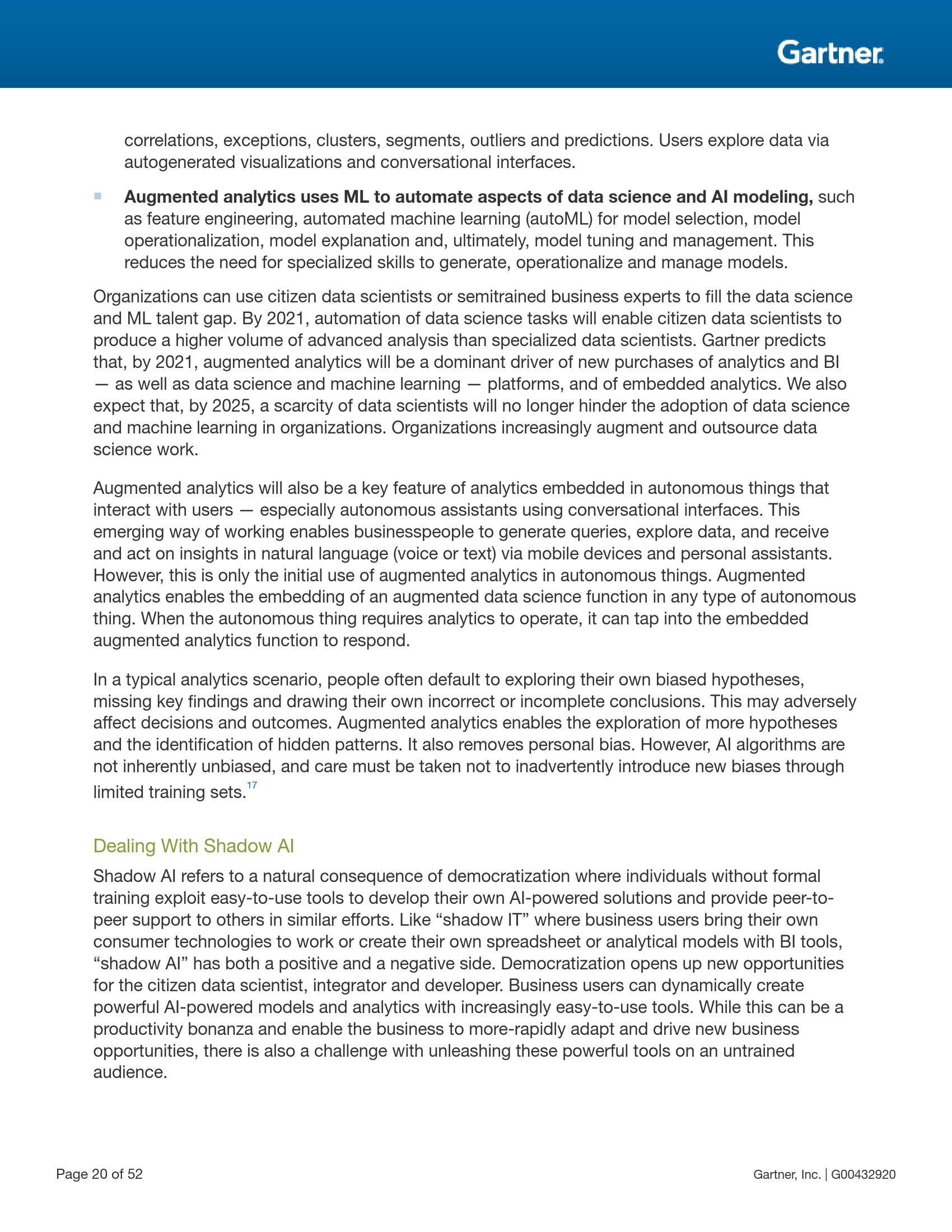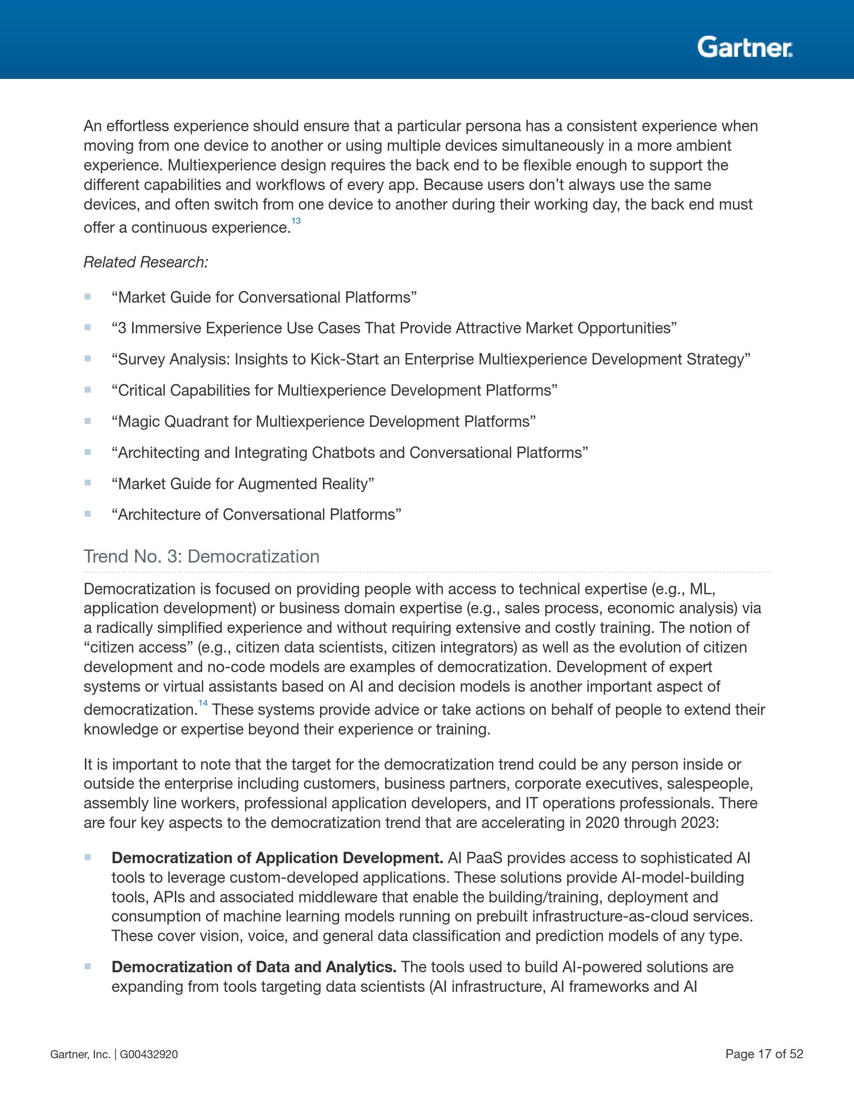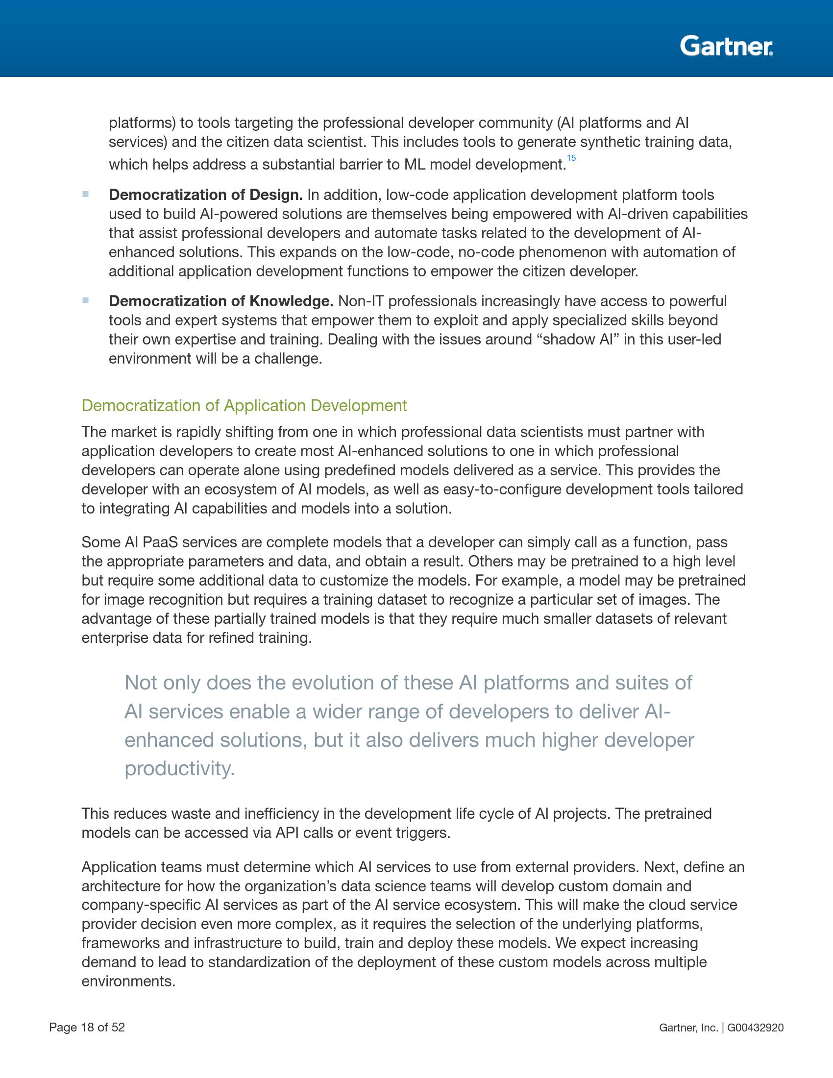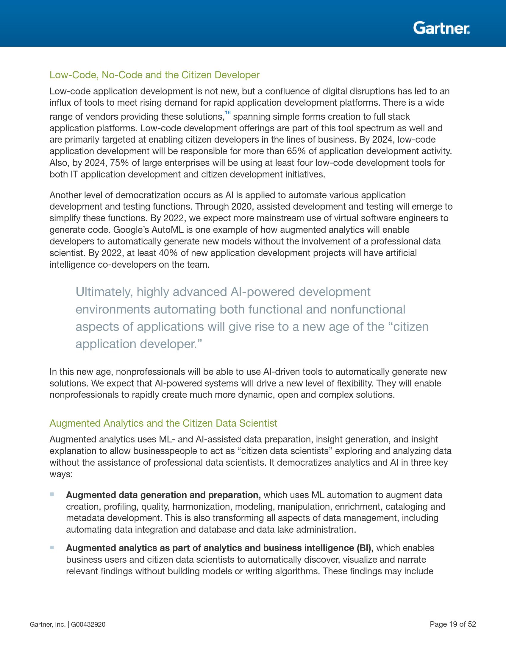 Gartner预测,从现在起到2023年,这一民主化趋势的四个关键方面将加速发展,包括数据和分析的民主化(从针对数据科学家的专用工具扩大到适用于一般开发人员的普及工具)、开发的民主化(自主开发应用程序中使用的人工智能工具)、设计的民主化(低代码、无代码的场景持续增加,更多的应用程序开发功能实现自动化,为公民开发者提供支持)以及知识的民主化(非IT专业人员通过使用工具和专家系统,应用超出自身具备的专业知识和受到的培训以外的专业技能)。