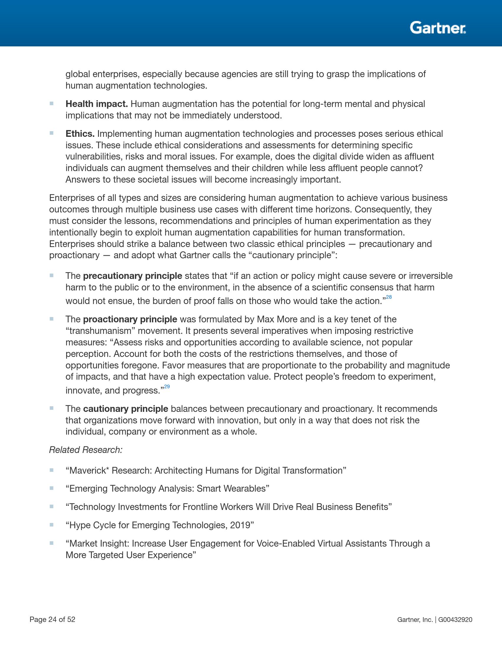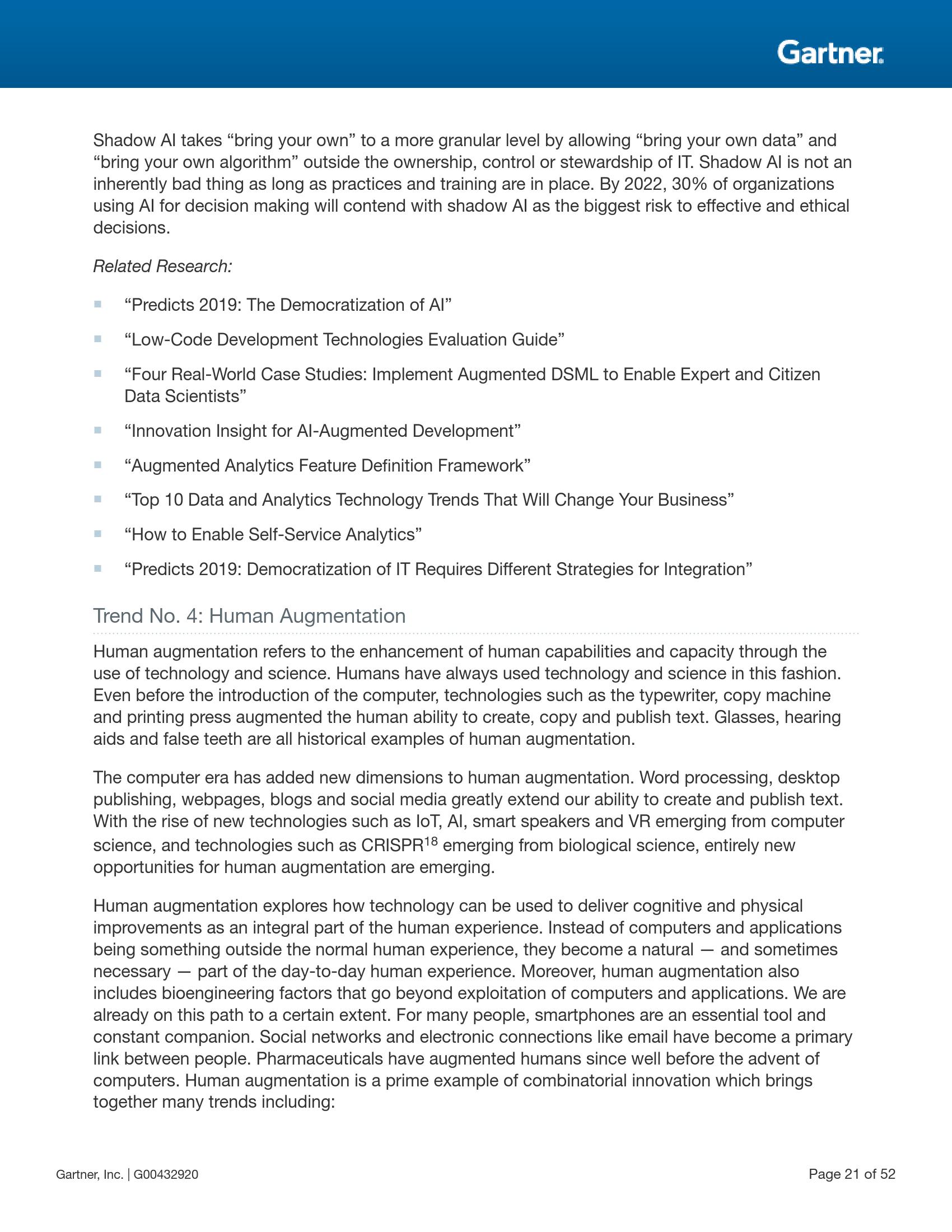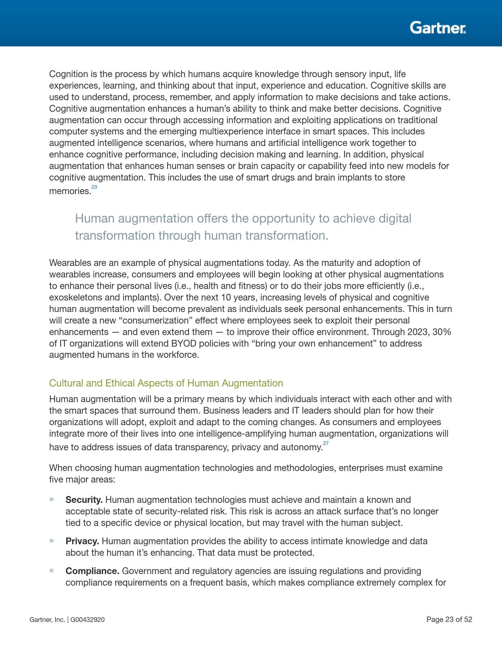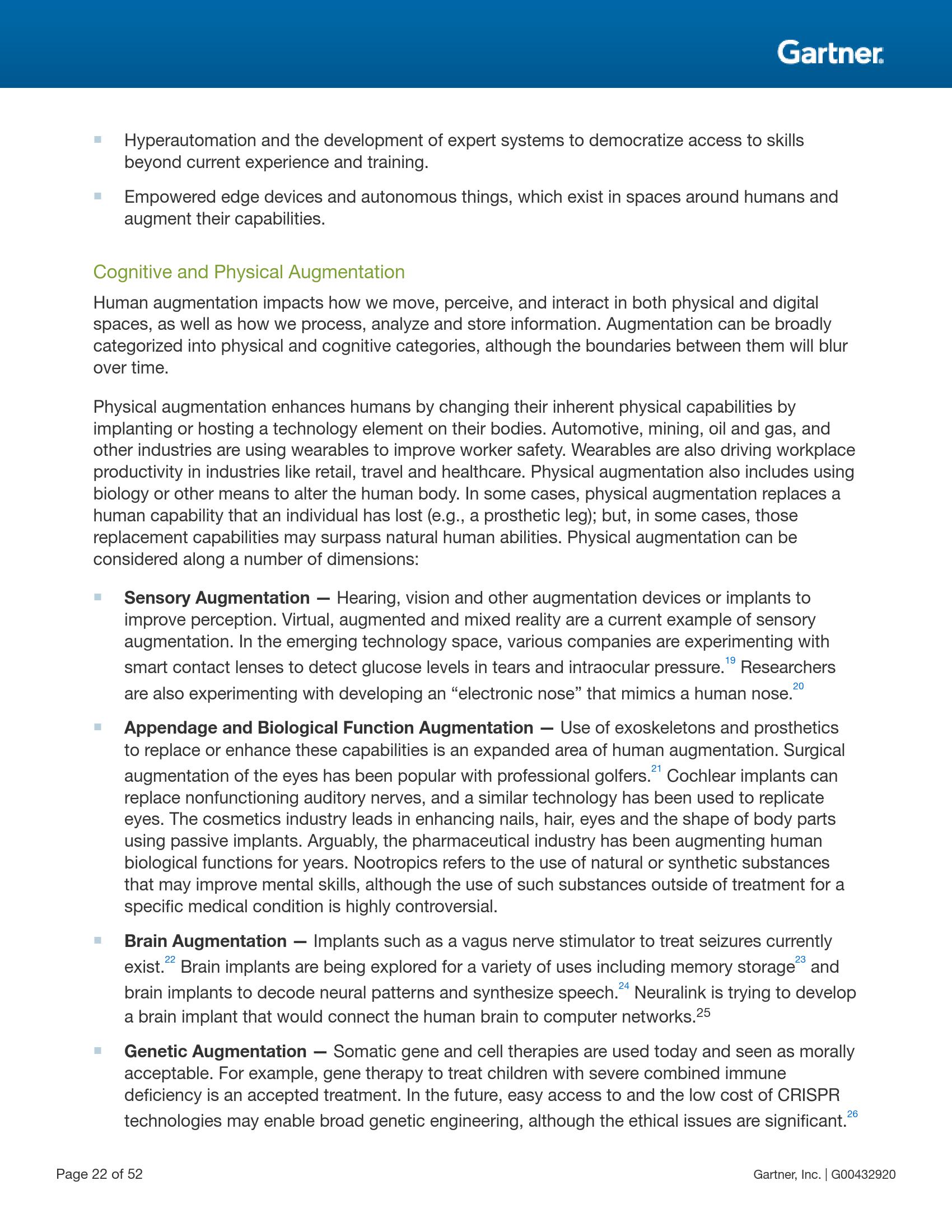 人体机能增强研究如何使用技术提供认知与体能增强并使其成为人类体验中不可或缺的一部分。体能增强通过在人类身体上植入或外置可穿戴设备等技术部件改变人类固有的身体机能,从而实现增强。认知增强则是通过传统的计算机系统和新兴的智能空间中的多体验接口中的信息和应用来实现。在未来十年,由于越来越多的人追求机能增强,人类体能与认知增强技术将会变得越来越普遍。这将产生一种全新的“消费化”效应,员工持续增强自身的机能,并进一步拓展到改进所在的办公环境。