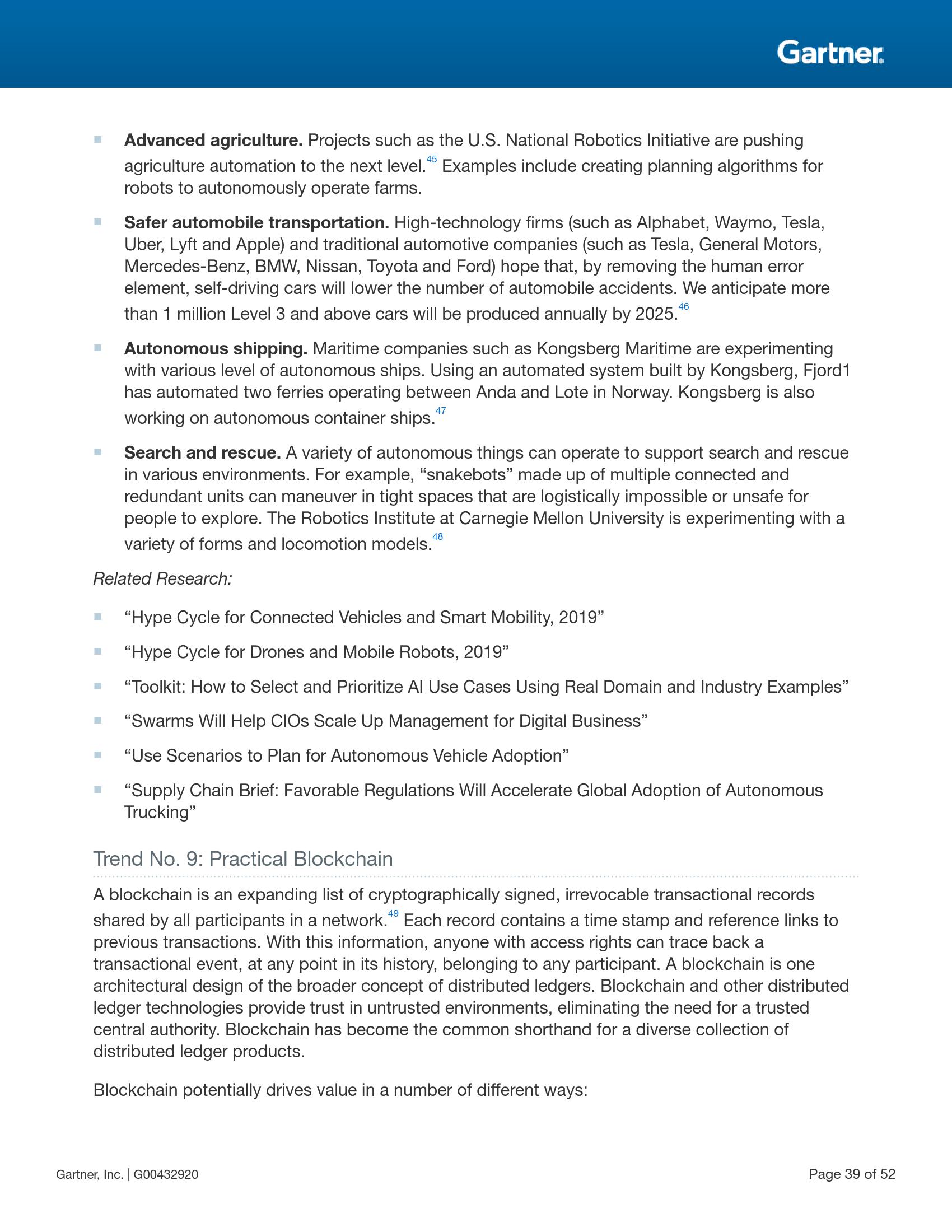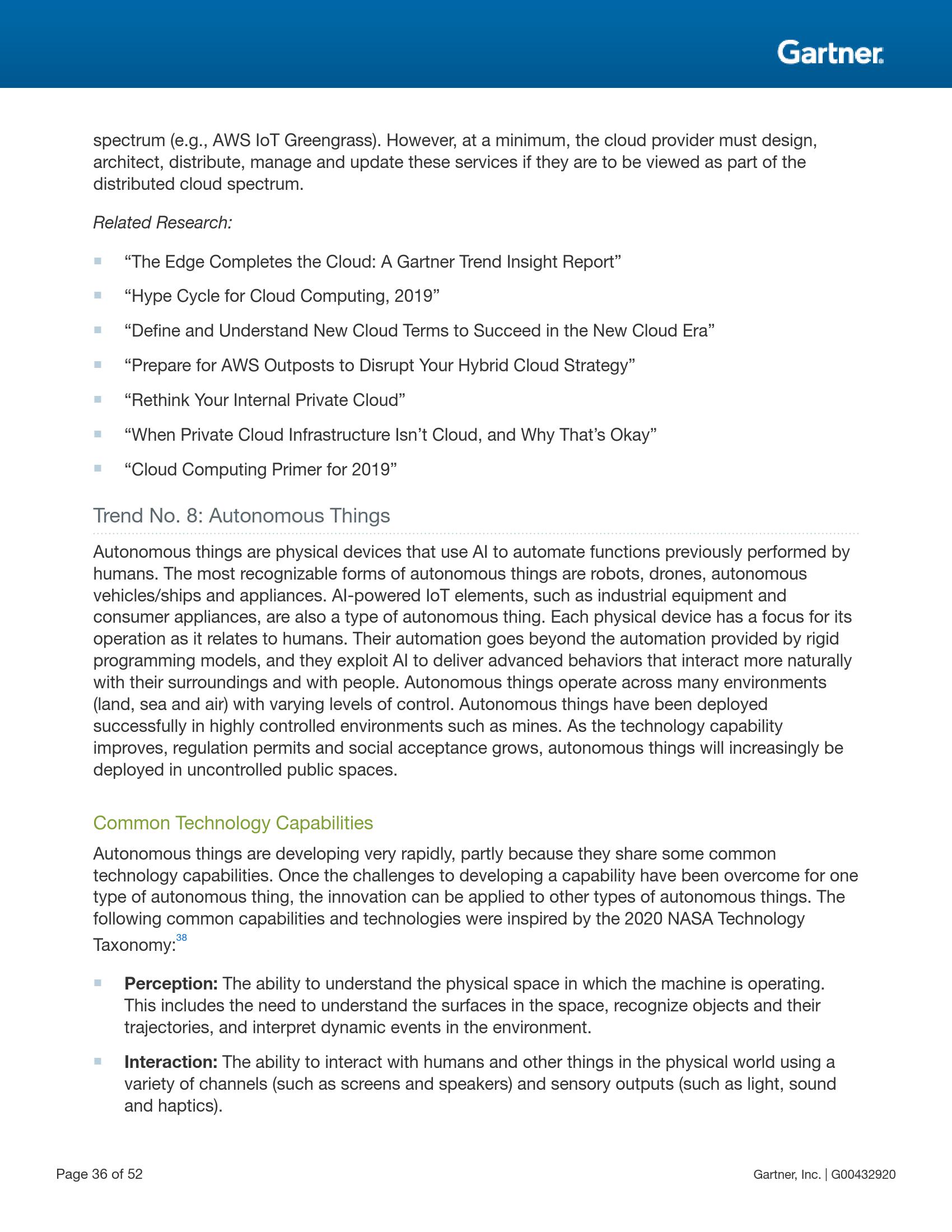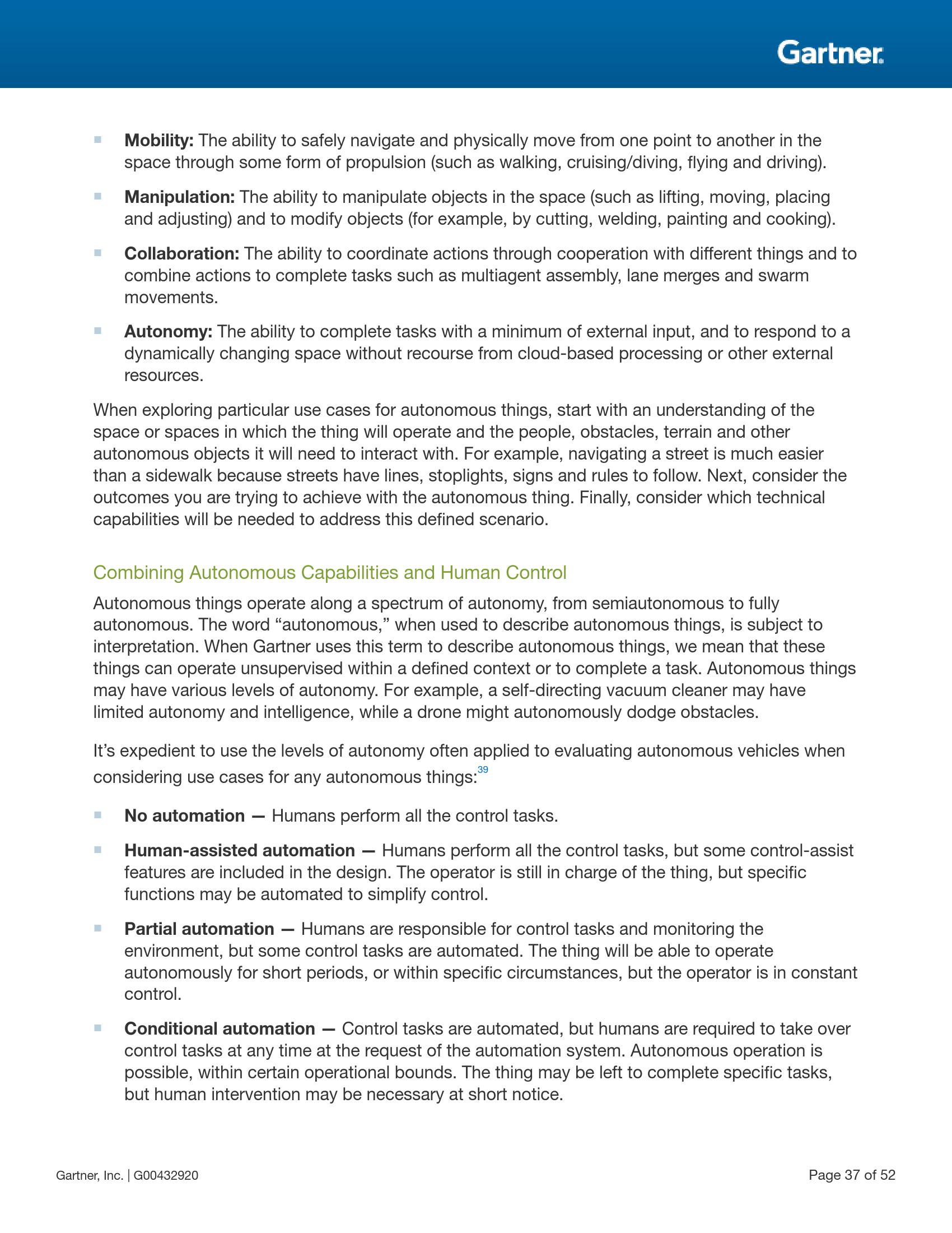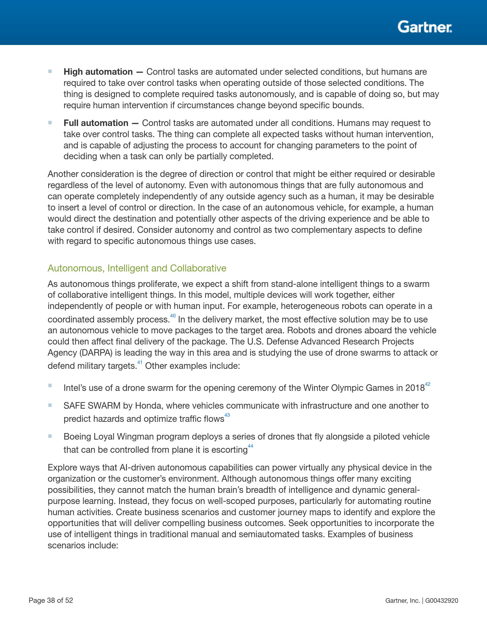 自动化物件是使用人工智能自动执行那些以往被人类执行的任务的物理设备。最典型的自动化物件有机器人、无人机、自动驾驶汽车/船及各种设备。它们的自动化超越了固化的程序所能实现的自动化程度,并能够借助人工智能做出与所在环境和人类进行更自然交互的高级行为。随着技术能力的改进、监管机构的批准以及社会接受度的提高,自动化物件将被越来越多地用于不受限制的公共场所。