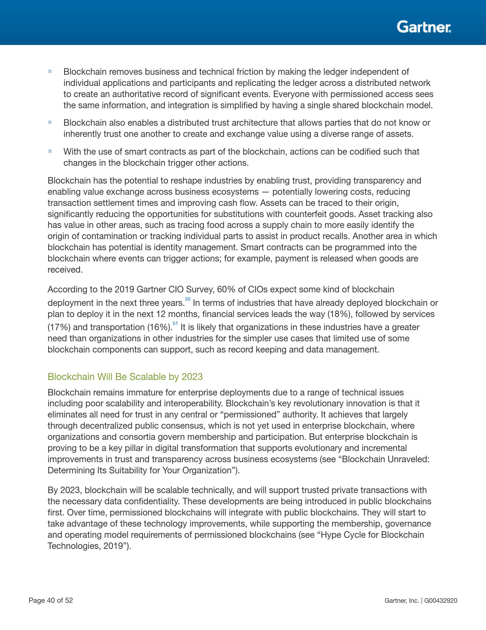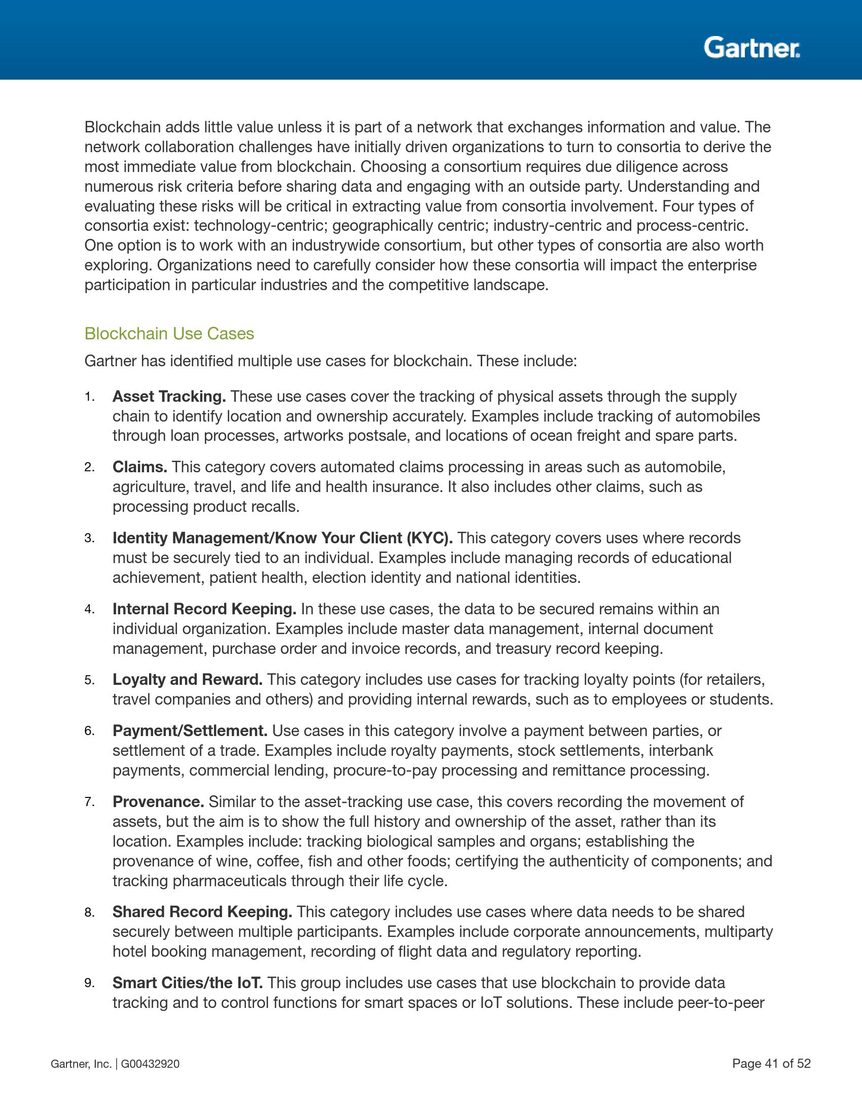 区块链可以通过实现信任、提供跨业务生态透明度和实现跨业务生态价值交换、降低成本、减少交易结算时间及改善现金流来重塑整个行业。由于可以追溯到资产的来源,因此“以次充好”的概率大幅降低。资产追踪对于其他领域也具有很大的价值,包括追踪食物在整条供应链中的足迹以识别污染来源、追踪各零部件以协助产品召回等。区块链还可用于身份管理。区块链中的智能合约可以使系统在事件发生时自动触发行动,例如在收到货物时付款等。