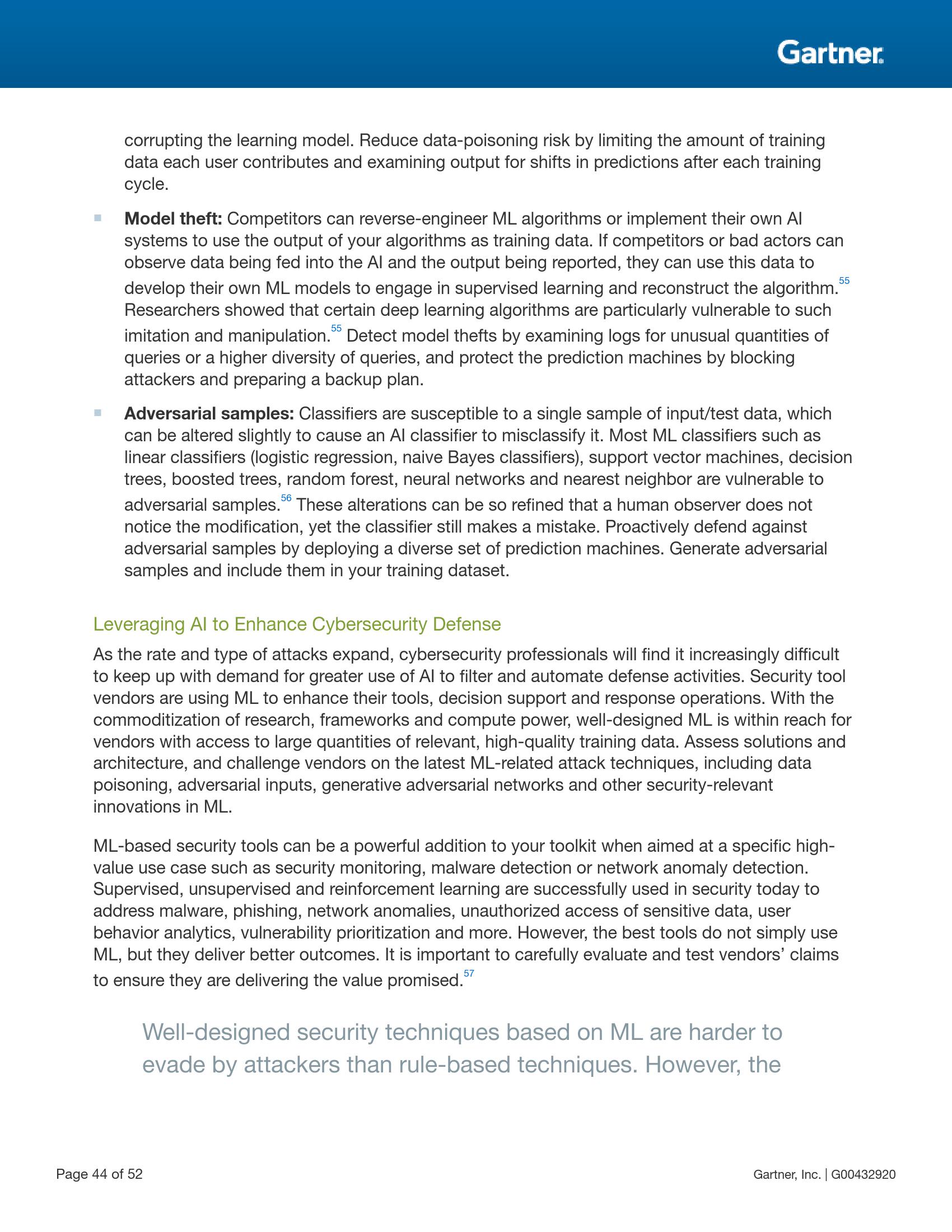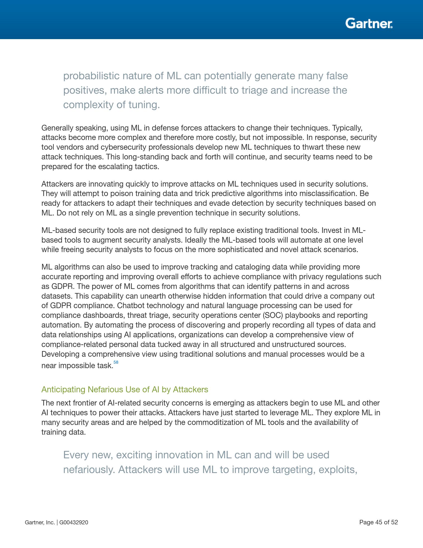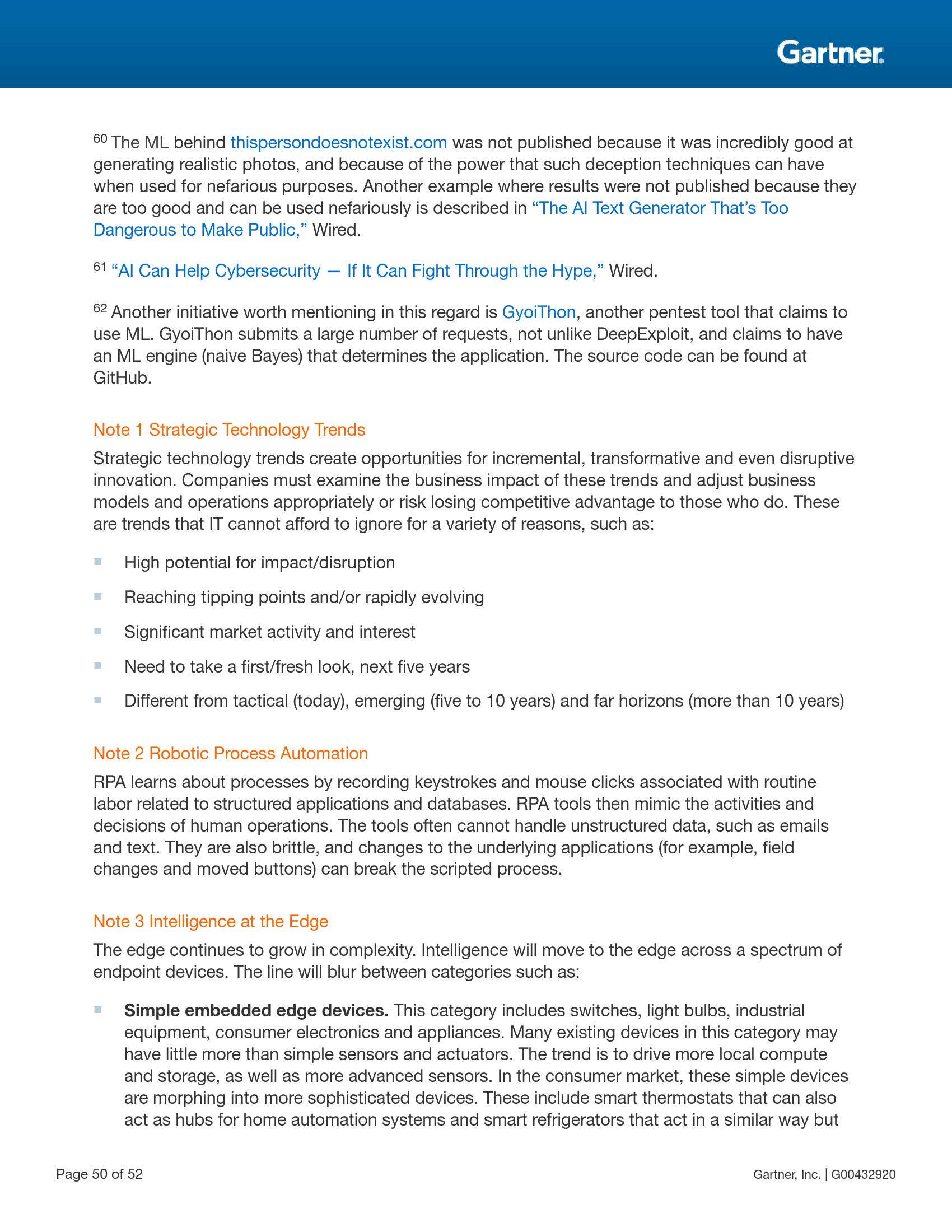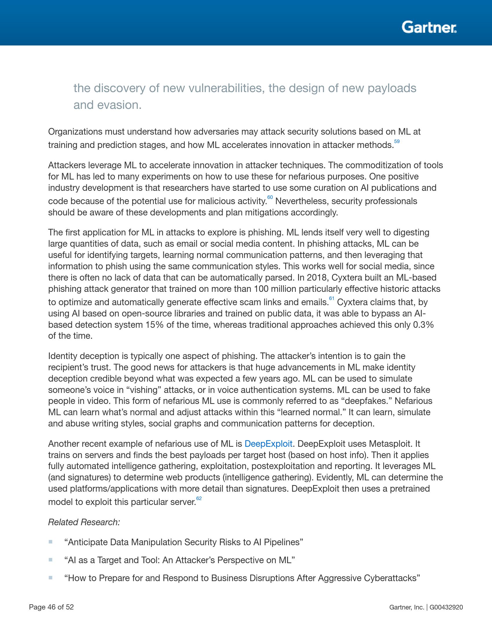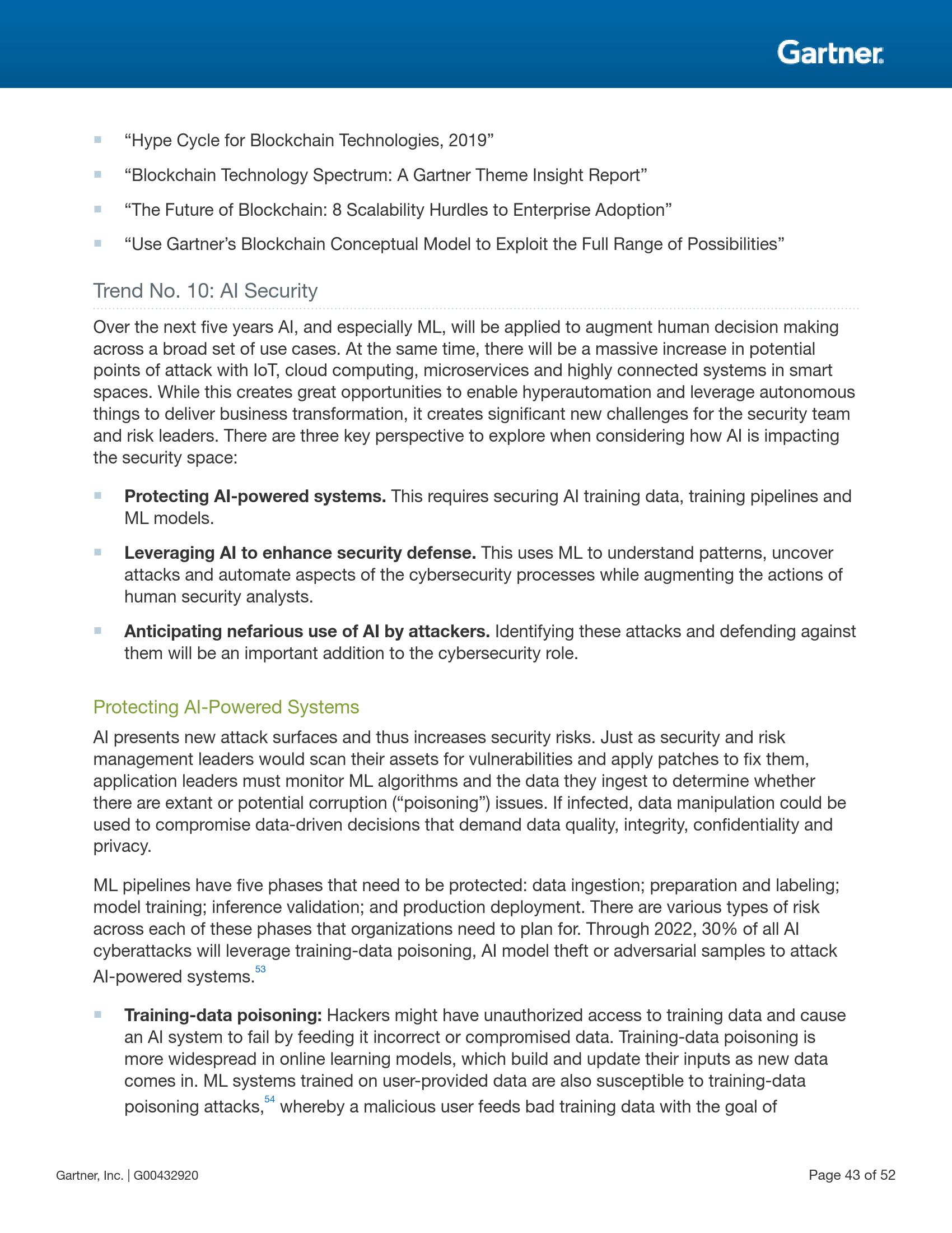 人工智能与机器学习将被继续用于提升各种应用场景中人类决策的能力。虽然这给实现超自动化和使用自动化物件进行业务转型带来了良机,但同时也因为物联网、云计算、微服务(microservices)及智能空间中高度连接的系统增加了大量潜在攻击点而给安全团队与风险领导者带来了新的挑战。安全与风险领导者应专注于三个关键领域——保护人工智能赋能系统、利用人工智能提升安全防御机制以及做好攻击者对人工智能的恶意使用的心理准备。