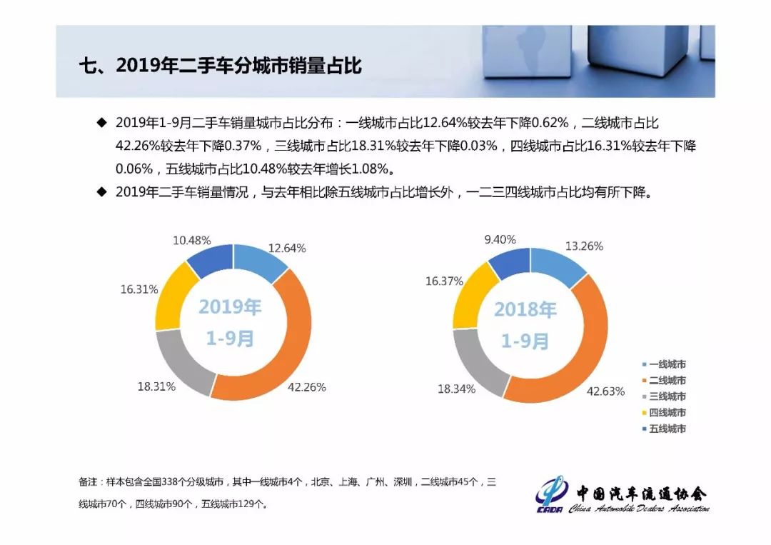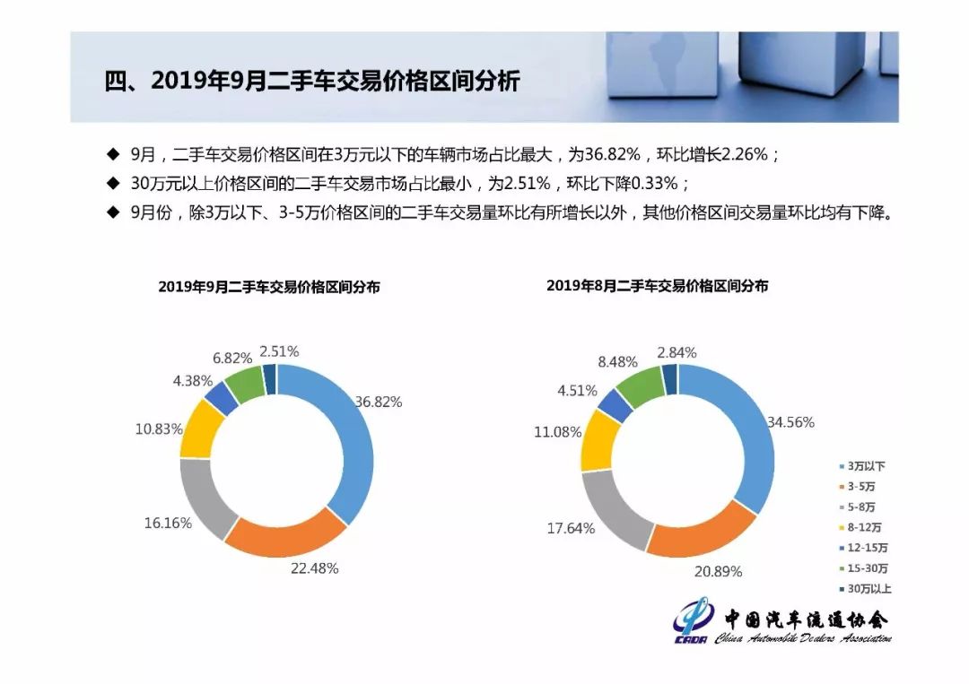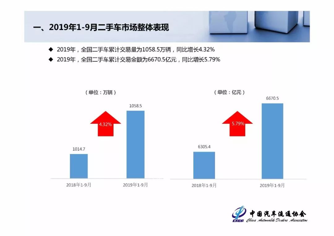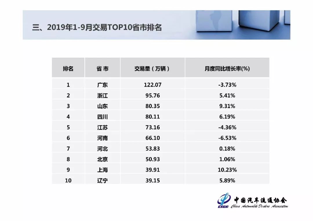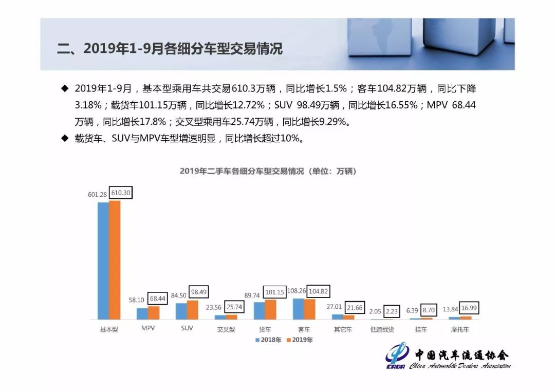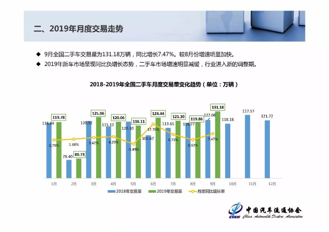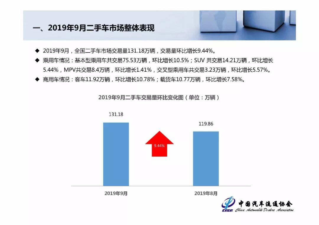 中国汽车流通协会:2019年9月二手车市场详细分析 9月全国二手车交易量为131.18万辆,同比增长7.47%。较8月份增速明显加快。2019年新车市场呈现同比负增长态势,二手车市场增速明显减缓,行业进入新的调整期。 更多阅读:中国汽车流通协会:2021年1月全国二手车市场深度分析中国汽车流通协会:2022年2月全国二手车市场深度分析中国汽车流通协会:2022年3月全国二手车市场深度分析中国汽车流通协会:2022年3月全国二手车市场深度分析中国汽车流通协会:二手车市场走势特征分析中国汽车流通协会: 2021年9月二手车市场简析中国汽车流通协会:2022年9月全国二手车市场深度分析中国汽车流通协会:2020年4月二手车市场深度分析中国汽车流通协会:2019年二手车市场概况及形式分析【上】中国汽车流通协会:2020年3月份国内狭义乘用车市场销量达104.5万辆 同比下降40.4%中国汽车流通协会:2019年2月全国二手车市场分析中国汽车流通协会:2023年9月二手车市场简析中国汽车流通协会:2023年7月全国二手车市场深度分析中国汽车流通协会:2023年8月全国二手车市场深度分析中国汽车流通协会:2023年6月二手车市场简析