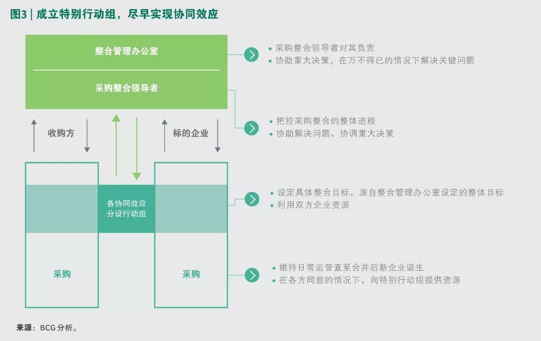 在交易完成前就为协同做好准备,提前开启整合进程。建立包括采购专家在内的盘点小组,有针对性地对每一类协同进行分析。
