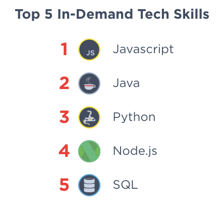 招聘单位对工程师的技术技能要求Top 5显示,Javascript、Java、Python、Node.js 以及 SQL 成为求职人员必备的5大技术能力。
