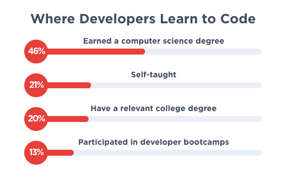根据《2019 年软件工程师状况报告》,伦敦46%的开发者们是获得计算机科学学位的方式学习,剩下的是通过自学成才(21%)、拥有相关大学文凭(20%)以及培训机构(13%)。