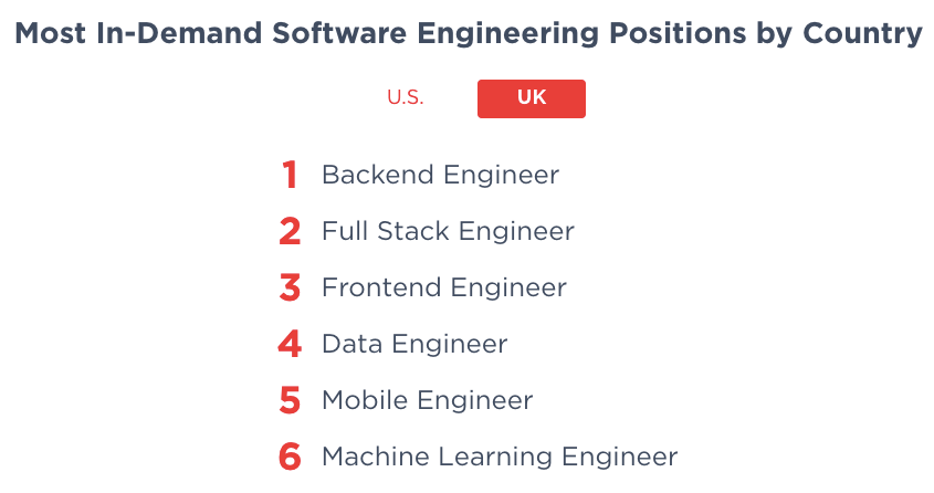 英国最受欢迎的软件工程职位Top 6:后端工程师、全栈工程师、前端工程师、数据工程师、移动工程师、机器学习工程师。